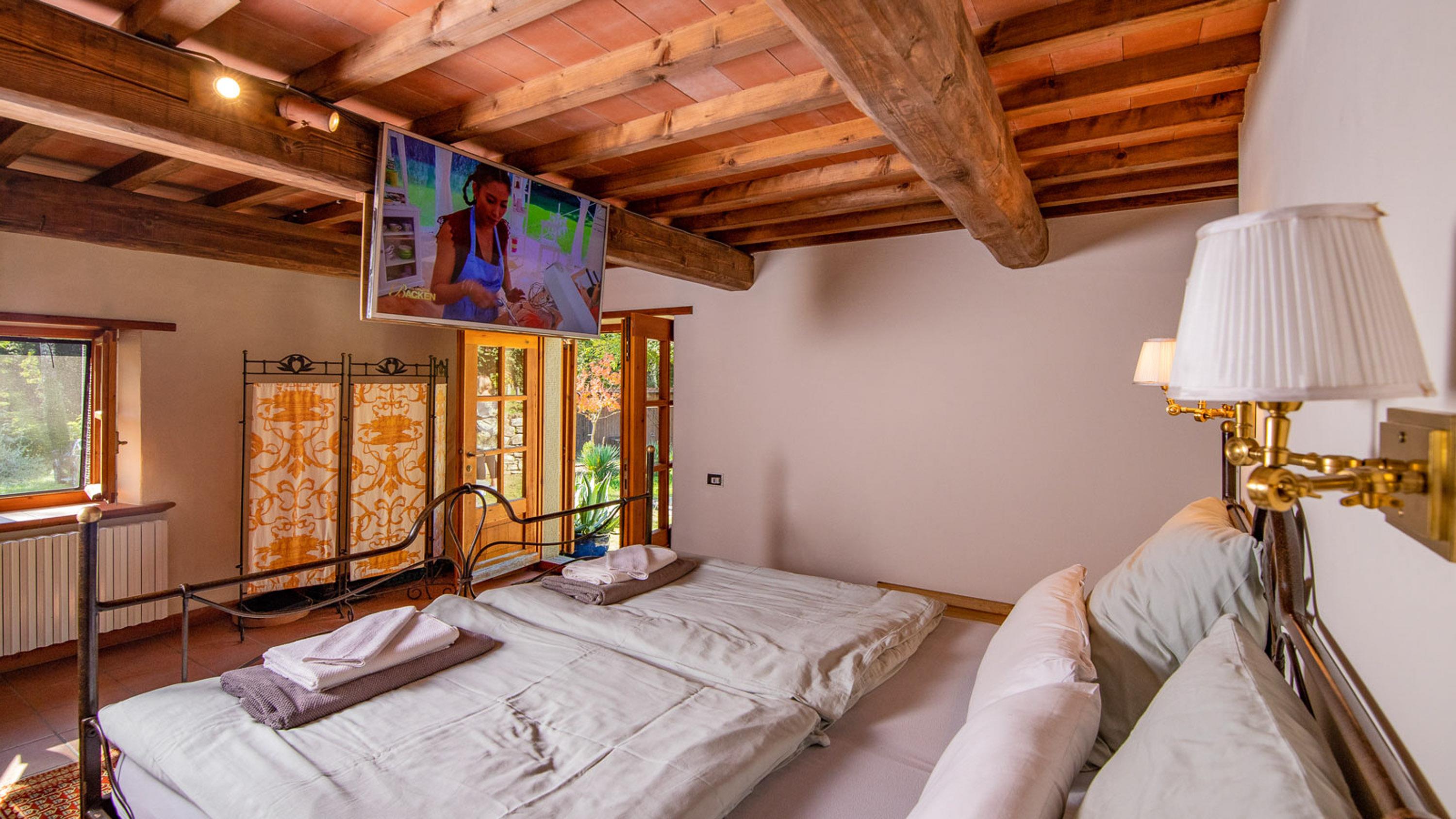 Mit einer Wohnfläche von 120 qm auf zwei Etagen bietet die liebevoll restaurierte Mühle Platz für bis zu vier Personen. Im Erdgeschoss erwartet Sie ein stilvolles Schlafzimmer mit einem gemütlichen Doppelbett (180x200), einem TV und direktem Zugang zum malerischen Garten. Das Obergeschoss beherbergt ein weiteres komfortables Schlafzimmer, ebenfalls mit Doppelbett (180x200) und TV, sowie ein großzügiges Badezimmer mit Badewanne, Dusche, Waschtisch und WC – perfekt für entspannte Momente zu jeder Tageszeit.
