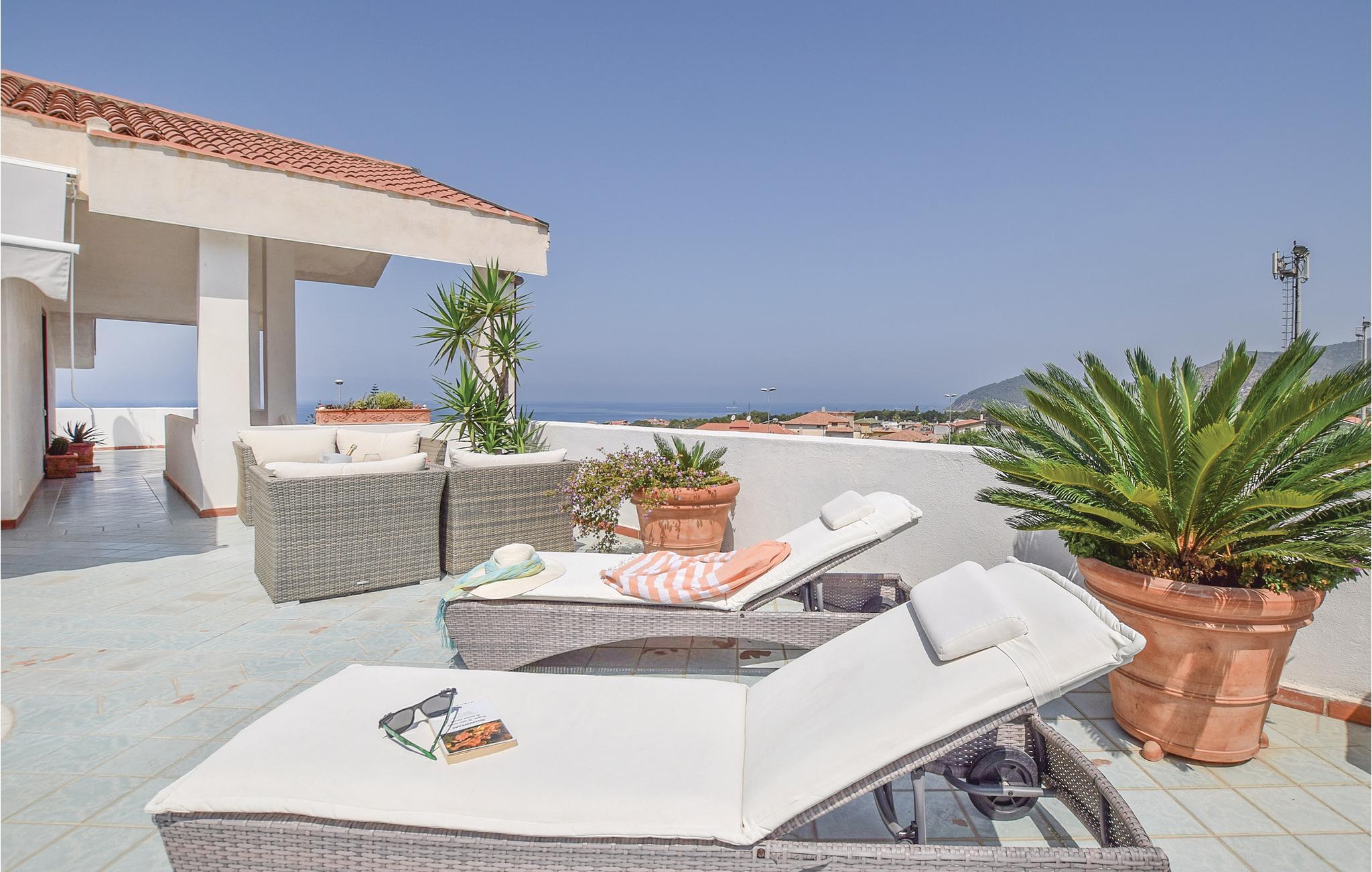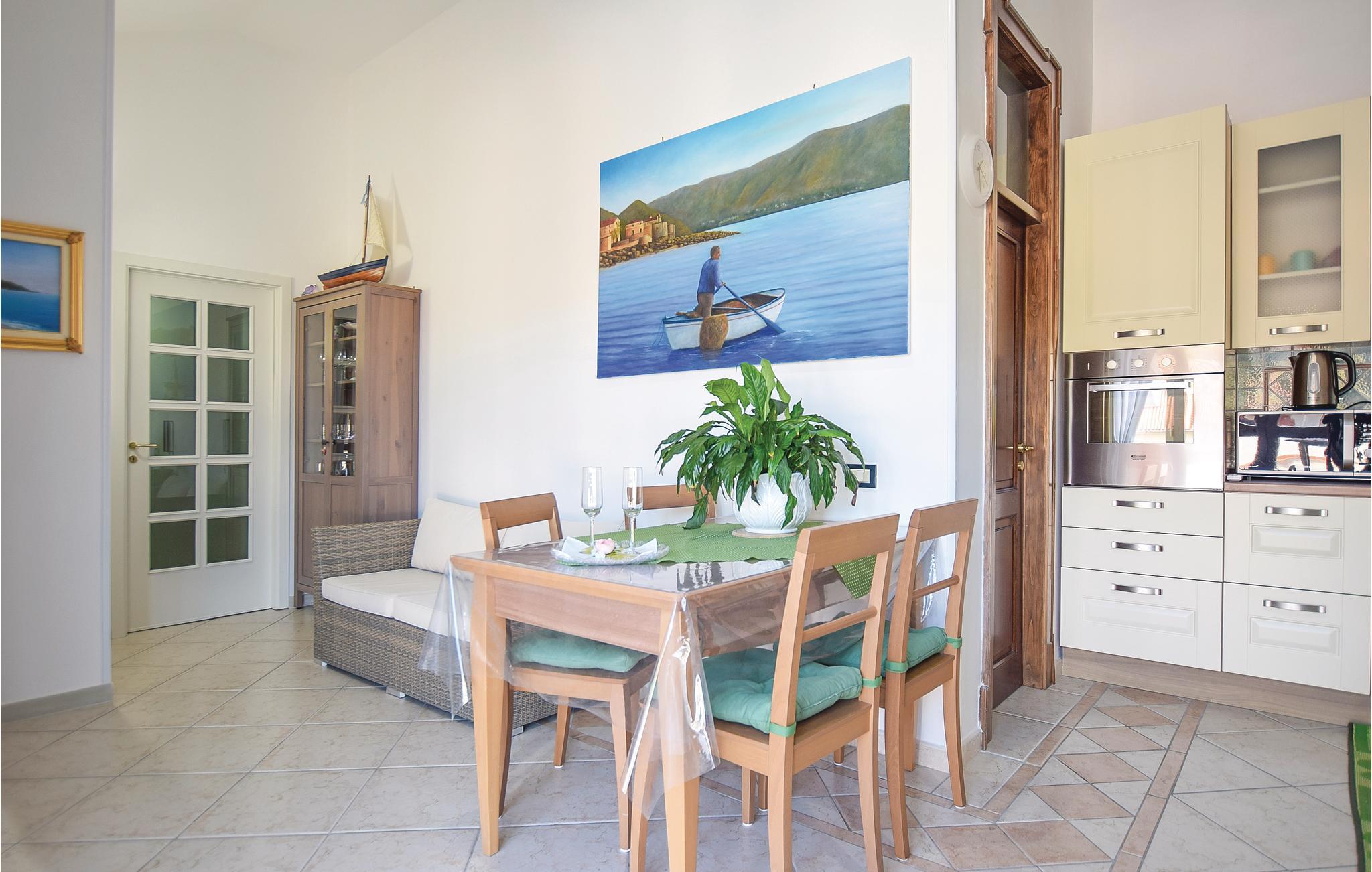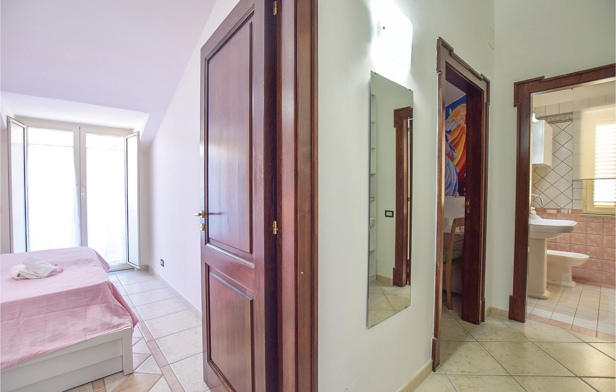 Ferielejlighed i et tofamilies hus i S. Marco di Castellabate, kun 500 m fra de den skønne strand, med herlig panoramaterrasse og en balkon, der går hele vejen omkring huset. Det tager kun 10 minutter at gå til fodgængerzonen i Maria di Castellabate hvor der er mange butikker og barer. Den lille by er kendt for sine mange strande, nogle er gratis og andre med adgang mod betaling, for to promenader og for et stort udvalg af restauranter hvor I kan smage typiske Cilento-speicaliteter. Der er tre km til middelalderbyen Castellabate, der er med på Unescos kulturarvsliste. Besøg også Agropoli (15 km) og Paestum (20 km) med græsk-romerske templer. Lejligheden ligger på anden sal, med enkelte rum med skrå vægge, fra den ene side udsigt til vejen.