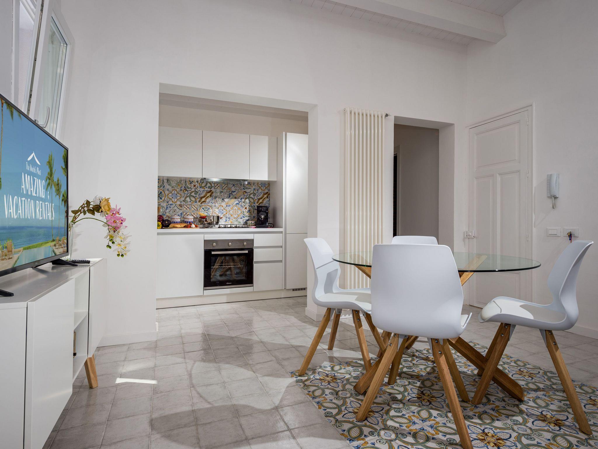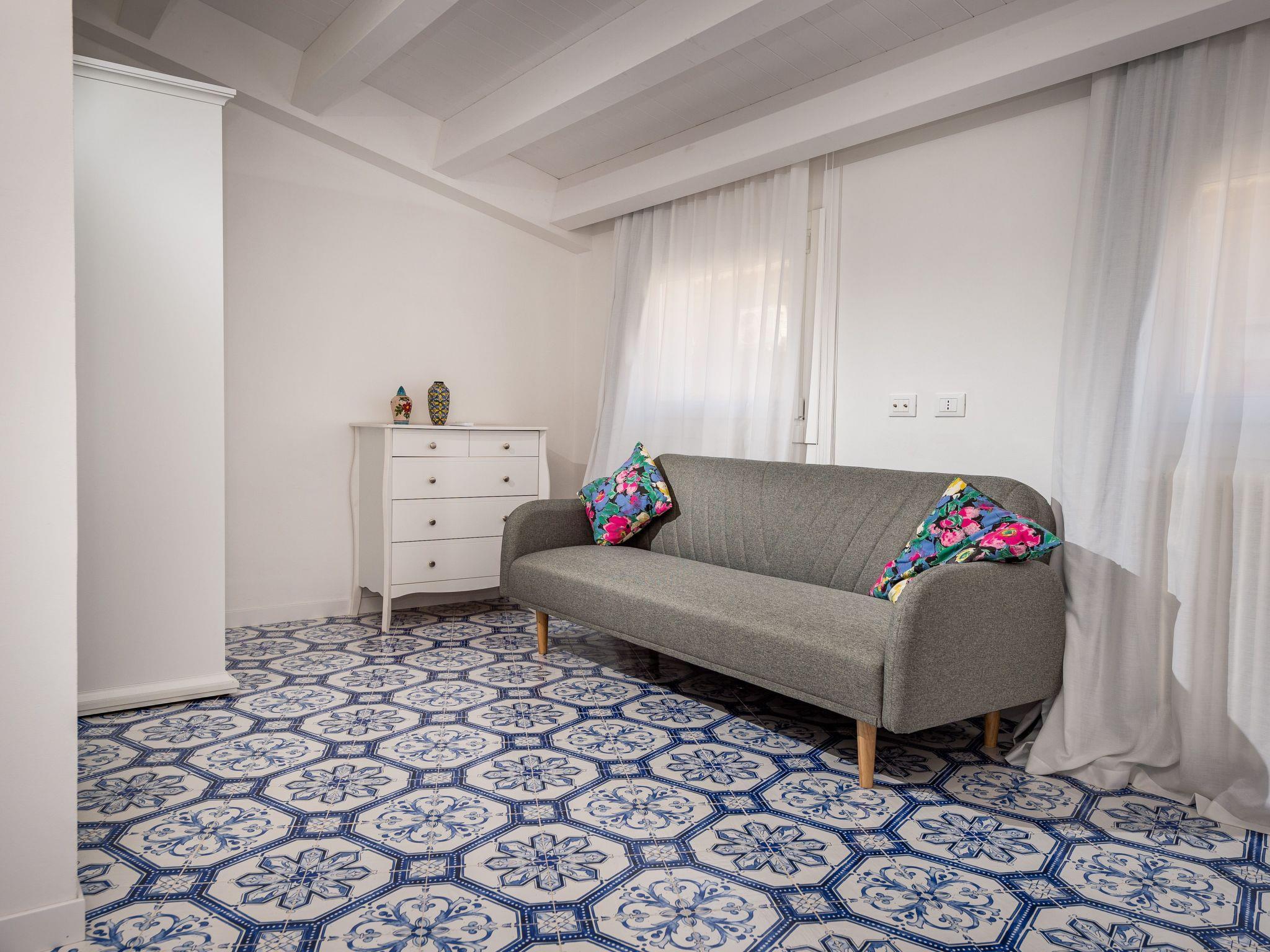 It is located on the second floor, the entrance immediately leads into the kitchen-living room composed of, sofa, glass table, smart TV, kitchen complete with utensils and appliances. To the right of the entrance through a corridor we go in Room 1 (a double bed and a sofa bed) always in the corridor we find the first bathroom belonging to the room. Always starting from the entrance on the left we find room 2 (a double bed and a sofa bed) also with en-suite bathroom. All the rooms have air conditioning. To access from the terrace you pass through the door into the living room, there you will find a table with chairs, a grill, and an outdoor sink.