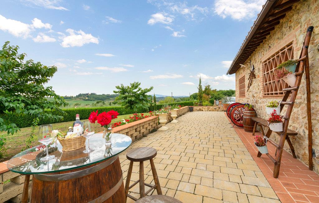 Feriehus, der er indrettet i en oprindelig landbrugsbygning, 3 km fra Poggibonsi. Da ejendommen blev renoveret, skete det under hensyntagen til den oprindelige arkitektur, som er typisk for Chiantiområdet, omgivet af vinbjerge og olivenlunde og med en 360° udsigt. Her kan I opholde jer helt ugenert. Huset, fuld af karakter og smagfuldt indrettet ude som inde, er omgivet af en stor indhegnet plæne. Atmosfæren i dette klassiske toskanske landshus, har gjort dette område berømt verden over. De lyse rum, møbler af høj kvalitet, de saftiggrønne plæner, legepladsen, loungeområdet og en terrasse til måltider i det fri, giver de bedste betingelser til en afslappet ferie i rolige omgivelser. Hvis I kan løsrive jer fra jeres paradis, så besøg kunstbyer som Siena (30 km), San Gimignano (15 km) og Firenze (50 km) der tilhører regionen Chianti Classico: kendt over hele verden for sin skønhed, kunst, kultur, gode mad, vine og førsteklasses olier.