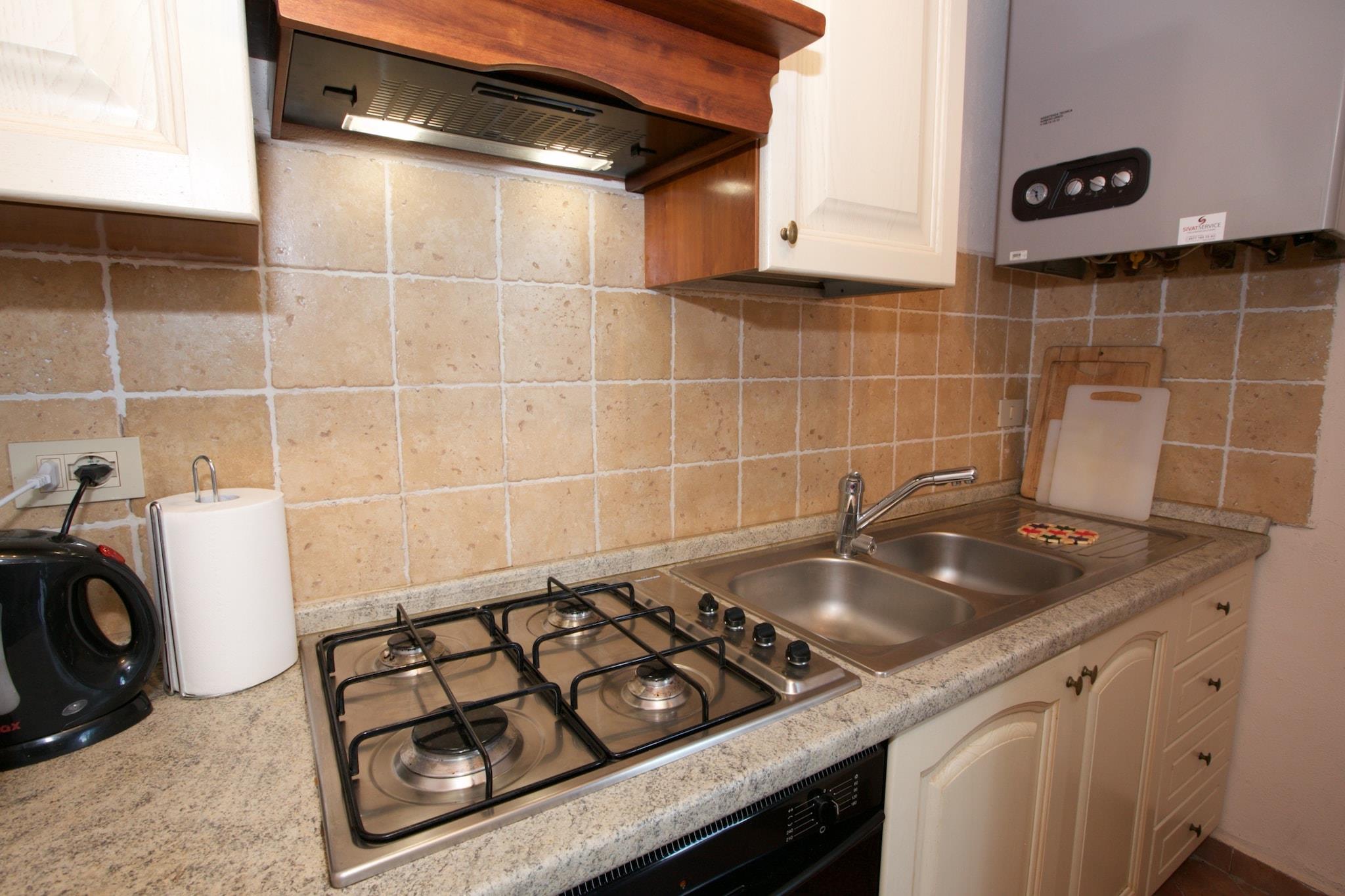 Stueetage: (Stue(enkeltsovesofa, Fjernsyn), åbent køkken(spisebord, kaffemaskine, ovn), soveværelse(dobbeltseng), soveværelse(2x enkeltseng), soveværelse(2x enkeltseng), badeværelse(badekar med bruser, håndvask, toilet, bidet), badeværelse(bruser, håndvask, toilet), badeværelse(bruser, håndvask, toilet)) brændekomfur, varme(central), klimaanlæg, have(deles med andre gæster), havemøbler, grill, parkering, swimmingpool(deles med andre gæster, 14 x 5 m., opened from 1/2 May upto and including Sep), legeredskaber