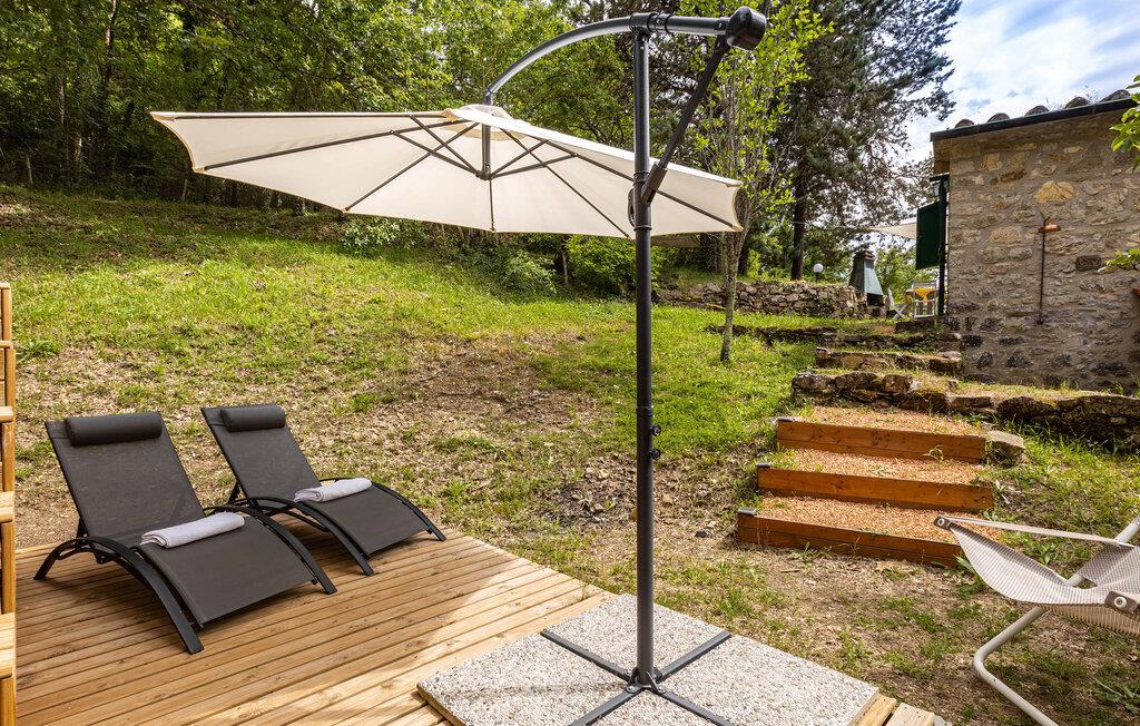 Efter at have snuppet en frisk dukkert i poolen, kan I benytte lejligheden til at slappe af på liggestolene og nyde solen. Eller tilbring tid i den hyggelige opholdsstue, som er udstyret med rustikke træmøbler og byder på en varm atmosfære. Slap af i hængekøjen i haven eller nyd en kop kaffe på verandaen med udsigt over bjergene. Forkæl jer selv med en stille gåtur gennem jeres charmerende ferieområde.
