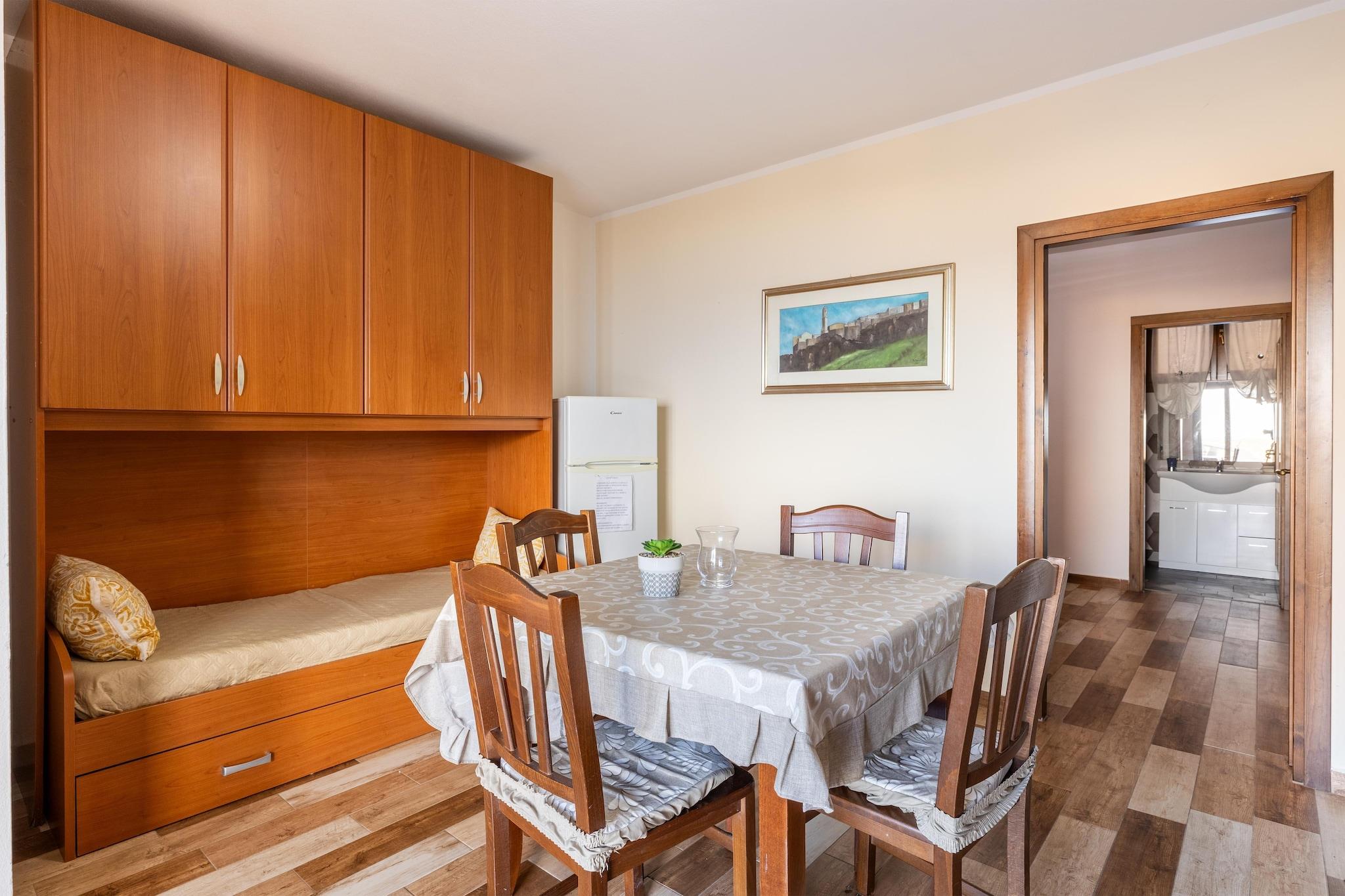 Beliggende i den fredelige kystlandsby Lu Bagnu tilbyder denne indbydende lejlighed i stueetagen komfort, enkelhed og en smuk følelse af sardinsk ro. Som en del af en uafhængig villa med panoramaudsigt nyder den en dejlig udsigt over Asinara-bugten og en rolig, privat atmosfære, der er perfekt til et afslappende ophold med familie eller venner. Indvendigt er lejligheden omhyggeligt designet til op til fire gæster. Den hyggelige opholds- og spisestue har en komfortabel dobbeltsovesofa og et tv til afslappende aftener, mens det åbne køkken med kogeplader og mikrobølgeovn giver dig mulighed for at tilberede måltider i dit eget tempo. Soveværelset med en dobbeltseng tilbyder en god nats søvn, og badeværelset har et brusebad og en vaskemaskine for ekstra bekvemmelighed. Gå udenfor til den lille private veranda, et ideelt sted at nyde din morgenkaffe eller slappe af efter en dag på stranden. En privat parkeringsplads er tilgængelig lige foran boligen, hvilket gør enhver udflugt nem og stressfri. Kystlinjen, sandstrandene, supermarkederne og restauranterne i Lu Bagnu og Castelsardo ligger alle kun en kort køretur væk. Gå en tur gennem middelalderbyen Castelsardo, udforsk skjulte bugter, eller nyd blot solnedgangen over bugten. Denne lejlighed tilbyder en charmerende base for en autentisk og afslappende sardinsk ferie.