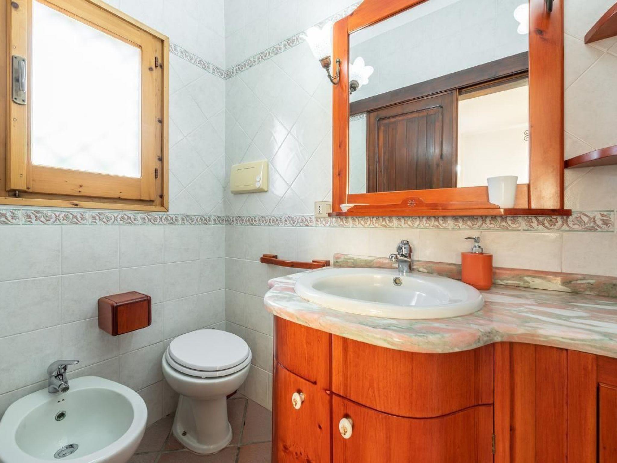 A) Sleeping area consisting of 1 double bedroom overlooking the Golfo degli Angeli, with full master bathroom, 2 rooms (one with sea view and one with hill view) both with two beds. For these two rooms there is a large shared bathroom with two sinks, WC, bidet and shower;