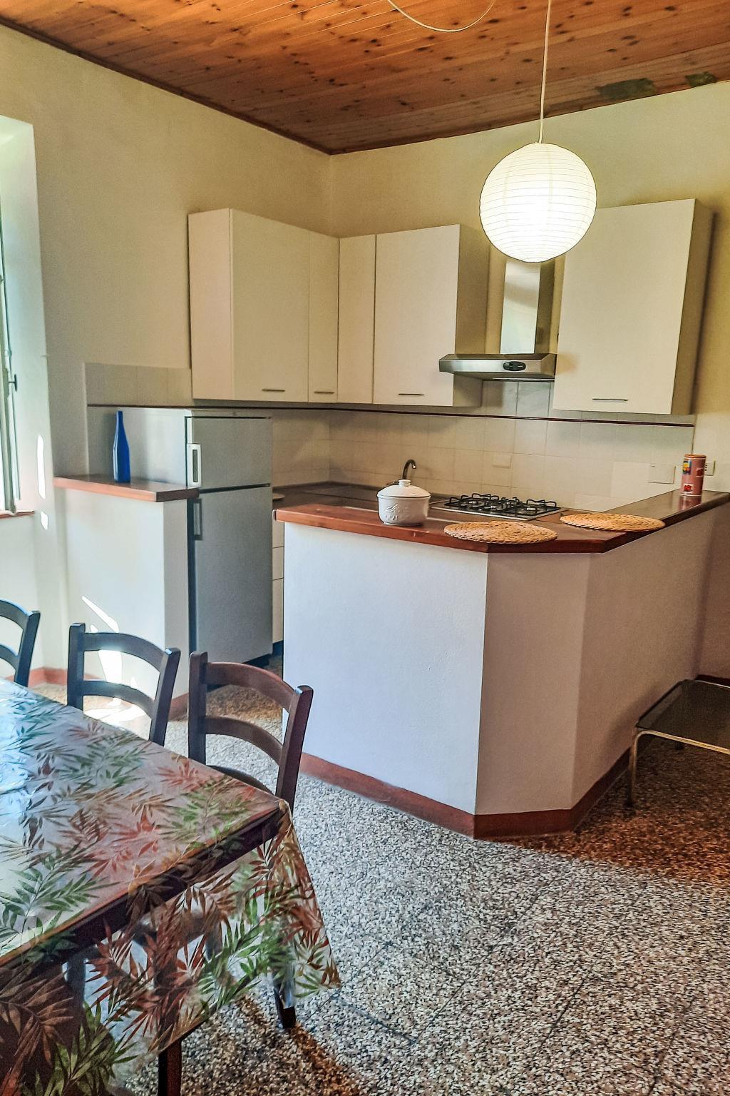 5-room apartment 110 m2 on 1st floor. Simple furnishings: living/dining room with 2 sofabeds, open-hearth fireplace and satellite TV. 1 double bedroom. 1 room with 3 beds. 1 room with 1 x 2 bunk beds. 1 double bedroom with 1 sofabed. Kitchenette (4 hot plates, oven, dishwasher, freezer) with dining table. 2 showers/bidet/WC. Terrace furniture, barbecue. Facilities: washing machine, mosquito net, logs (extra). Parking at the house. Maximum 1 pet/ dog allowed. IT049017C2KDLFU9DL