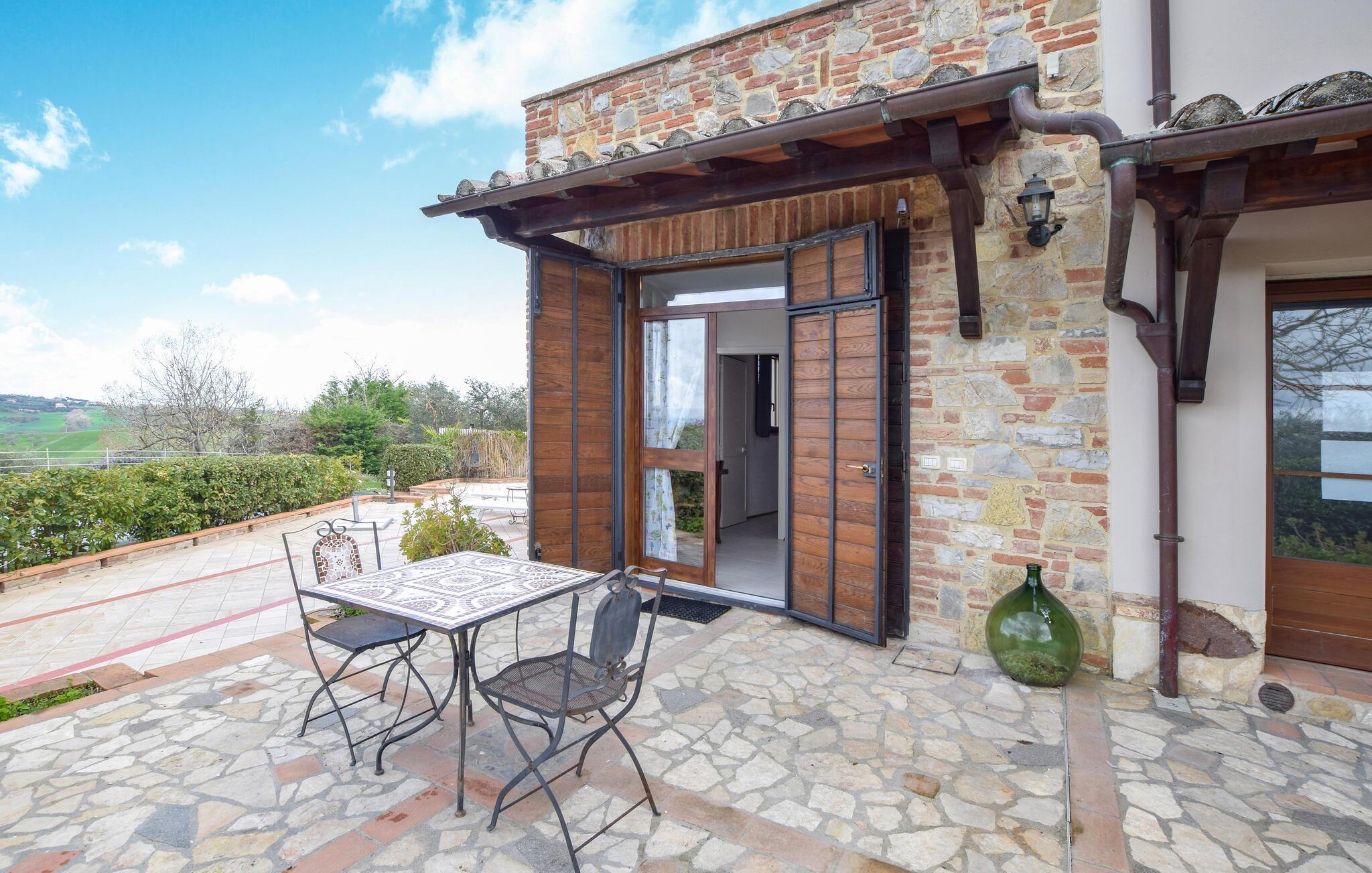 Velkommen til dette bondehus nær Chiusi, et paradis for alle, der sætter pris på fred, natur og den toscanske livsstil. Dette hjem på en bakketop tilbyder en betagende panoramaudsigt over områdets bølgende dale hele vejen til Montepulciano. Den store grund omfatter fire selvstændige lejligheder, ideelle til familier eller grupper, der rejser sammen, men som værdsætter privatlivets fred.