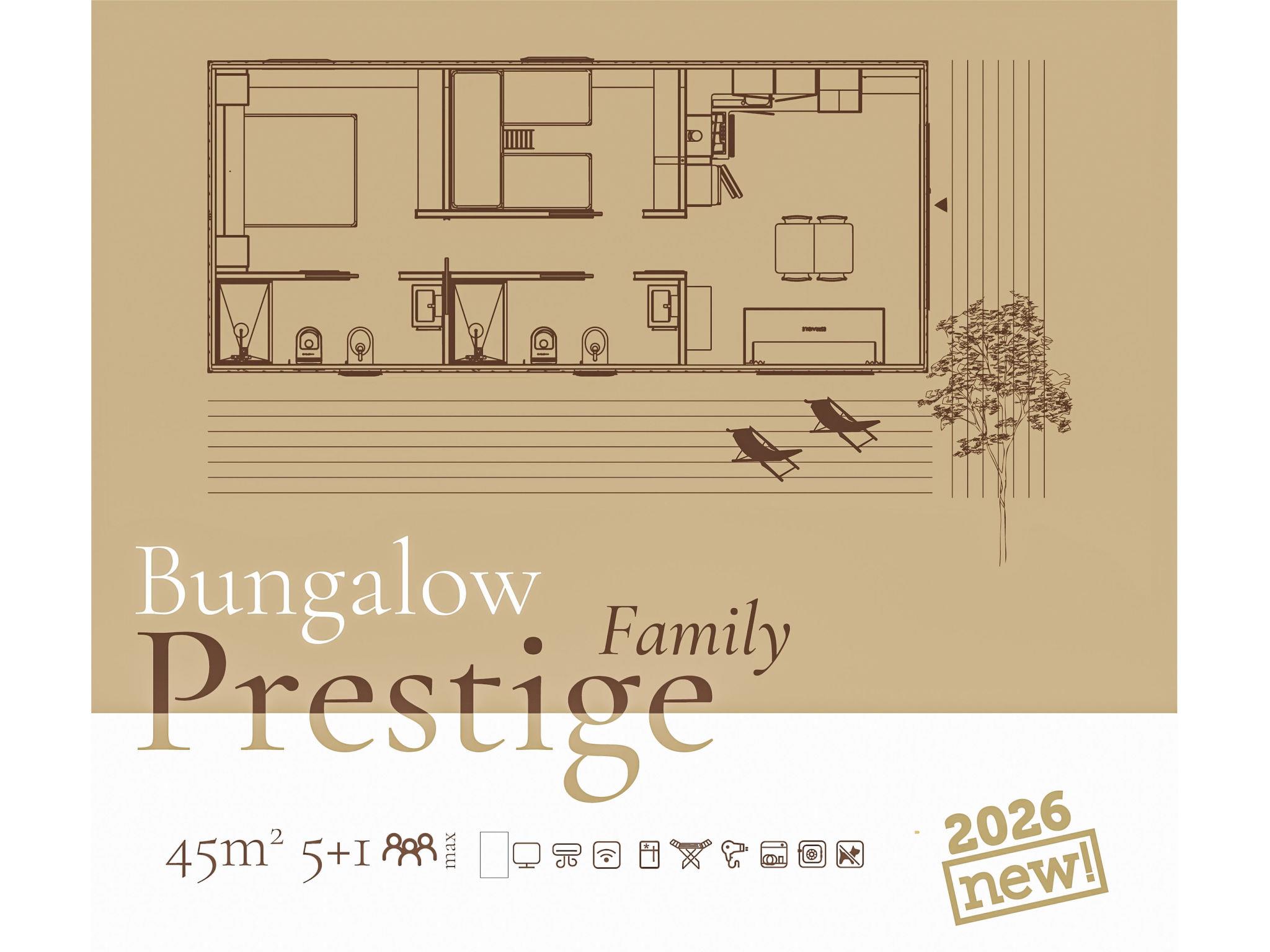 "Prestige Family", 3-room mobile home 45 m2. Object suitable for. Bright, modern furnishings: living/sleeping room with 1 sofabed, dining table and TV. 1 double bedroom with shower/bidet/WC. 1 room with 2 beds and 1 x 1 bunk beds. Kitchenette (dishwasher, 4 gas rings, freezer). Shower/bidet/WC. Air-conditioning, forced-air heating. Terrace 18 m2, small garden. Terrace furniture, deck chairs (2). Facilities: safe, mosquito net, children's high chair, baby cot for up to 2 year olds (extra), hair dryer. Internet (WiFi, free). Parking (1 car). Please note: non-smoking house. IT053006B1ZWQW8ZUA