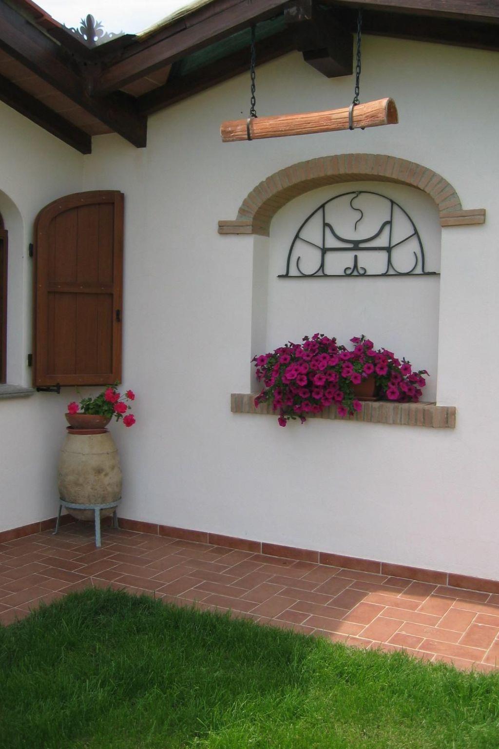 This lovely holiday flat offers approximately 35 square metres of living space and is located on the first floor. The flat is accessed via a beautiful staircase that leads to a small veranda with a view of the surrounding countryside. The flat consists of a living room with an open kitchen equipped with a 4-burner electric cooker. Here you will also find a dining area with colour TV. The flat also includes a bedroom with a wrought-iron double bed and antique furniture, as well as a bathroom with shower. The flat features terracotta floors and exposed beams on the ceiling, and from the terrace you can enjoy a beautiful view of the famous Roccamare pine forest.