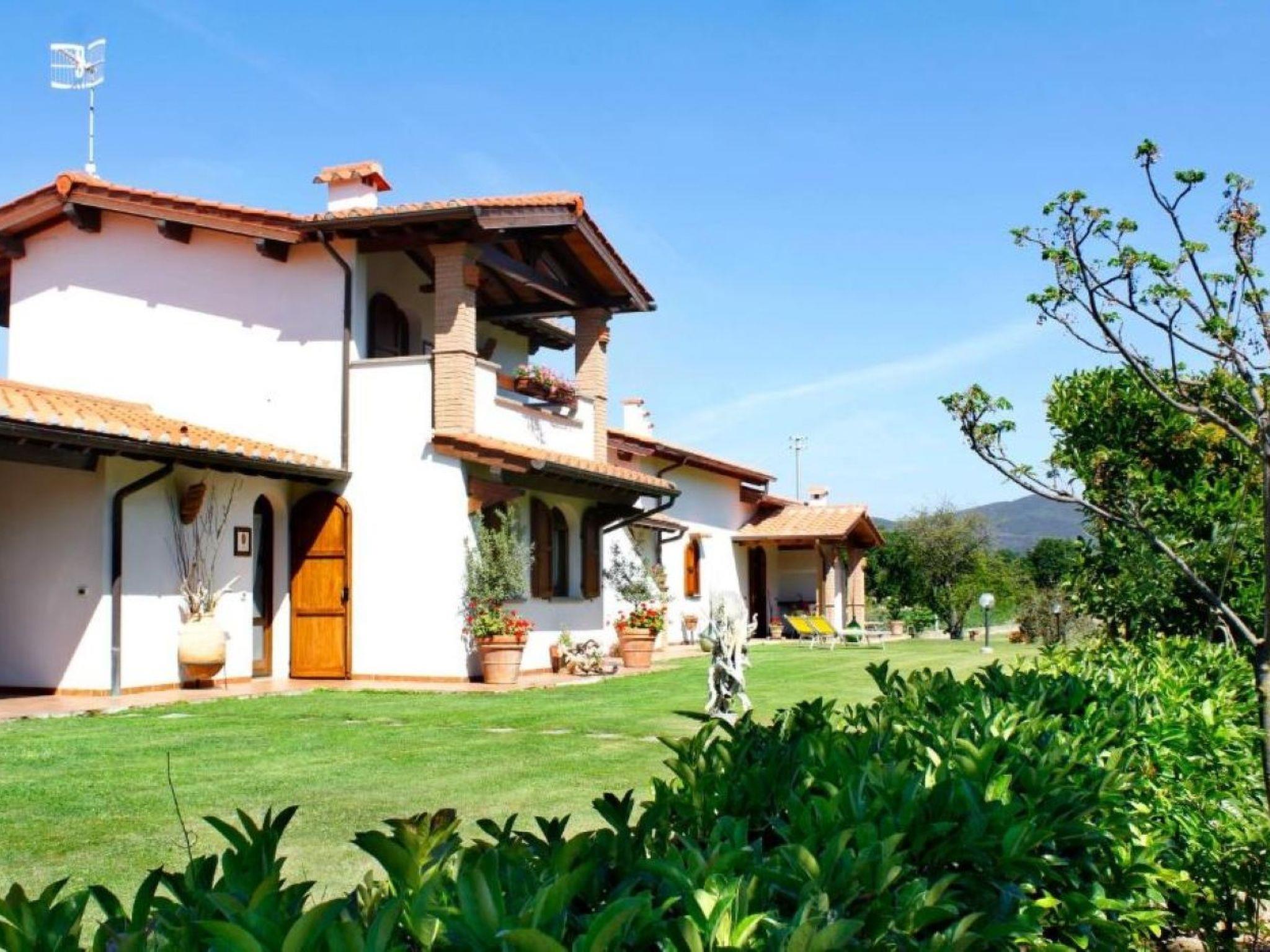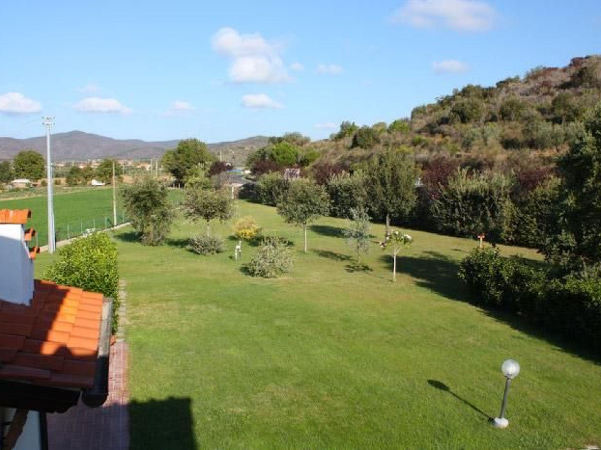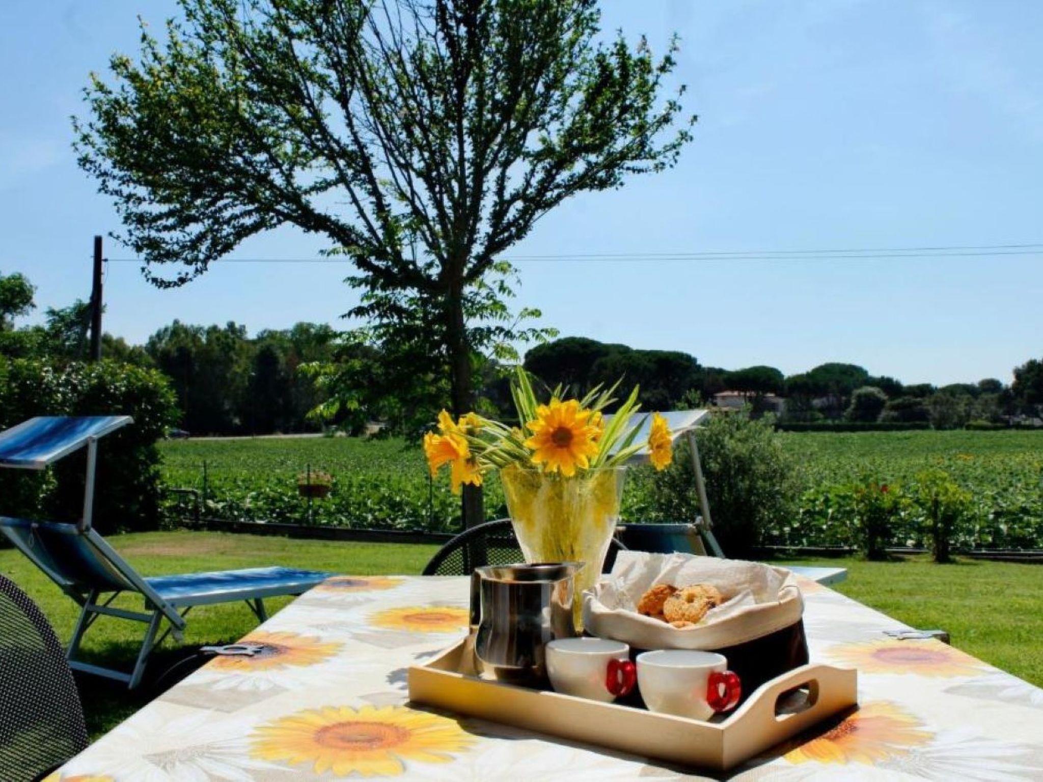 The veranda with table and chairs and a view of the garden, the surrounding countryside and the pine forest allows guests to dine comfortably outdoors. Guests can also sunbathe on comfortable deck chairs in the garden.
