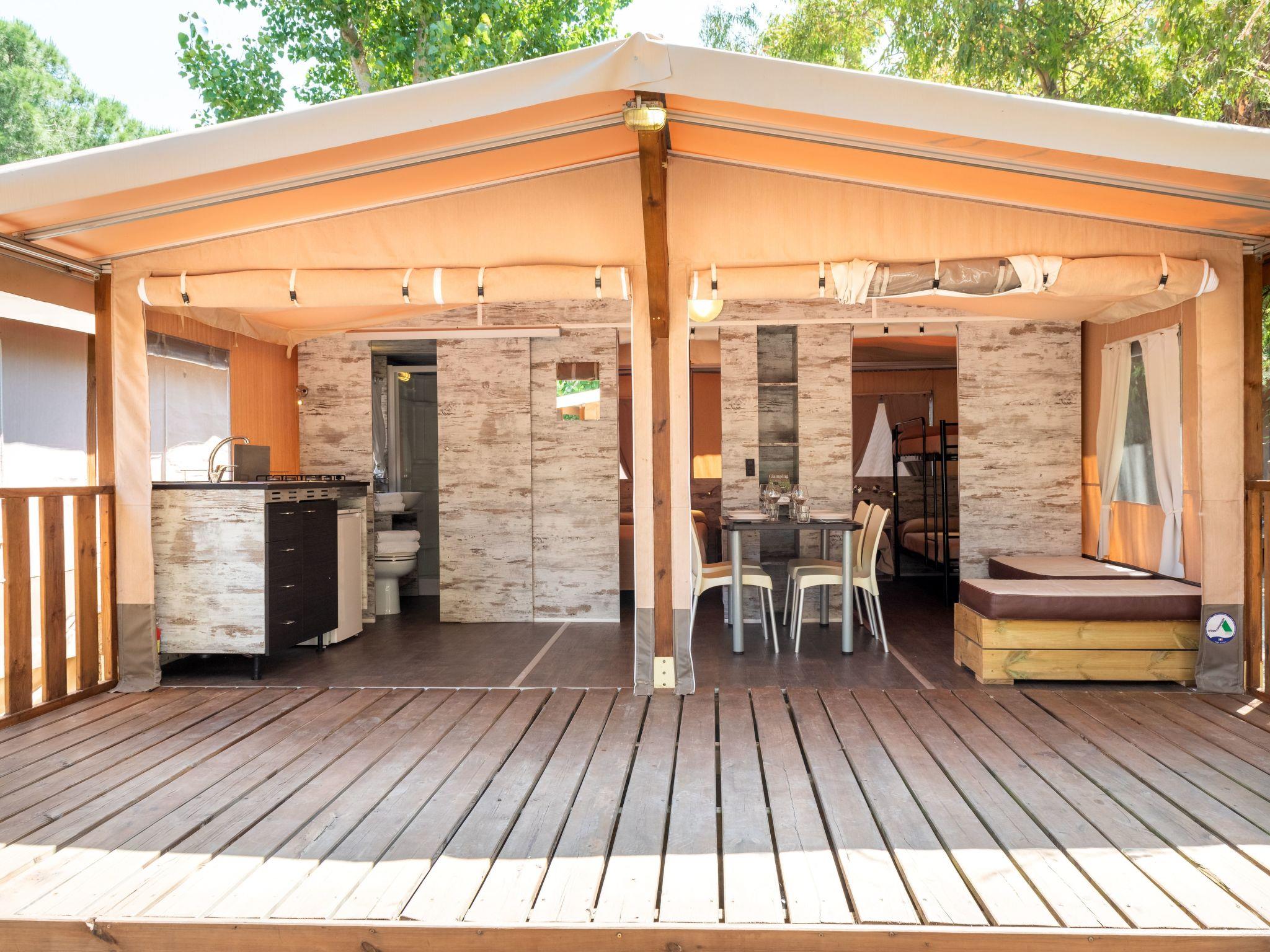 The Safari Lodge Tents are glamping tents equipped with every comfort. When the entrance curtains are opened, the living room becomes one with the large outdoor veranda, where you can relax. The wooden walls inside, in natural colours, blend in well with the surrounding environment, immersed in nature.Inside: a double room with French bed (140×190), a triple room with bunk beds, bathroom with shower cubicle and washbasin.Outside: veranda furnished with table, chairs and sofas, kitchenette equipped with utensils and crockery, fridge.
