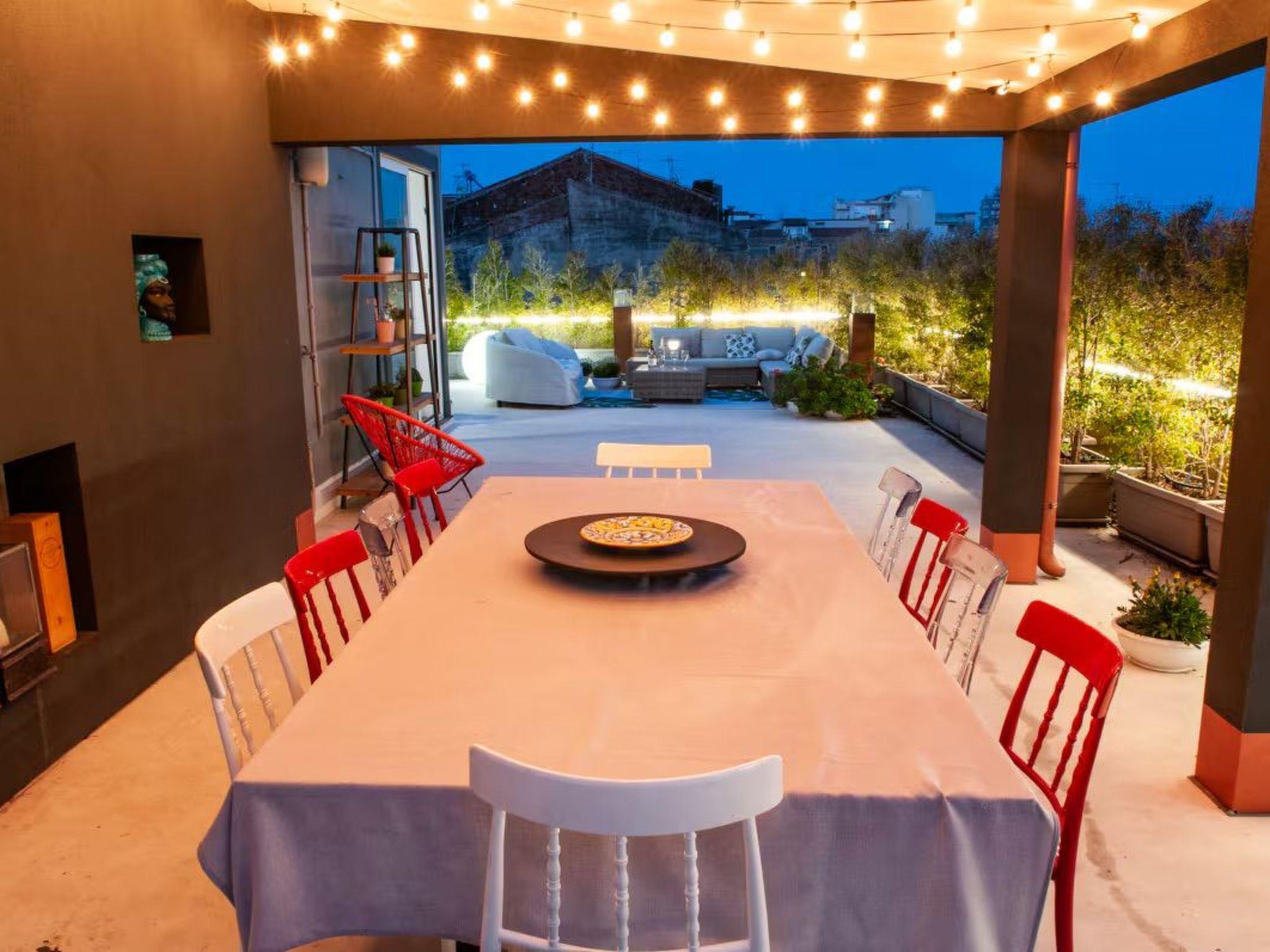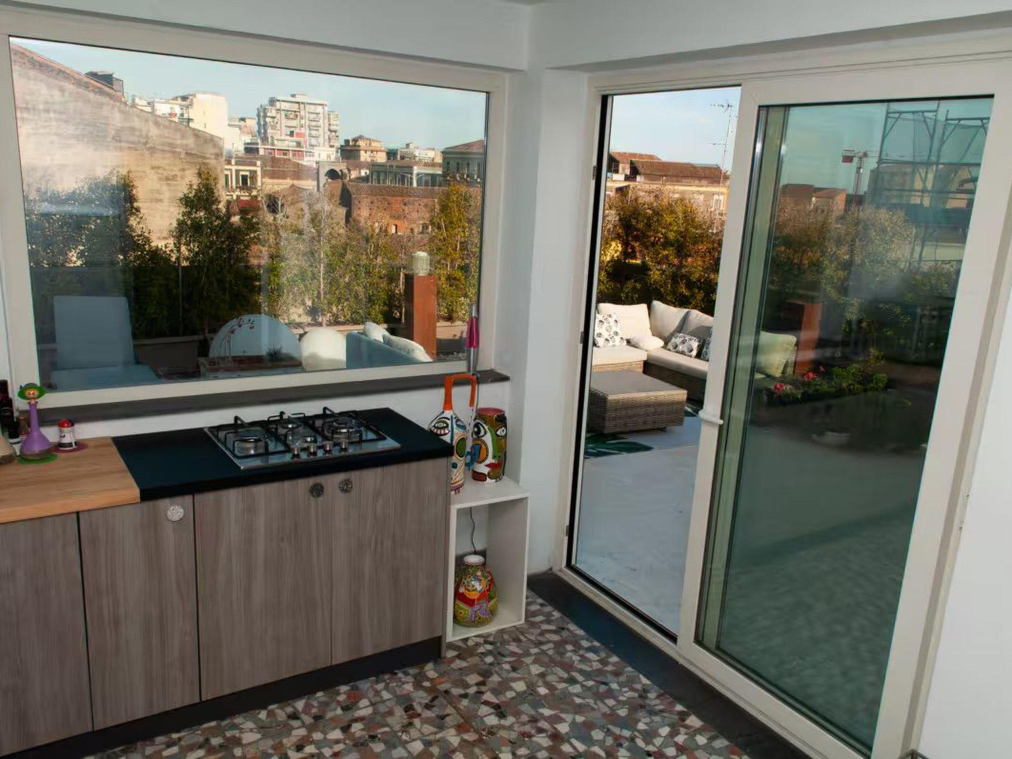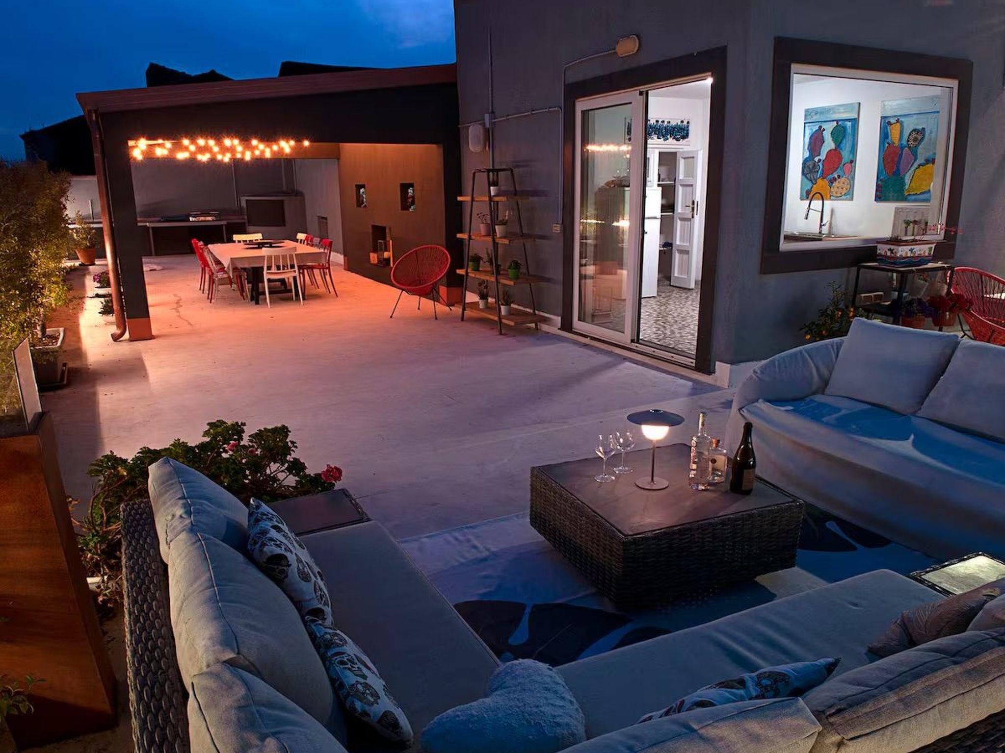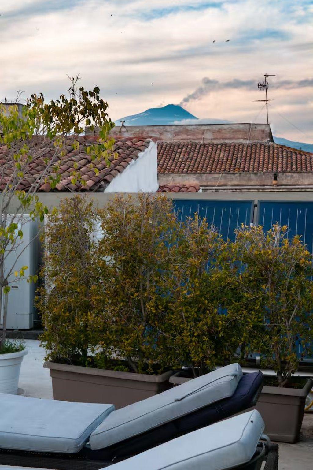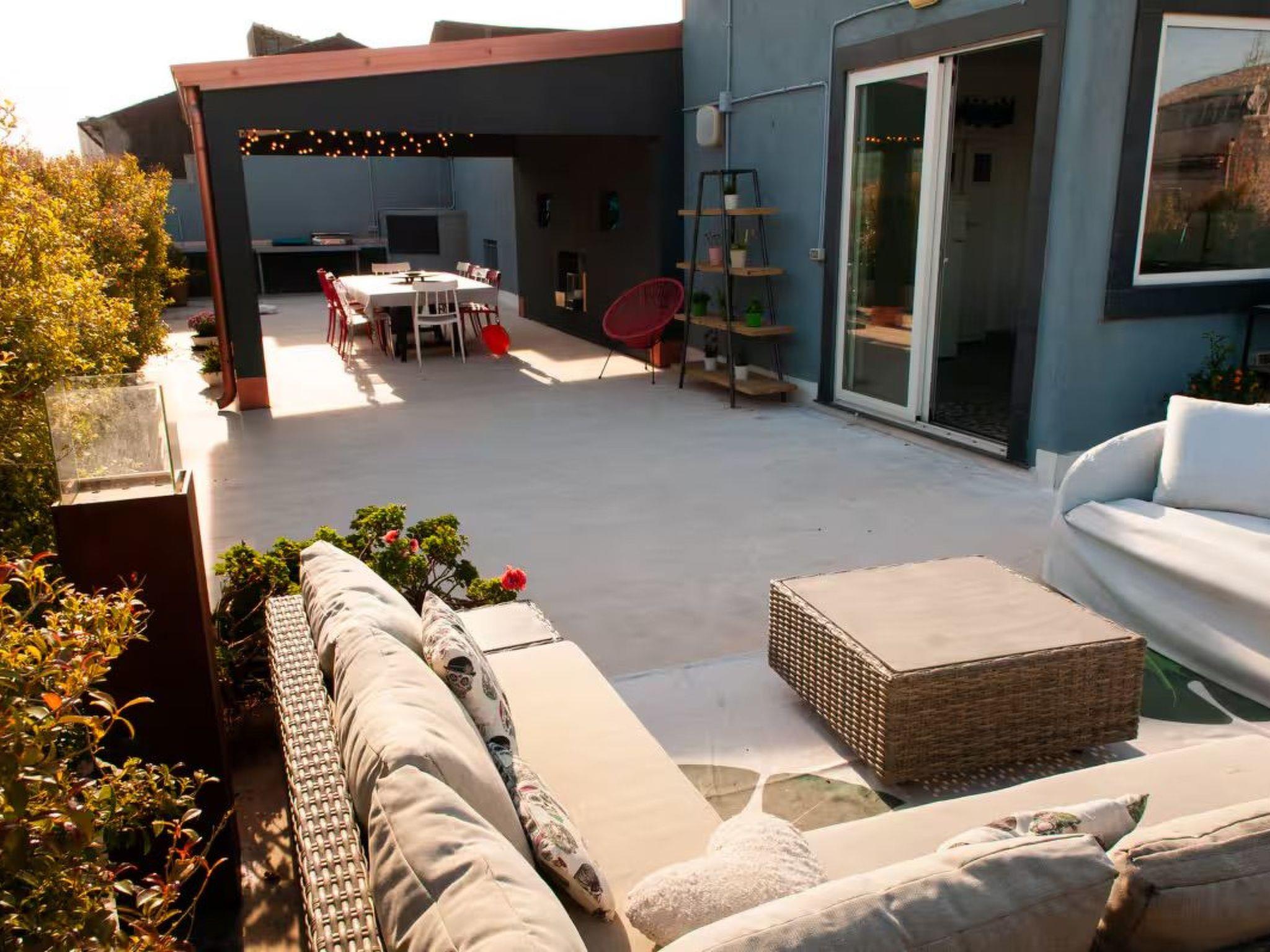 Outside the interior, an impressive roof terrace invites you to unwind or enjoy time together in the open air. Barbecue and use the kitchen on the terrace to prepare meals. This outdoor area has plenty of space for relaxed moments in a group or for a quiet breakfast, lunch or dinner with a view over the old town and the peak of Mount Etna.