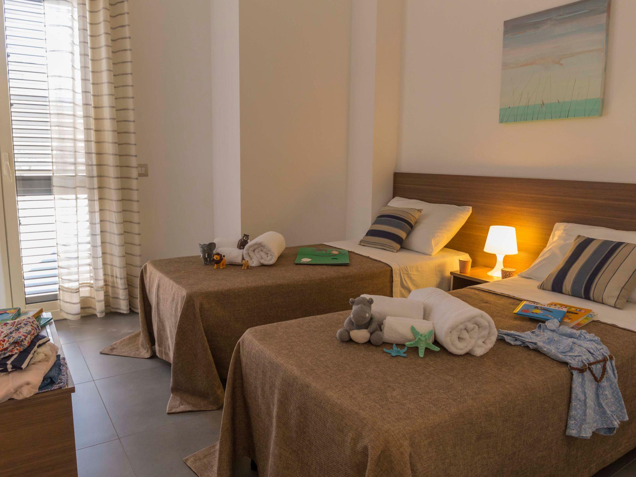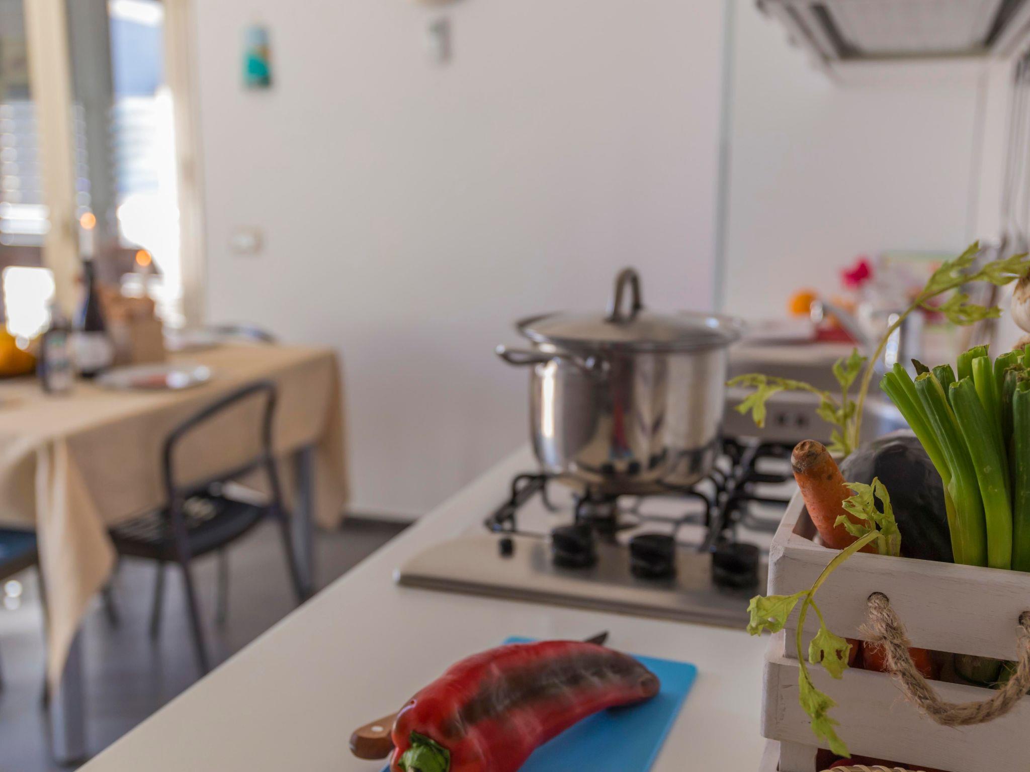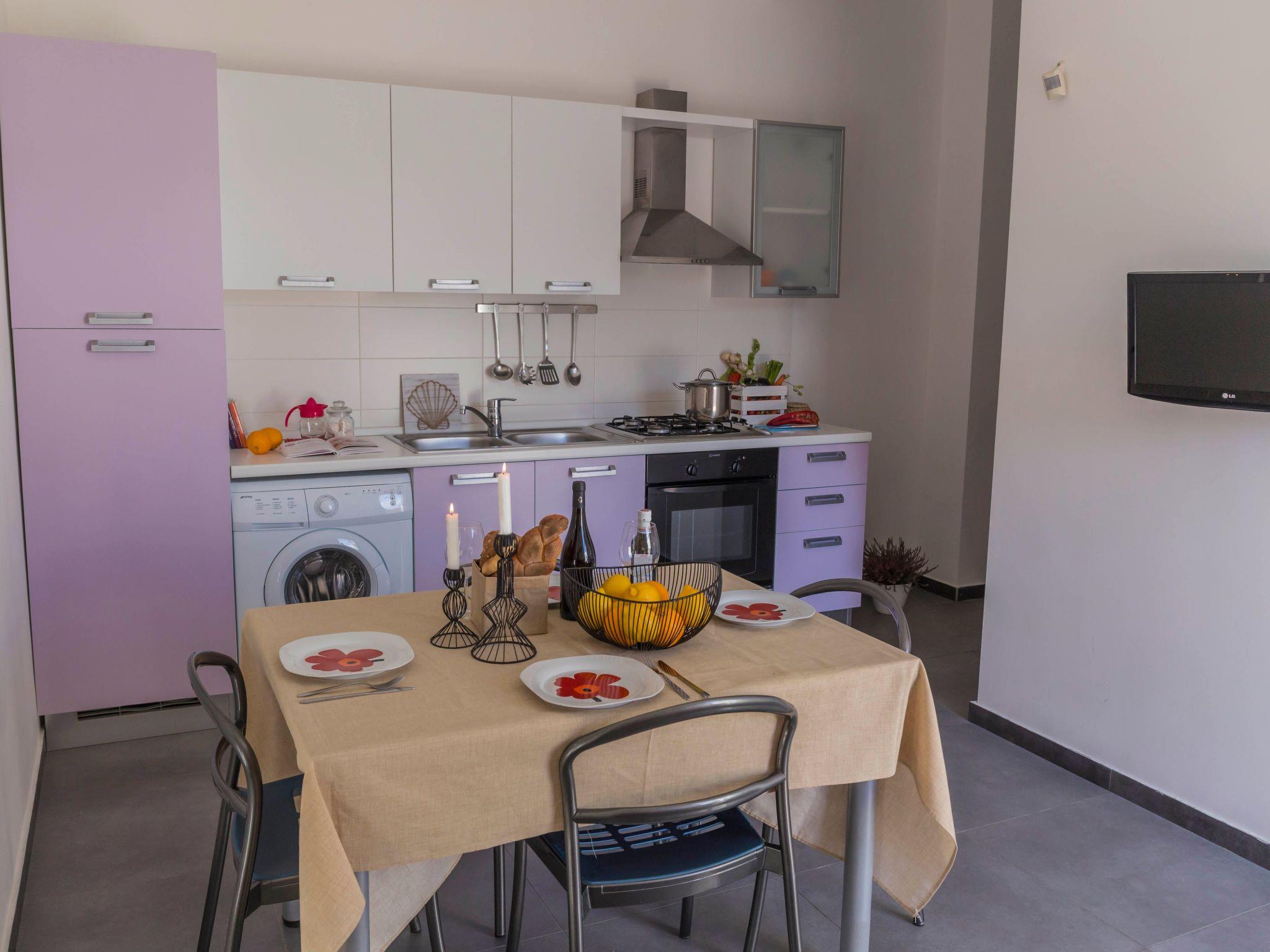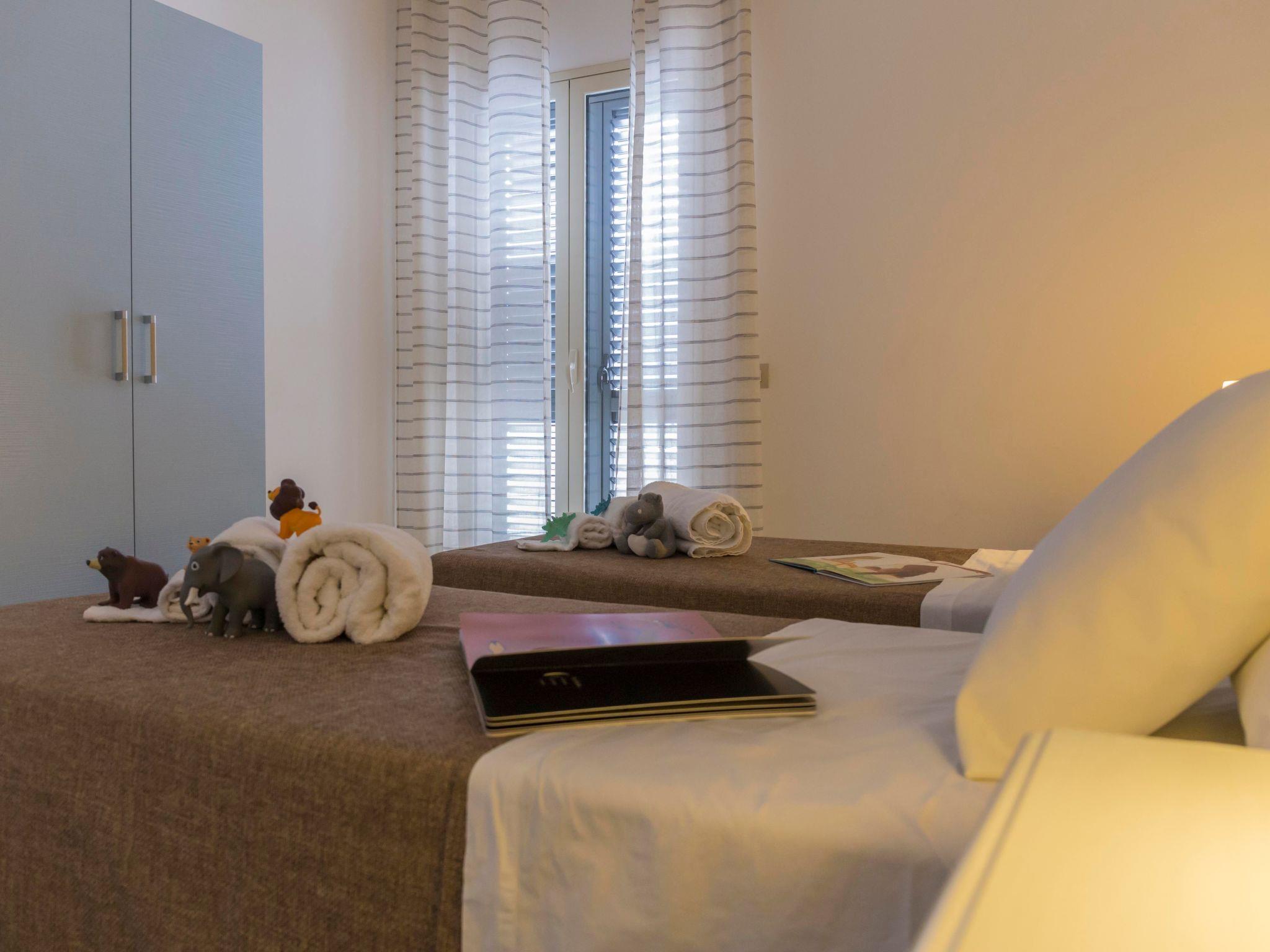 The holiday flat consists of two bedrooms, a large, fully equipped kitchen-living room with sofa bed and an elegant bathroom with two showers. One of the rooms is furnished with a double bed, the other with two single beds. The flat is tastefully furnished in a modern style. The fully equipped kitchen-dining room includes a gas cooker, an oven and a dining table with chairs. There is enough space for cooking and eating together.