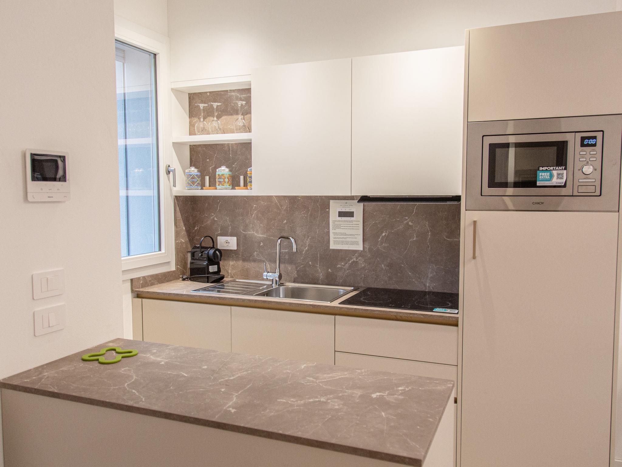 Modern residence "Green Park Apartments", 2 storeys, built in 2024. 12 apartments in the residence. In the district of Ca' Pasquali 4.3 km from the centre of Cavallino-Treporti, 12 km from the centre of Lido di Jesolo, 7 km from the centre of Punta Sabbioni (boat to Venice), 100 m from the sea, 100 m from the beach. Breakfast full board half board possible on request (extra). Communal covered parking at the house. Bus stop 900 m. The photo is just an example. In the nearby Camping Village Cavallino (same owner) our guests may use their pools (23th May-15th Sept., bathing caps are mandatory) and take part in the animation programme for adults and children from 5 years (1st June-30th Aug.) for free, whereas the Spa is against payment. All the guests have to wear a wristband for identification.