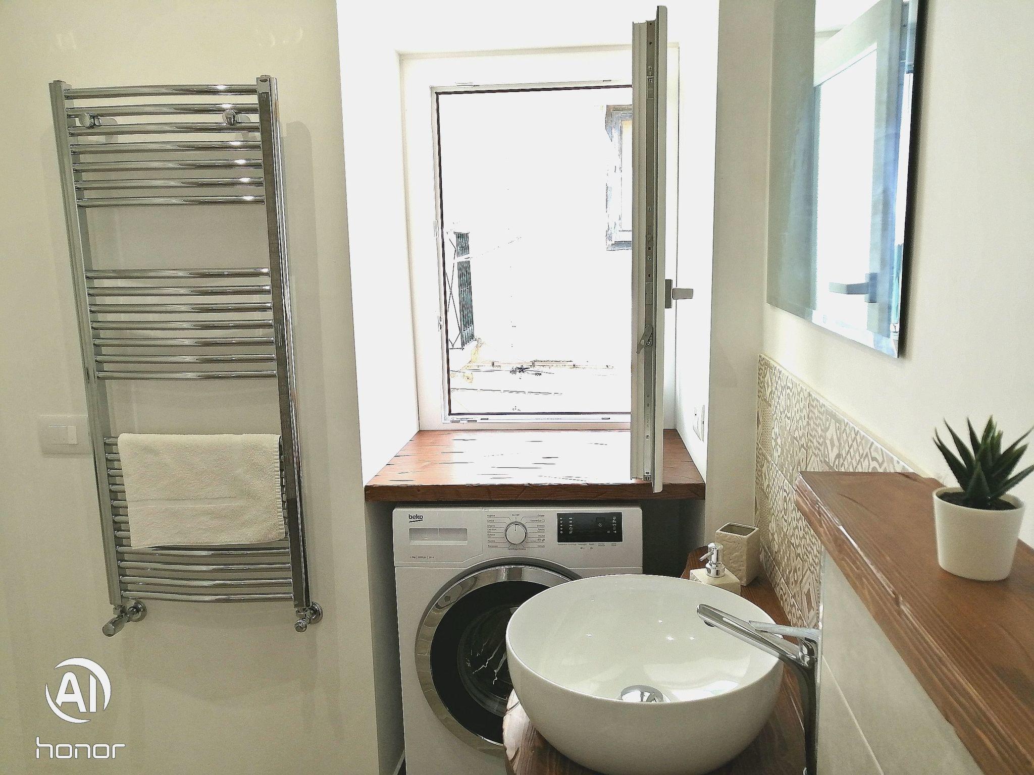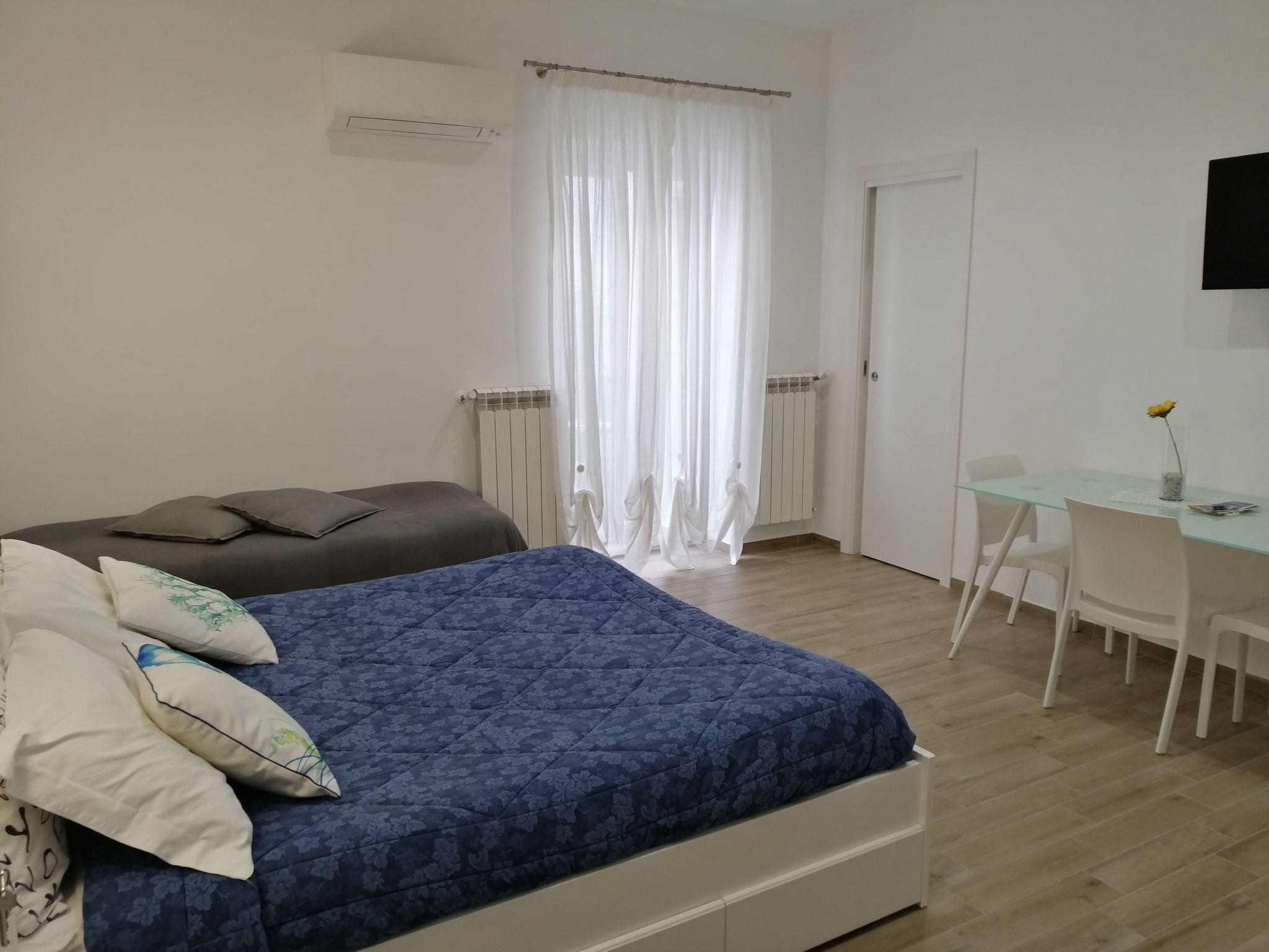 Large, bright flat with a double bed, a single bed, a kitchenette, a balcony and a table with two chairs, a bathroom with shower. It also includes air conditioning, TV, heating, Wi-Fi and a washing machine.