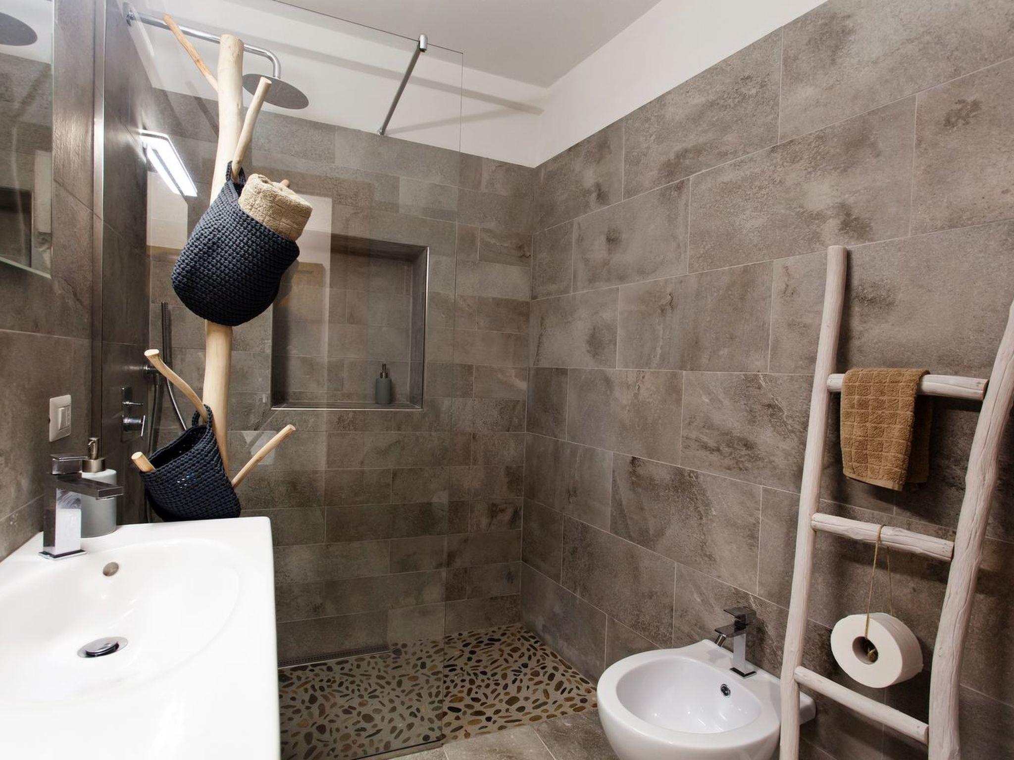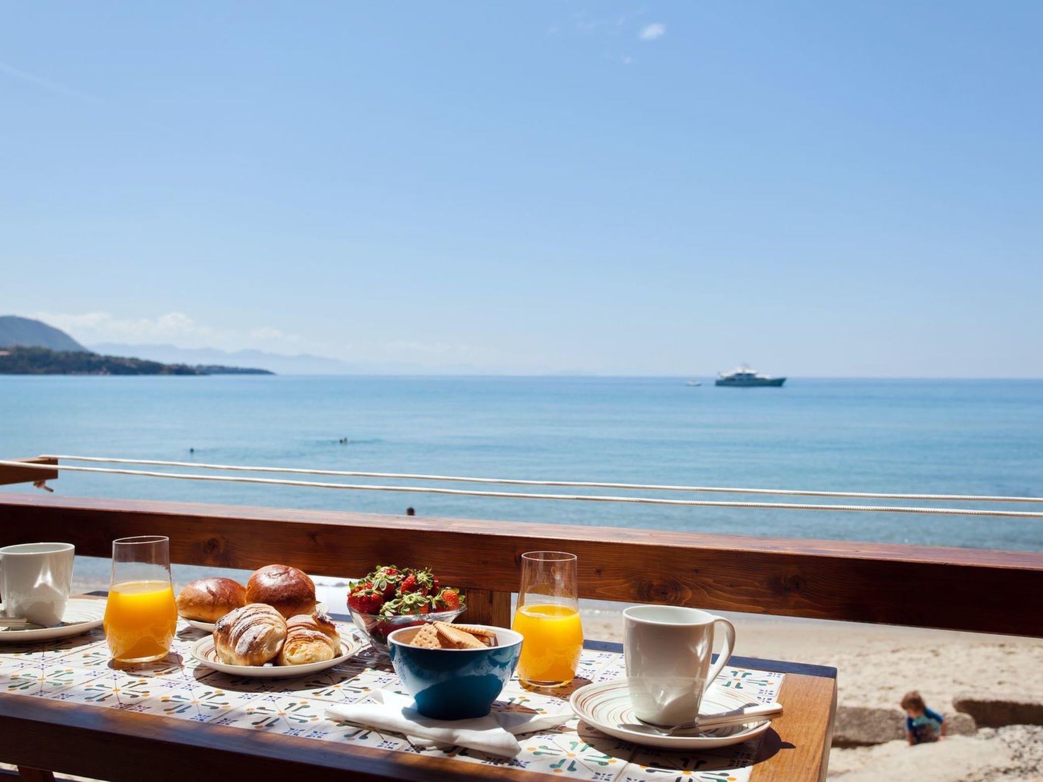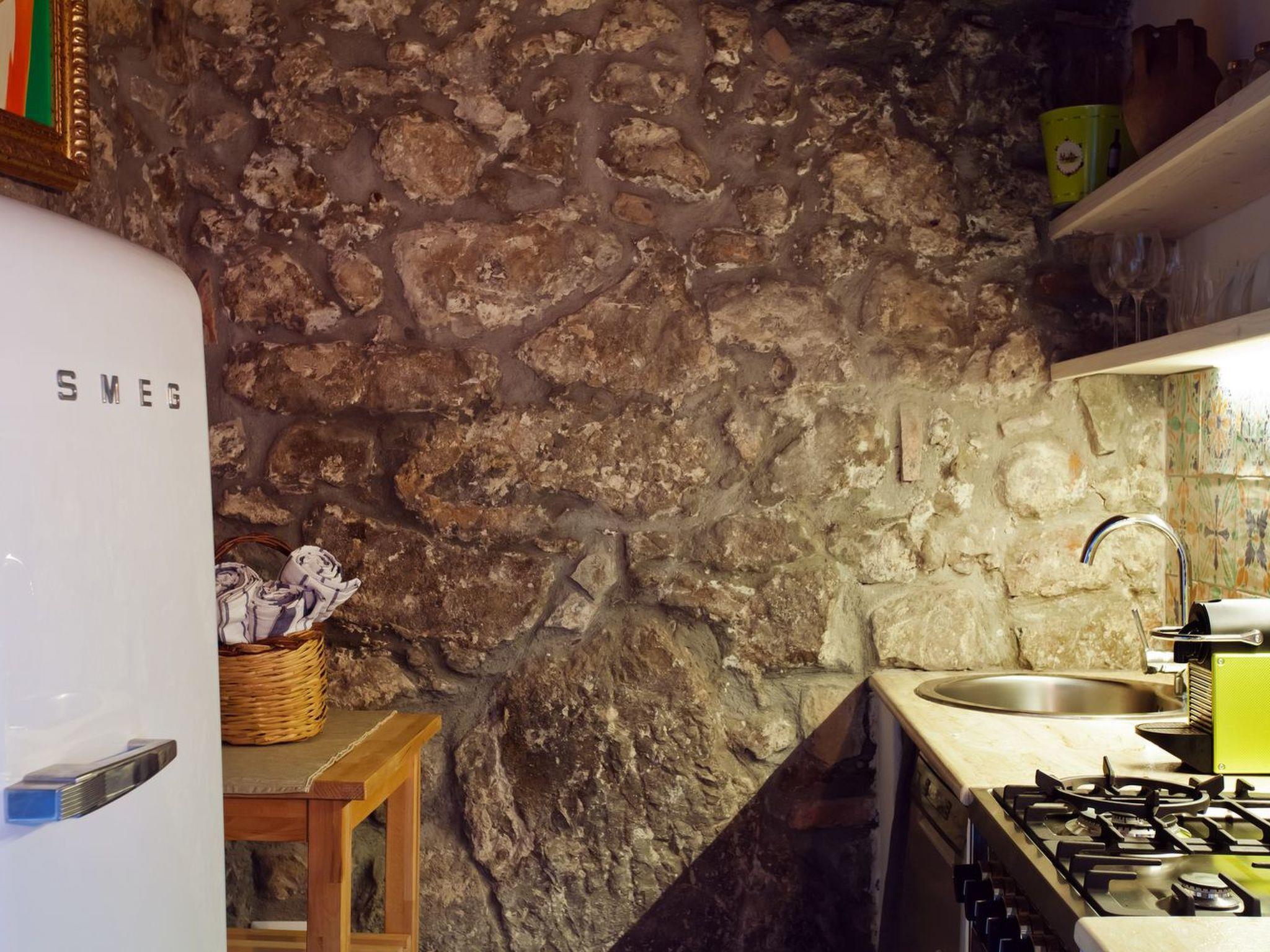 The apartment is located on the ground floor and features an open-space living room with sofa bed and dining area with sea views through a french door leading to the terrace and the beach. The charming well equipped small kitchen is accessed to the right of the dining area through a brick archway. The double bedroom is located at the opposite end of the apartment built around stone rocks which protrude from the ground. The stylish good-sized bathroom features a large walk-in shower.