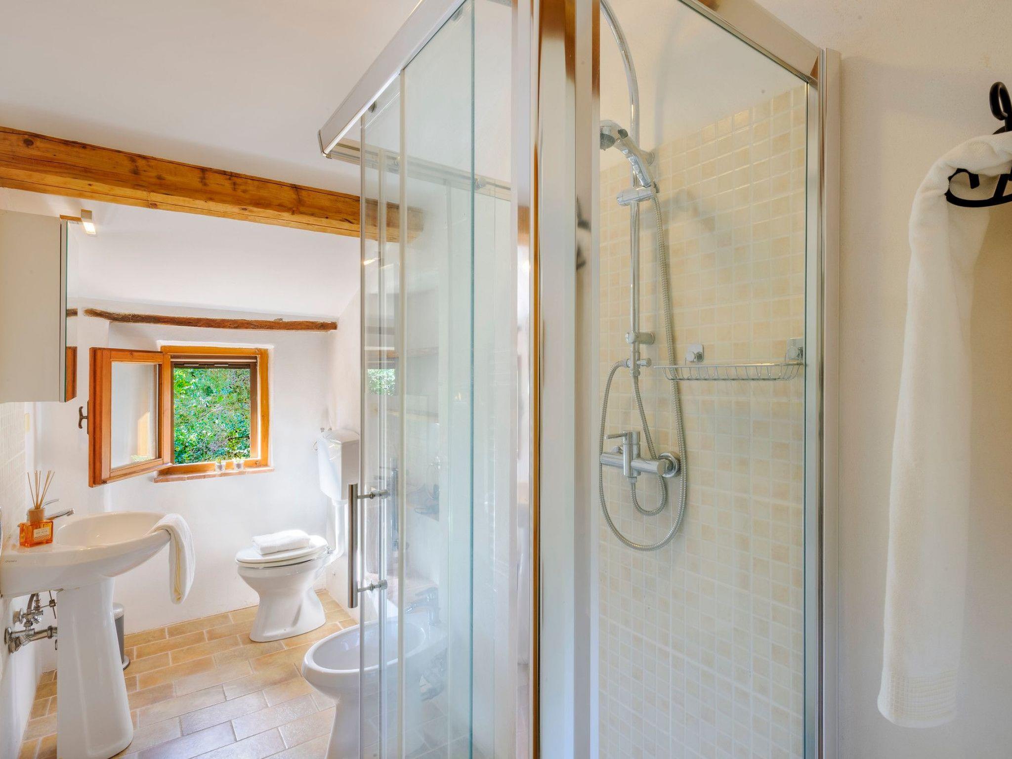 On the ground floor, we find a large and bright living room with a dining area that overlooks the loggia equipped for eating and relaxing outdoors and equipped with a wood-burning oven. The well-equipped kitchen has a direct exit to the outside, then we find a double bedroom with air conditioning, a bathroom with shower and a laundry room. On the first floor there are 3 double bedrooms and 2 bathrooms, one with a shower and one with a bathtub.