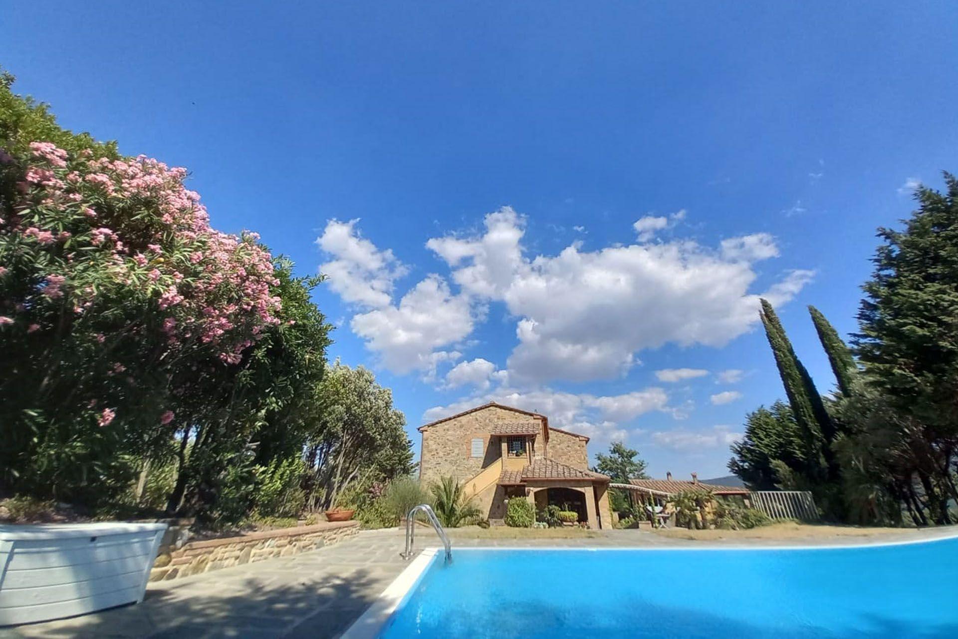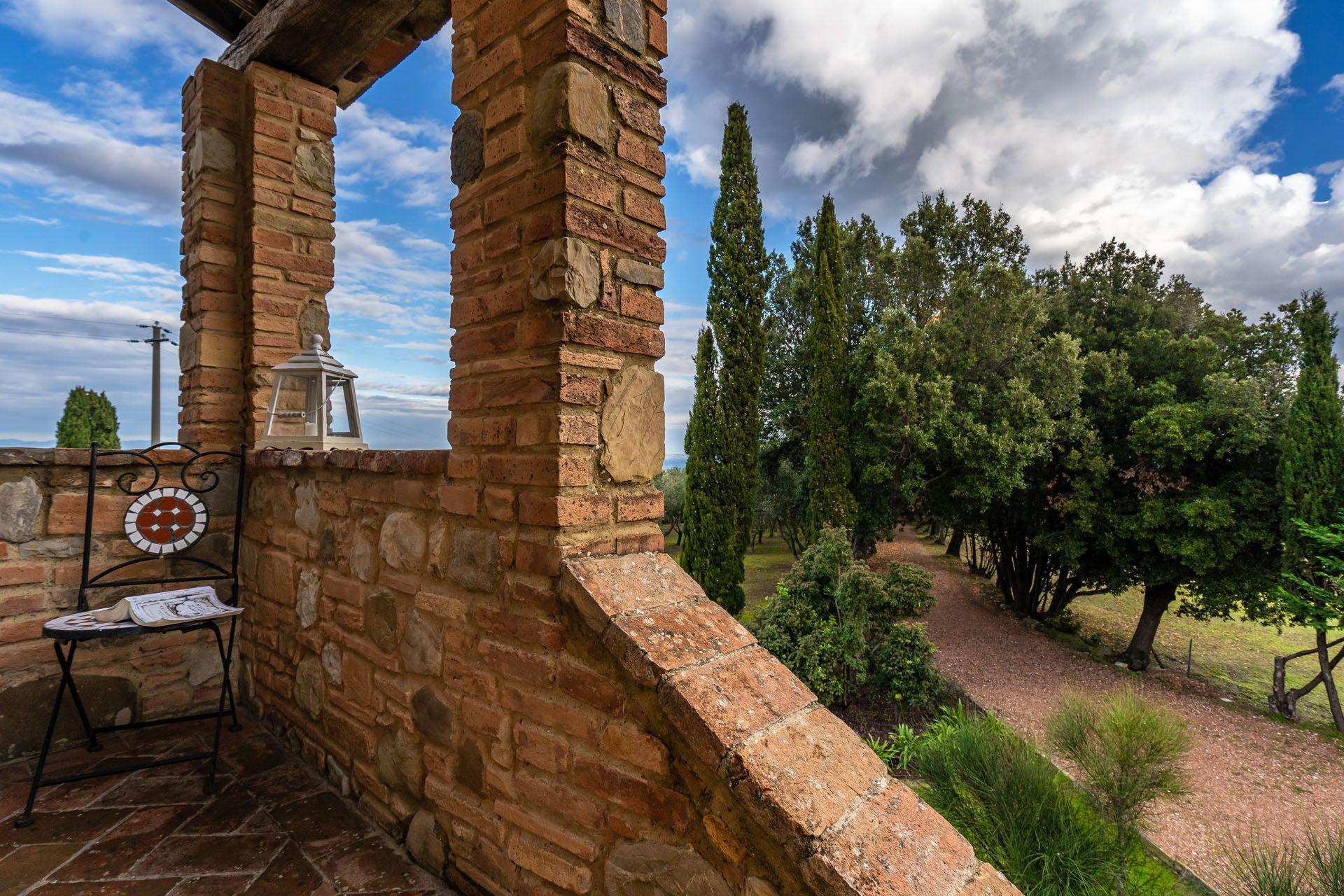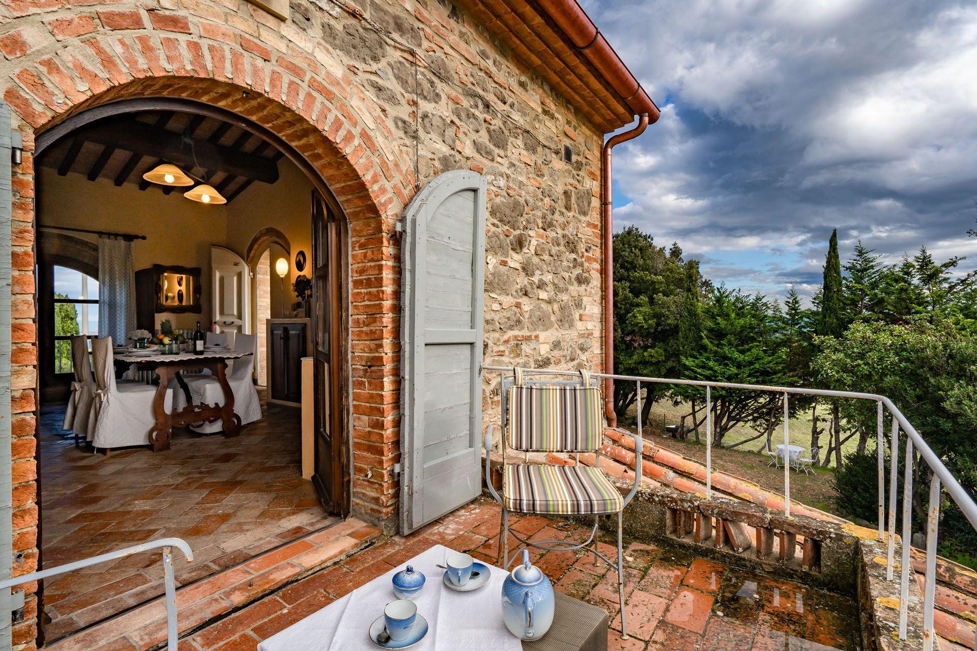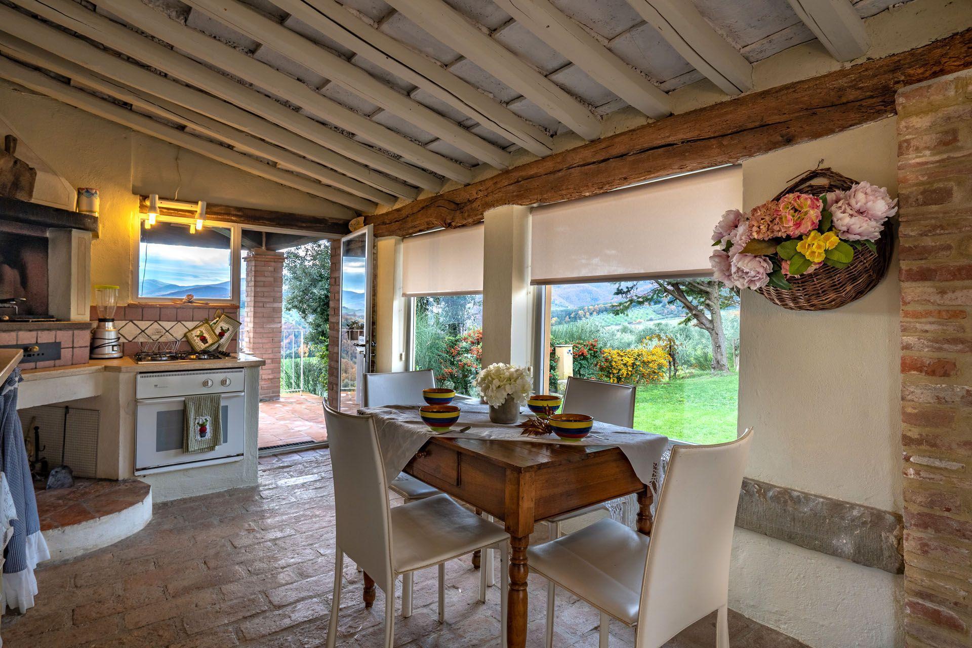 An external staircase, typical of Tuscan farmhouses, leads to the interior of the accommodation, consisting of a large living room, a fully equipped kitchen and two terraces with panoramic views. The sleeping area consists of two elegant double bedrooms with private bathrooms. On the ground floor there is a lovely portico surrounded by the garden, furnished with a sofa and armchairs. In front of the porch, for exclusive use, there is an outdoor kitchen with a covered veranda equipped for dinners for up to 8 people. From here, as well as from all sides of the house, there is a fantastic view of the surrounding hills and the town of Volterra.