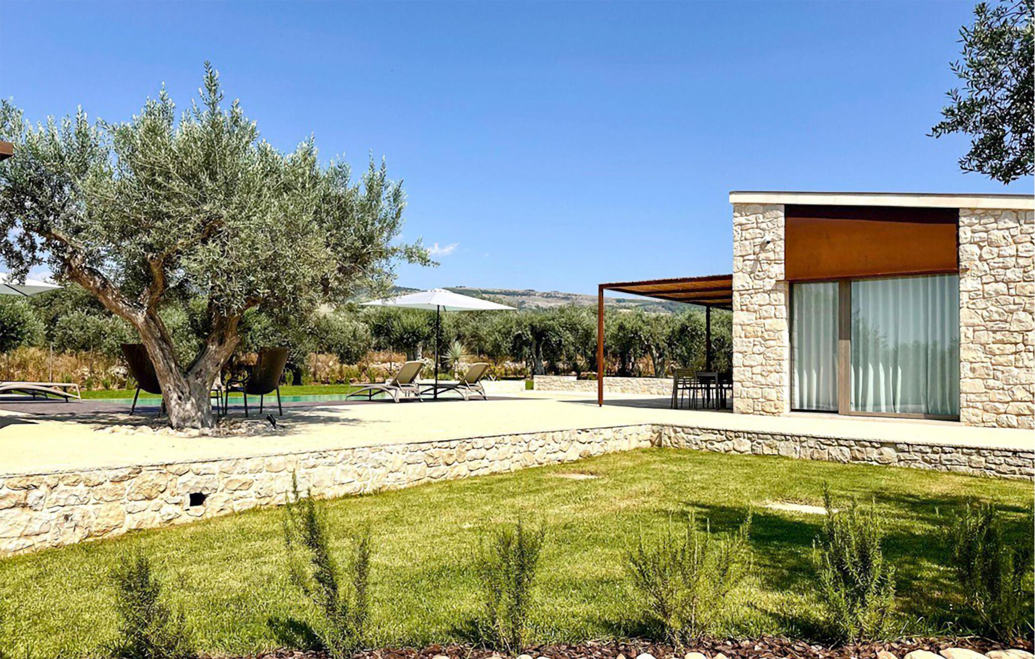 Omgivet af middelhavsvegetation kombinerer dette smukke feriehus rustik charme med moderne komfort. Bliv inspireret til at lave lækre retter i det moderne, åbne køkken og nyd jeres måltider ved det stilfulde spisebord med udsigt til det grønne. Slap af i den komfortable sofa og forkæl jer selv med tid til en god samtale og et glas siciliansk vin.