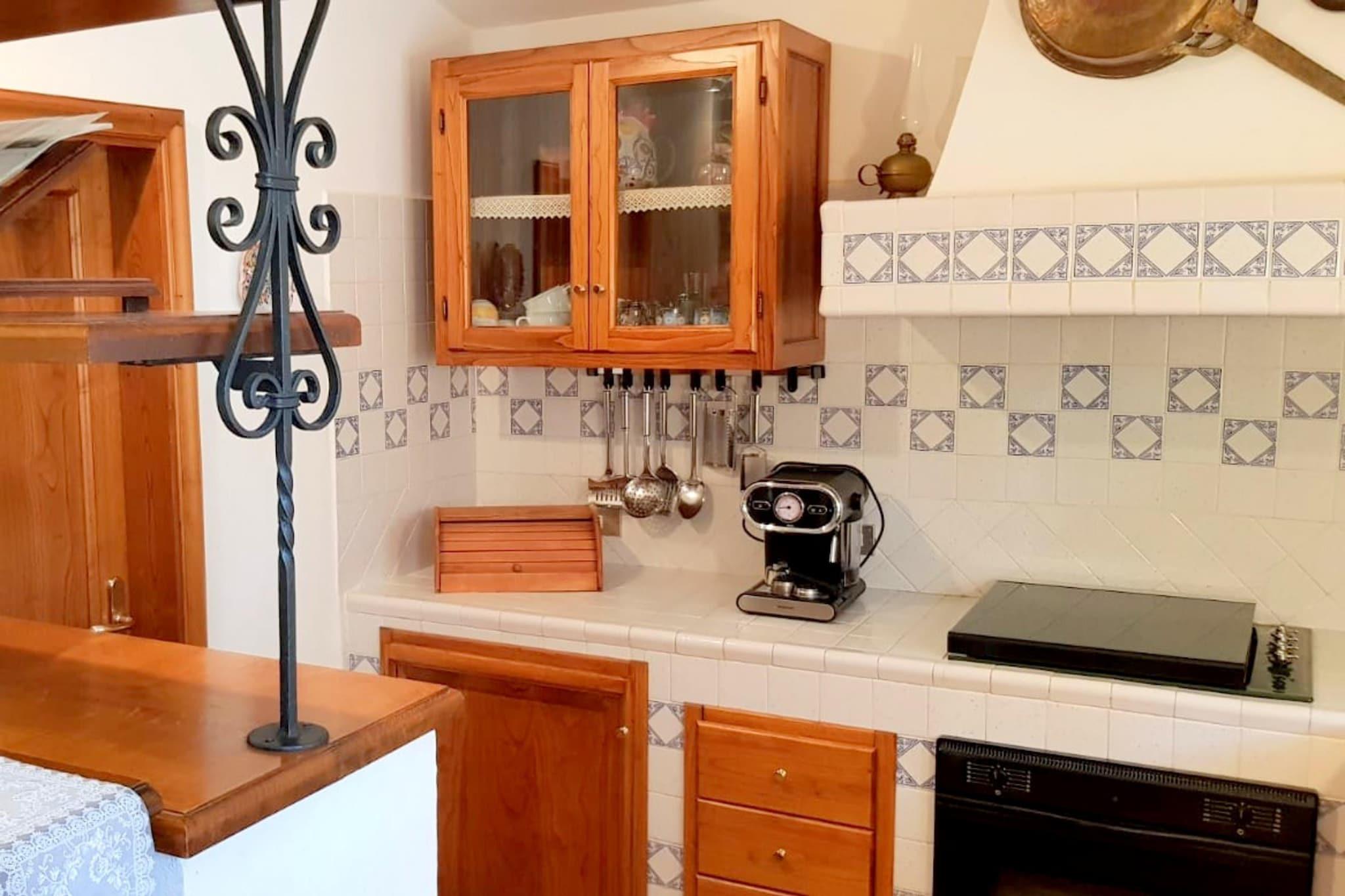 Stueetage: (åbent køkken(komfur(Komfur med fire kogeplader), ovn), stue / spisestue(Fjernsyn(parabol), pejs, radio, køle-fryseskab, klimaanlæg), soveværelse(2x enkeltseng), badeværelse(bruser, håndvask, toilet, bidet, vaskemaskine, varme(elektrisk))) På 1. etage: (soveværelse(via forholdsvis stejle trapper)(enkeltseng, dobbeltseng, klimaanlæg)) udekøkken, varme(elektrisk), terrasse(privat), have(privat, indhegnet, oplyst, 480 m2), havemøbler, grill, parkering, legeredskaber