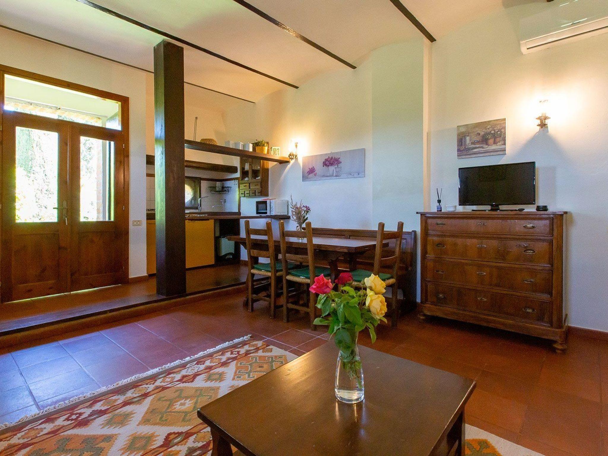 Location Macciano. In the middle of the splendid "Val di Chiana", situated on the first floor of a splendid 16th century farmhouse which has been completely renovated, the flat enjoys a wonderful view over the surrounding valley thanks to a living room created from an old window loggia.01 Chiesone 1 Chiesone 1 is a comfortable flat situated on the ground floor, consisting of a large living room with open kitchen, a double bedroom, a twin bedroom and two bathrooms with shower. The flat can be combined into a single unit with Chiesone 2 above. It also has an outdoor area equipped with a sun umbrella, table and chairs.