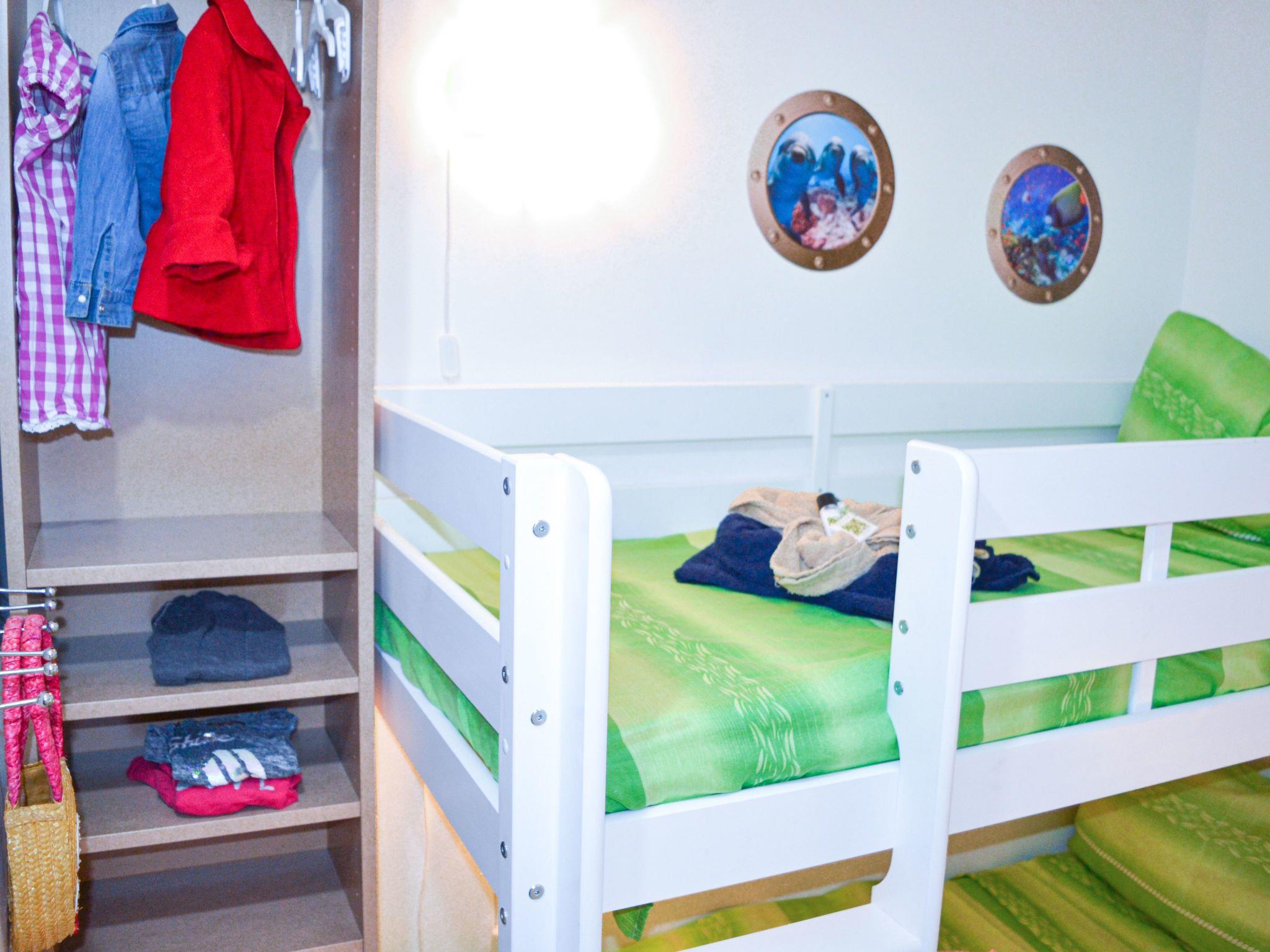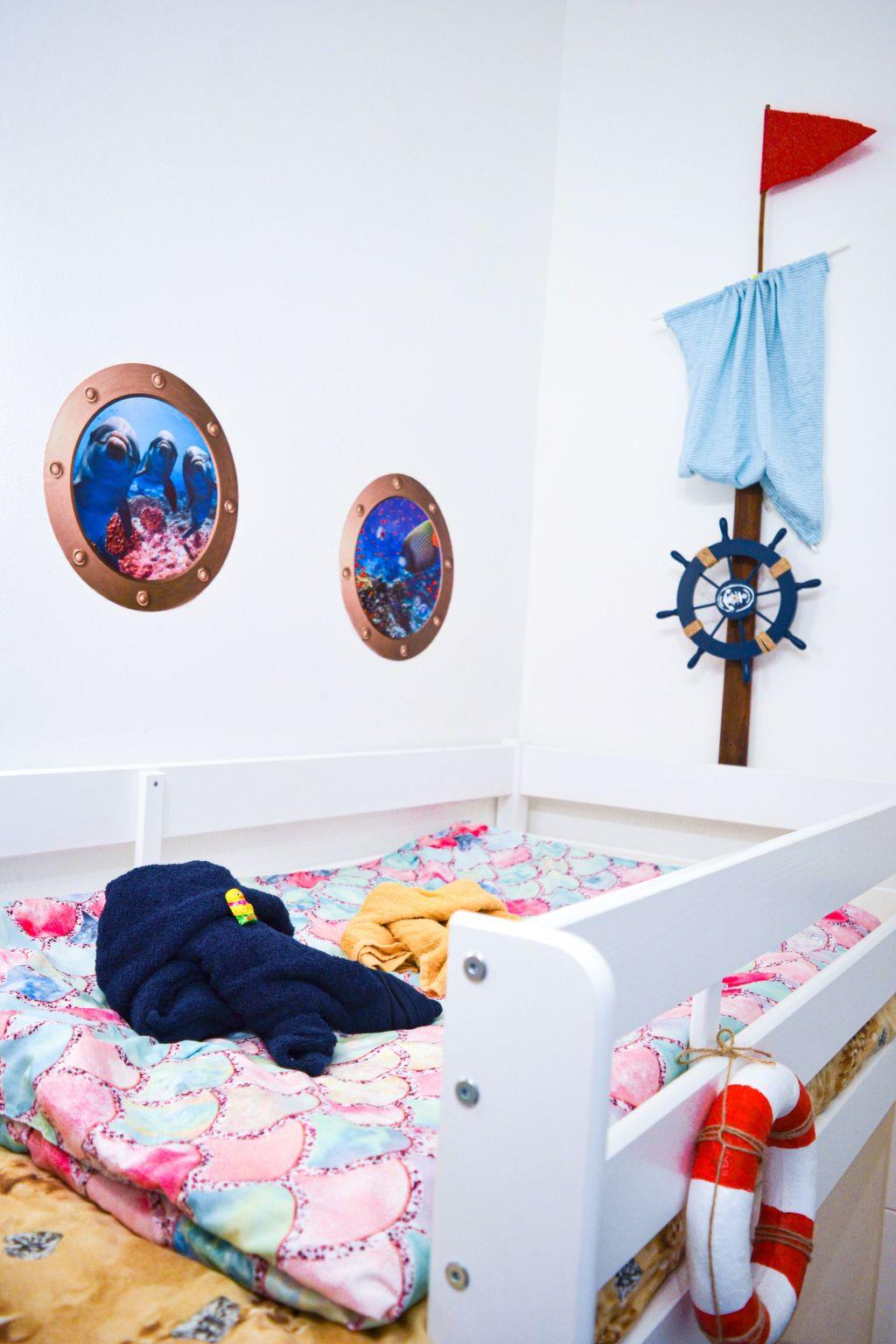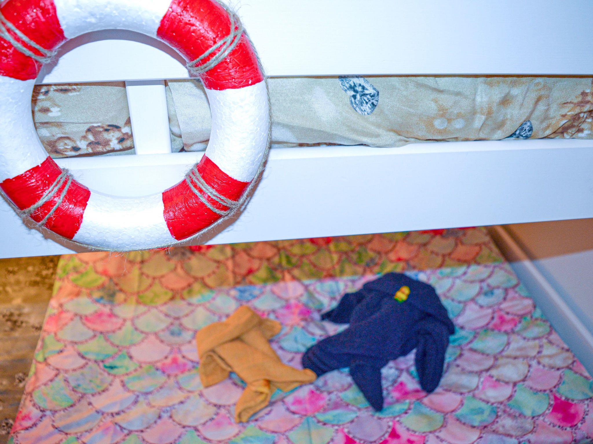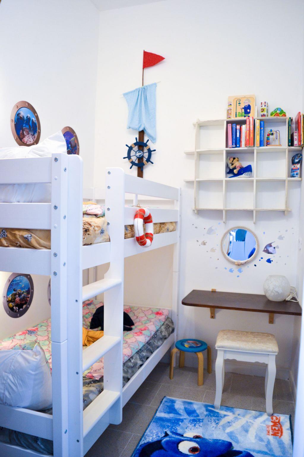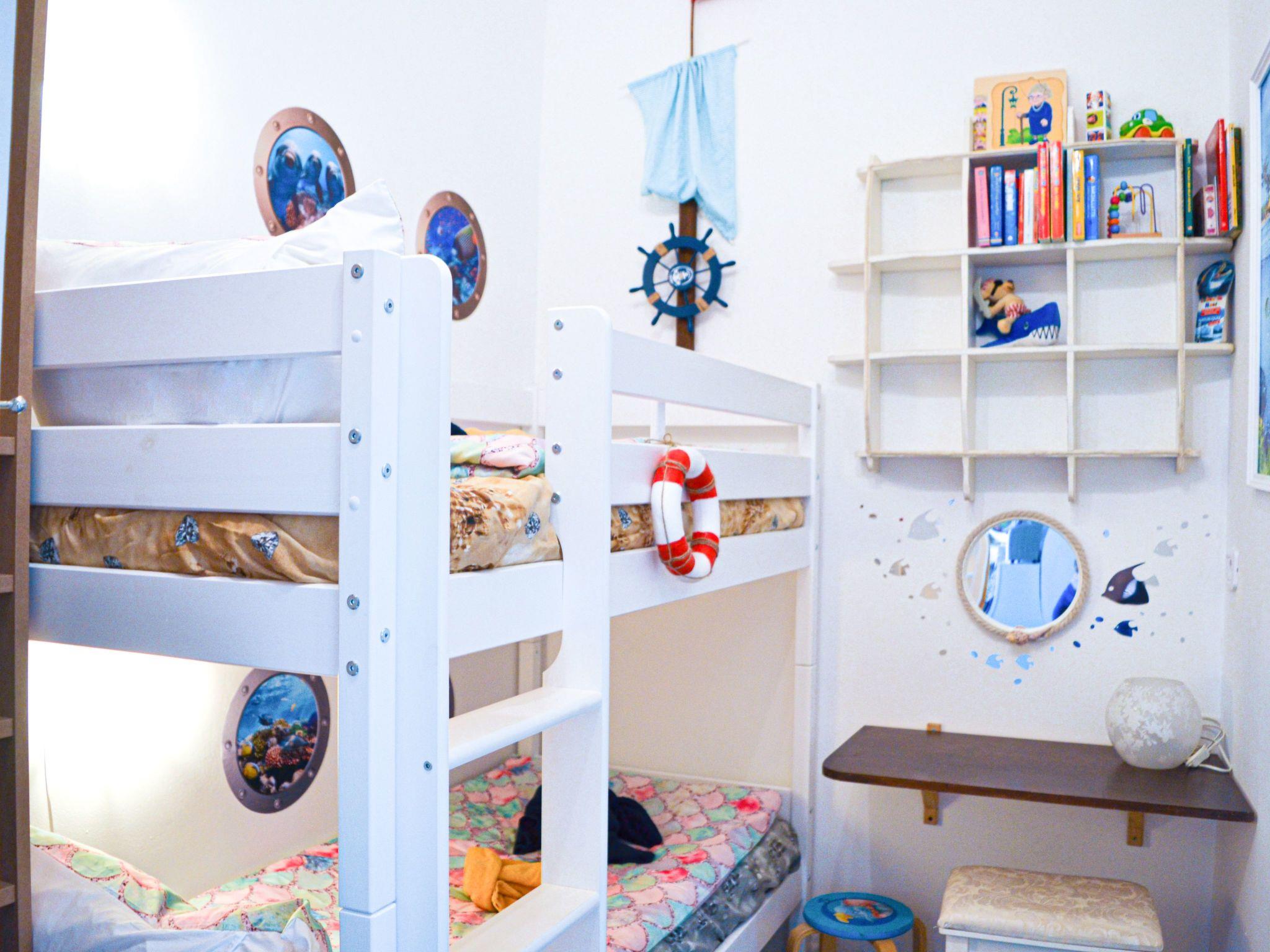 The bedroom itself is furnished with a double bed, two small bedside cabinets with a lamp and a wardrobe with two identical sides for storing clothes. There is also a practical vanity table with mirror and drawer for applying make-up and styling. As in the living room, we have decorated the bedroom with dried bouquets, among other things. It is possible to add a cot in the bedroom, and we are also happy to provide a high chair. Next door is the second bedroom, the children's room. It is decorated in the theme "Under the sea". There is a loft bed, which is suitable for children under the age of 12. A desk with a mirror and a shelf. There is also a small wardrobe.