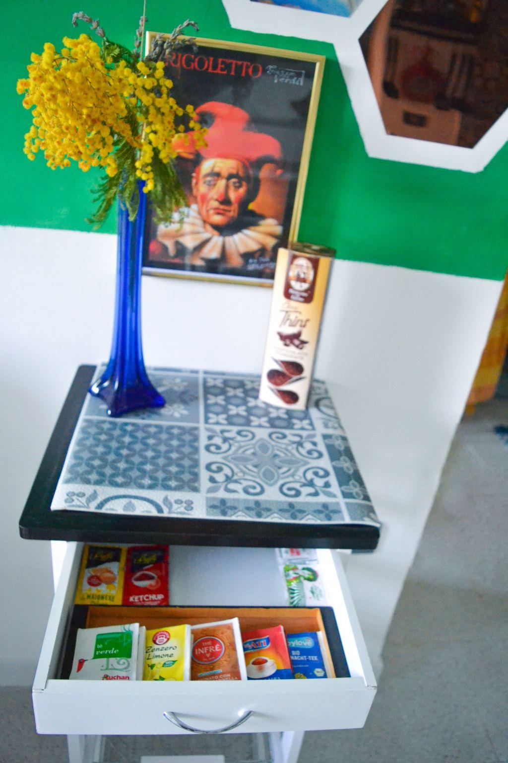 In the living room there is a large sofa for cosy relaxation in the evening in front of the TV or with a good book. We have put together a collection of information material about the Cilento for our guests. In addition to Rigoletto, we have decorated the room with lace blankets and porcelain. All objects are handmade in the region.