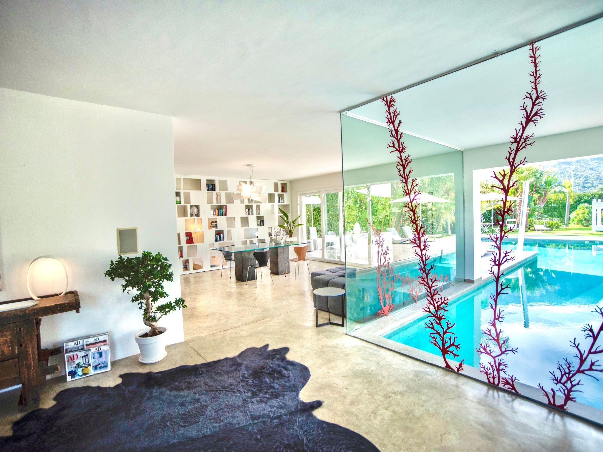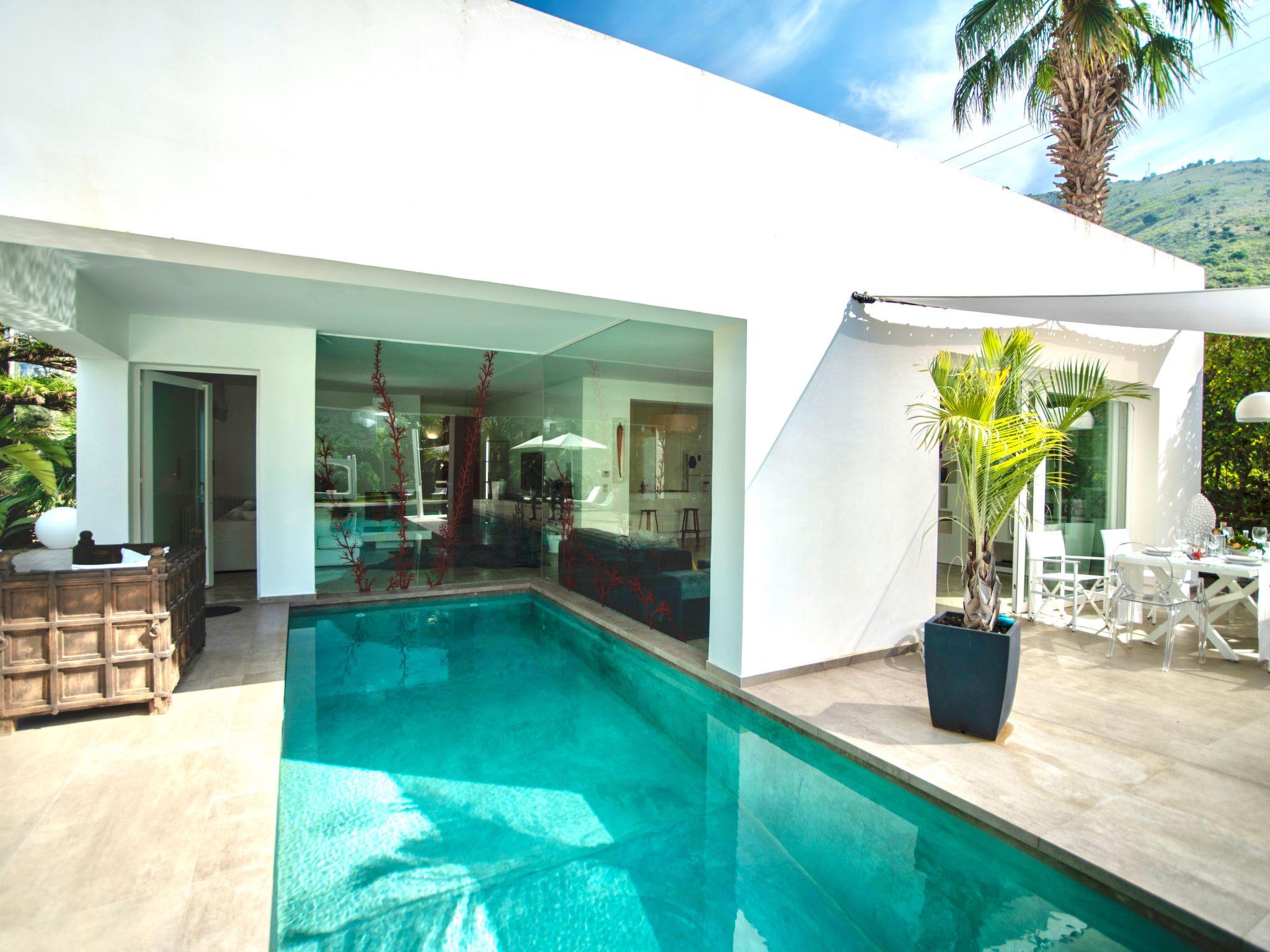 An elegant style is also evident in details, art pieces carefully arranged to emphasize the decorative impact and design furniture. The villa has two double bedrooms and two bathrooms. The master bedroom with en-suite recalls the essential and refined style that distinguishes every room. The bathroom has a particular shower/bath tub, always made with natural cement and it gives the place an exotic and elegant note at the same time.