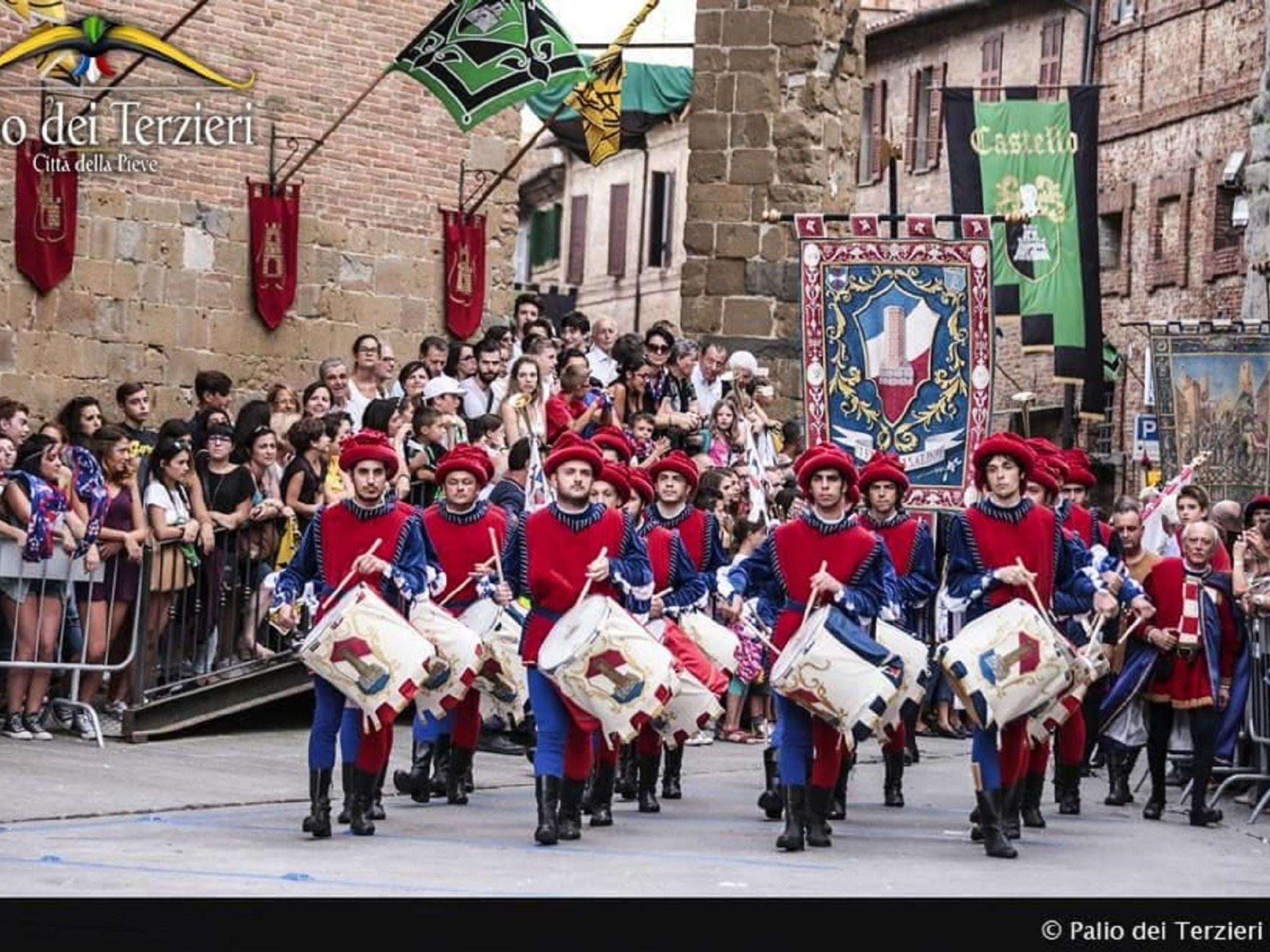 The recently renovated flat is located on the first floor, inside the walls, in the heart of the medieval village. It has independent heating, and is furnished in rustic style, with terracotta floors and chestnut-beamed ceiling, original from the 13th century. The entrance is American style, with a kitchen-living room, with a large wooden table with 6 chairs, a discrete hob, fridge, freezer, electric oven, television and radio-CD. There is the possibility to accommodate 2 extra persons on a sofa bed. There is a double sofa bed, a large built-in wardrobe with pots and pans and crockery. The bathroom has a large shower, washbasin, toilet and bidet. The room is furnished with two single beds that can be joined, a large built-in wardrobe in style, with bed linen and plenty of towels for the bathroom. The house is equipped with all modern facilities in order to make your stay as easy and pleasant as possible. When you arrive, you will find the house perfectly tidy and clean and you only have to enjoy your holiday. Cleaning of the flat is included and at the end of your holiday you do not have to do anything. All you have to do is leave the used linen (towels, sheets, etc.) on the table, with a "TO WASH" note. The maid will take care of everything. Città della Pieve is a medieval town surrounded by countryside. It is an excellent base from which to visit Umbria or Tuscany, while experiencing the peace and quiet of an unspoilt environment, but with all the comforts and entertainment such as tennis, swimming pools, football, golf, discos. In the house you will find news, directions and routes to restaurants and places to visit. In the entrance corridor, before the stairs, on the right, there is the cellar, which can be used in case of need. The flat, completely isolated from city noise and pollution, is ideal for those seeking relaxation and privacy. The house is located within the medieval walls, in a quiet area but at the same time very close to the main shops and the most characteristic restaurants. Moreover, the location is very well connected to the most famous wine itineraries along which many farms and farms produce and sell their products at competitive prices. From our house guests can drive to all the interesting historical cities such as Perugia (40 min.), Orvieto (30 min.), Rome (2 hours by car, but also conveniently by train, leaving from Chiusi railway station). Nearby are important spa and bathing resorts such as the Terme di Chianciano (30 min.), the Terme di San Casciano with its volcanic springs (30 min.) and Lake Trasimeno (30 min.) with its bathing beaches equipped for all water sports. The nearest seaside resort is Montalto di Castro, a 1 h 45 min. drive away. If you feel like driving a little further, you can reach the beautiful beaches of Argentario. During the month of August, 'Il Palio di S. Rocco' is held in Città della Pieve. The town goes back in time on the occasion of this grandiose festival that involves inhabitants and tourists alike. For 10 consecutive days, the organisers of the feast dress up in ancient mediaeval costumes and give life to the goliardic challenges between the knights. During this time, restaurants, inns and taverns offer dishes and recipes with ancient flavours.