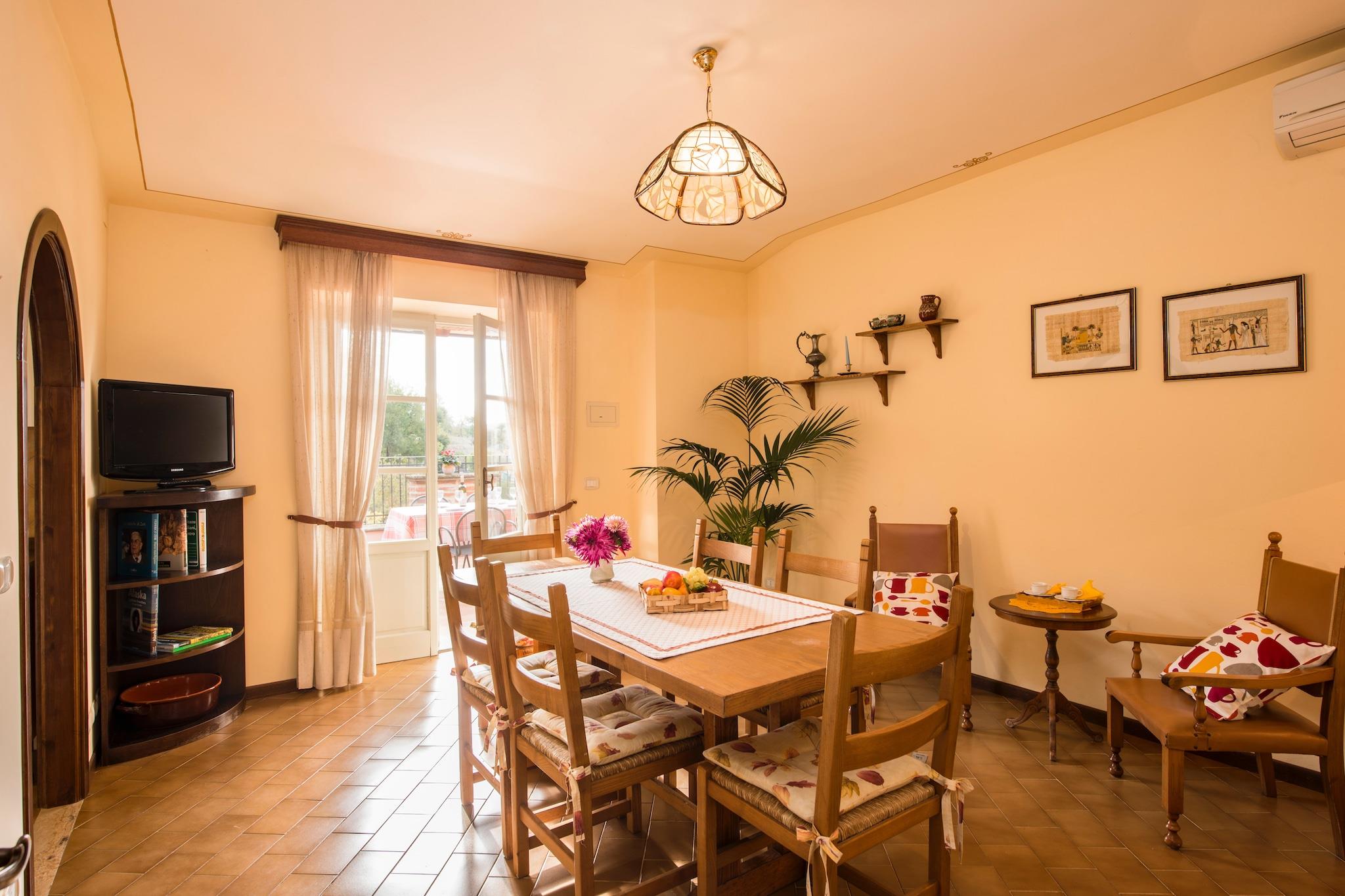 Dette bondehus med otte komfortable lejligheder ligger på grænsen mellem Umbrien og Toscana, nær Città della Pieve og Trasimenosøen. Den rustikke atmosfære er bevaret i restaureringen af lejlighederne. Agriturismoen producerer og sælger fremragende olivenolie, vin, pasta og honning. Indretningen er rustik og hyggelig. Lejligheden ligger på anden sal, og her finder du også den store overdækkede terrasse med en vidunderlig udsigt over Umbrien og Toscana! På terrassen kan du virkelig nyde din ferie. Der er en kæmpe swimmingpool med jacuzzi, omgivet af et stort solarium med liggestole og parasoller til gæsterne. Poolen er oplyst og kan derfor også bruges om aftenen. Ege og cypresser vokser i haven. Et fitnessrum, sauna og både indendørs og udendørs legeplads er tilgængeligt for gæsterne. Denne etruskiske region består af et smukt bakket landskab med fremragende udsigter og smukke byer. Udover at nyde swimmingpoolen og saunaen på gården, kan du tage på hyggelige ture til Città della Pieve, Perugia, Chiusi, Montepulciano, Pienza, Montalcino, Cortona, Arezzo og Siena. SEN CHECK-IN: Efter 19, ekstra gebyr EURO 50 Bemærk: Sauna Minimum belægning: 2 personer & Maksimum belægning: 5 personer.