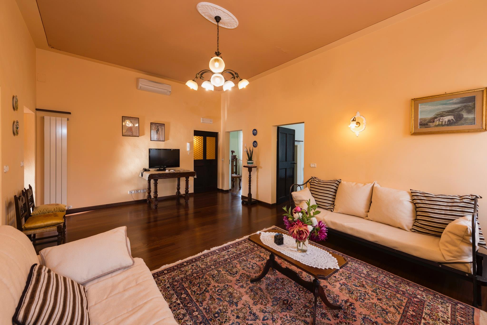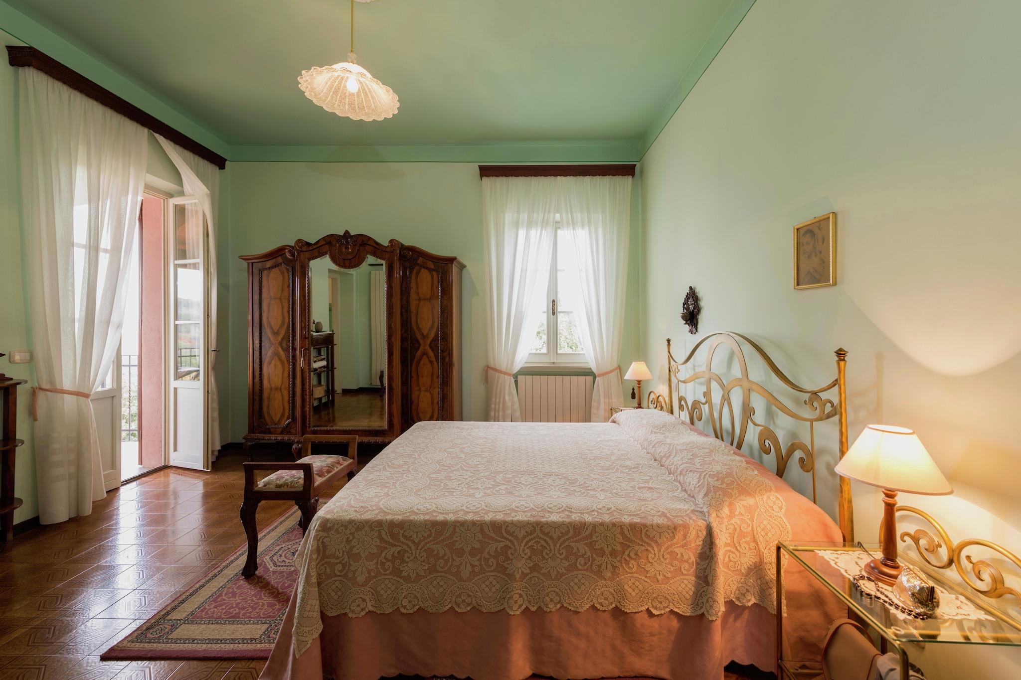 Dette raffinerede feriehus ligger kun 1,5 km fra det historiske centrum af Città della Pieve og har plads til op til ni gæster i komfort og stil. Den kæledyrsvenlige villa har aircondition og gratis Wi-Fi, hvilket sikrer en moderne og afslappende oplevelse. Kulturelle højdepunkter i nærheden inkluderer den surrealistiske LaScarzuola, en fantasifuld "idealby" skabt i et tidligere franciskanerkloster af arkitekten Tomaso Buzzi, og det middelalderlige Castello di Sarteano med en storslået udsigt. Kunstelskere vil sætte pris på Museo della Cattedrale, der er hjemsted for renæssancemesterværker. Naturelskere kan også udforske den omkringliggende skov eller tage en 15 km lang tur til Trasimenosøen for rolige udflugter langs søen. Køkkenet på tredje sal er rummeligt dimensioneret og udstyret med avancerede faciliteter, herunder espressomaskine, ovn, mikrobølgeovn, opvaskemaskine, køleskab med fryser, juicer og blender. En afslappet opholdsstue med både enkelt- og dobbeltsovesofaer, et tv og en radio giver komfortabel opholdsplads. Hvert af de tre værelser med aircondition har eget badeværelse, mens et spisekammer med vaskemaskine og flere møblerede terrasser tilføjer komfort og charme. Udendørs faciliteter inkluderer en indhegnet have med liggestole, grill, privat parkering og en fælles swimmingpool (åben maj-september). Fritidsmuligheder i massevis: legerum, fitnessrum, sauna, bordtennis, bordfodbold, gynger, alt sammen designet til at berige gæsteoplevelsen. Bemærk: Sauna Minimum belægning: 2 personer & Maksimum belægning: 5 personer. Città della Pieve er berømt for sin pulserende gastronomiske scene. Nærliggende kulinariske perler inkluderer TavernadelPerugino (rig umbrisk køkken) og den intime BistrotdelDuca, gemt i en middelalderlig gyde og elsket for sine sæsonbestemte retter, venlige service og lokale vine. Yderligere fremragende steder som Ristorante Silvana, LaTaverna del Barbacane og Caffè degli Artisti tilbyder autentisk regional mad. Uanset om du er tiltrukket af historiske steder, kulturel rigdom eller smagfuld gastronomi, tilbyder dette elegante tilflugtssted det perfekte udgangspunkt for en uforglemmelig umbrisk flugt.