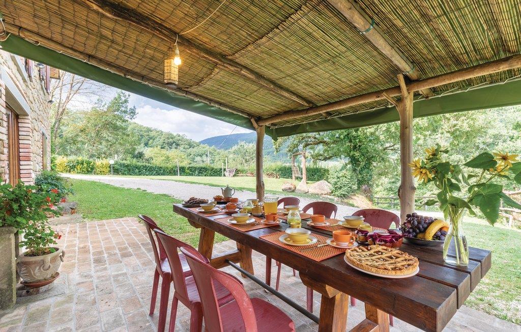 Præcist mellem Città di Castello og Cortona (hhv. 22 km) venter dette rustikke feriehus på jer med egen pool, i bakkerne. Over poolområdet kommer I fra husets side til dalen ind til stuen med køkken samt badeværelse med bruser. Fra bjergsiden kommer I igennem særskilte indgange på jordplan til de tre soveværelser med eget badeværelse og bruser hvert samt to hemse med dobbelt sovesofa i den ene, enkeltseng på den anden, igen med badeværelse og bruser til hver. Huset er i flere etager, der er forbundet via udendørs trapper (ingen indendørs trapper). Mod forespørgsel og betaling på stedet kan I leje et anneks med yderligere tre senge. Barneseng mod forespørgsel. Feriehuset hører til et landbrug, der ligger lidt højere end den lille landsby. Hos ejeren på stedet kan I købe friske grønsager, olivenolie og honning. Mod forespørgsel laver hun også lokale retter som pasta og vildsvin til jer i gårdens lille trattoria. De landlige omgivelser er ideelle til familier, der vil være tæt på naturen. I har en lille fiskedam til rådighed. Herfra kommer I godt til umbriske og toskanske byer som Città di Castello og Cortona (22 km), Arezzo, Perugia og Gubbio (ca 50 km). 1 km til S. Leo Bastia med dagligvarer, bar og post, 10 km til Trestina med alle slags butikker.