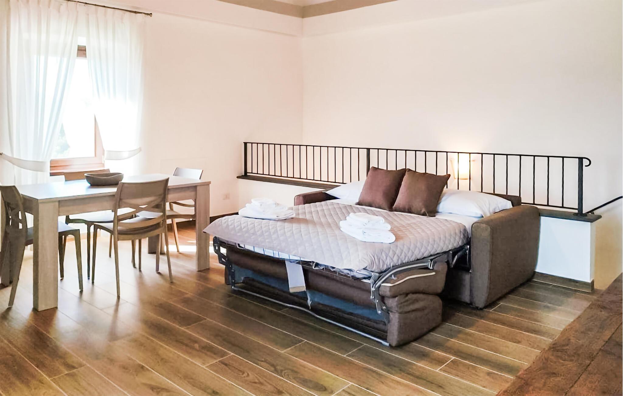 Tilbring afslappende dage i denne komfortable ferielejlighed med sauna og spabad. Denne smagfuldt møblerede ferielejlighed byder jer velkommen til en imponerende ejendom fra det 13. århundrede. Alt her er designet til afslapning. Et smagfuldt indrettet interiør med en behagelig atmosfære venter jer. Planlæg jeres aktiviteter over harmoniske måltider, snak i den behagelige sofa, og glæd jer til afslappende øjeblikke i spabadet eller saunaen. Lad jeres børn have en picnic på den store, fælles naturgrund, mens I nyder den fredelige atmosfære med en morgenmad udenfor eller nyder solnedgangen med et glas vin. Oplev den fascinerende magi i Civita di Bagnoregio – en historisk by, der malerisk ligger på et tufplateau. Vandr gennem de imponerende erosionslandskaber i Valle dei Calanchi, udforsk den underjordiske by og den imponerende katedral i Orvieto. Prøv fine vine på vingårdene nær Montefiascone, og bliv inspireret af den etruskiske historie i Tarquinia.
