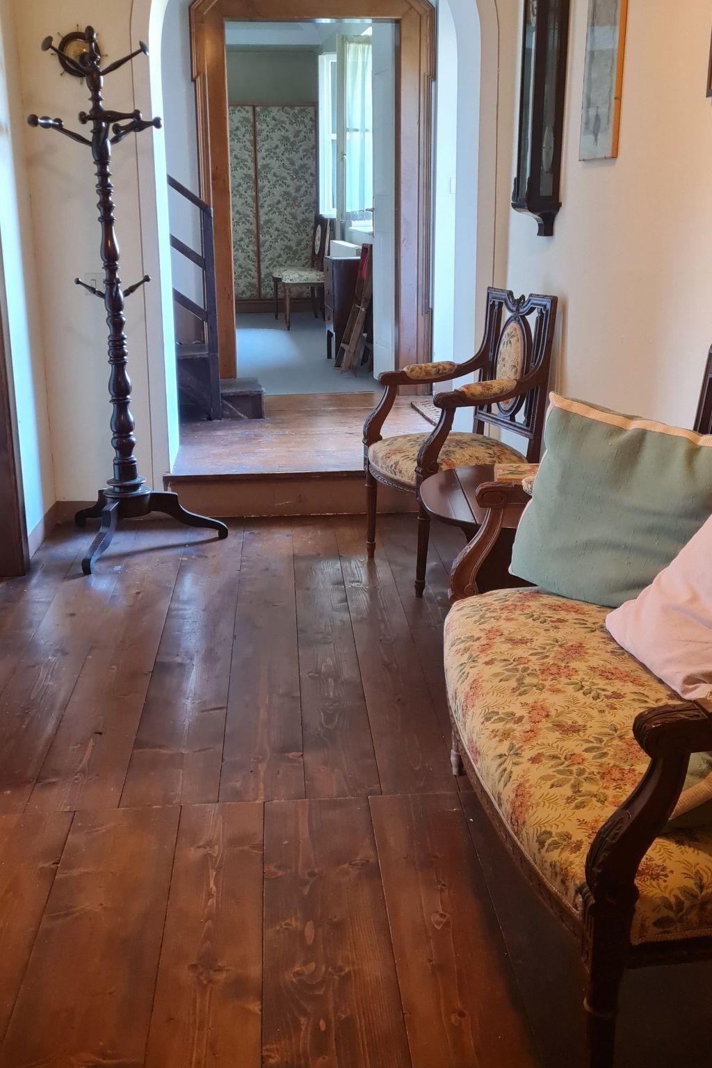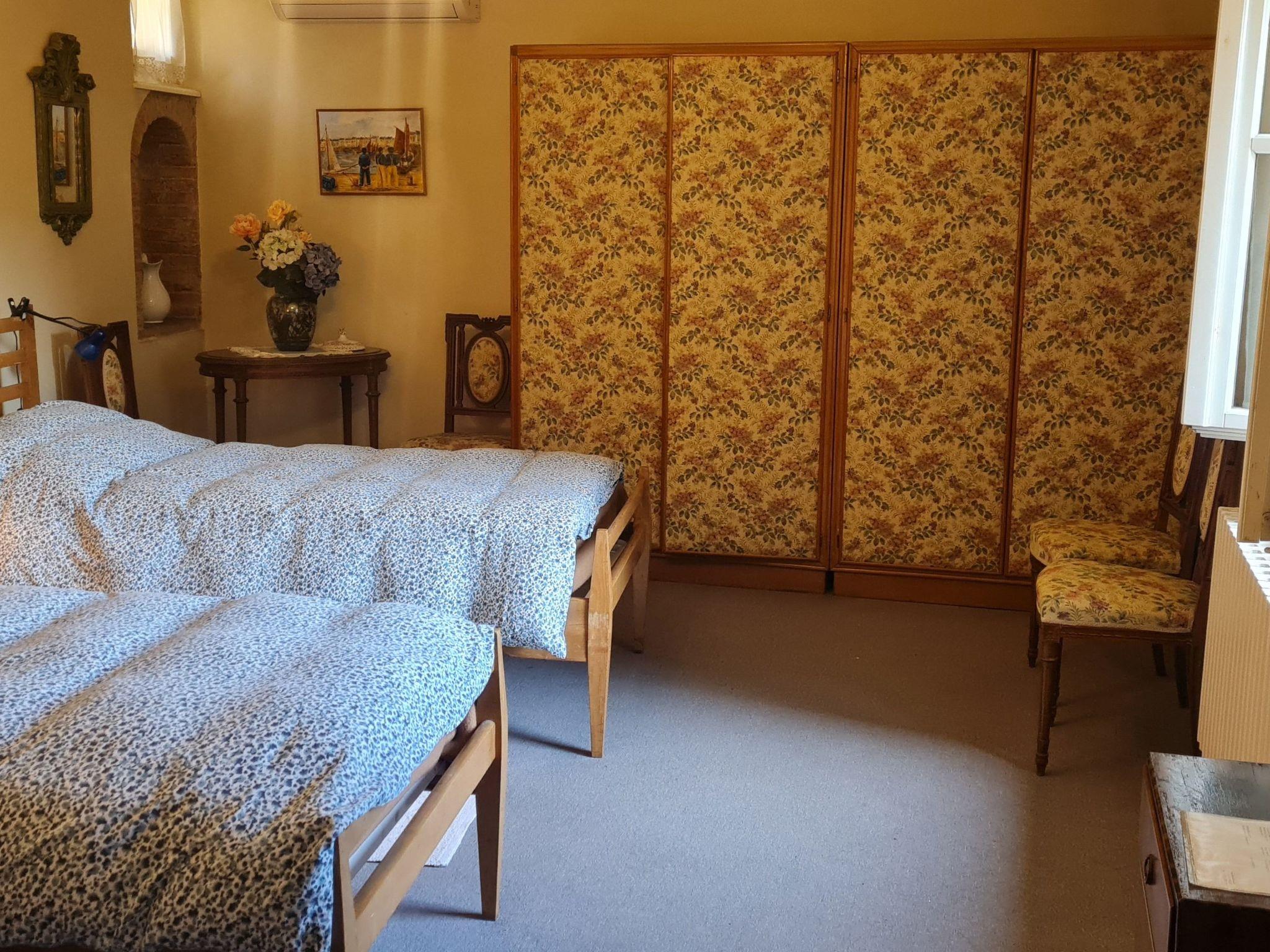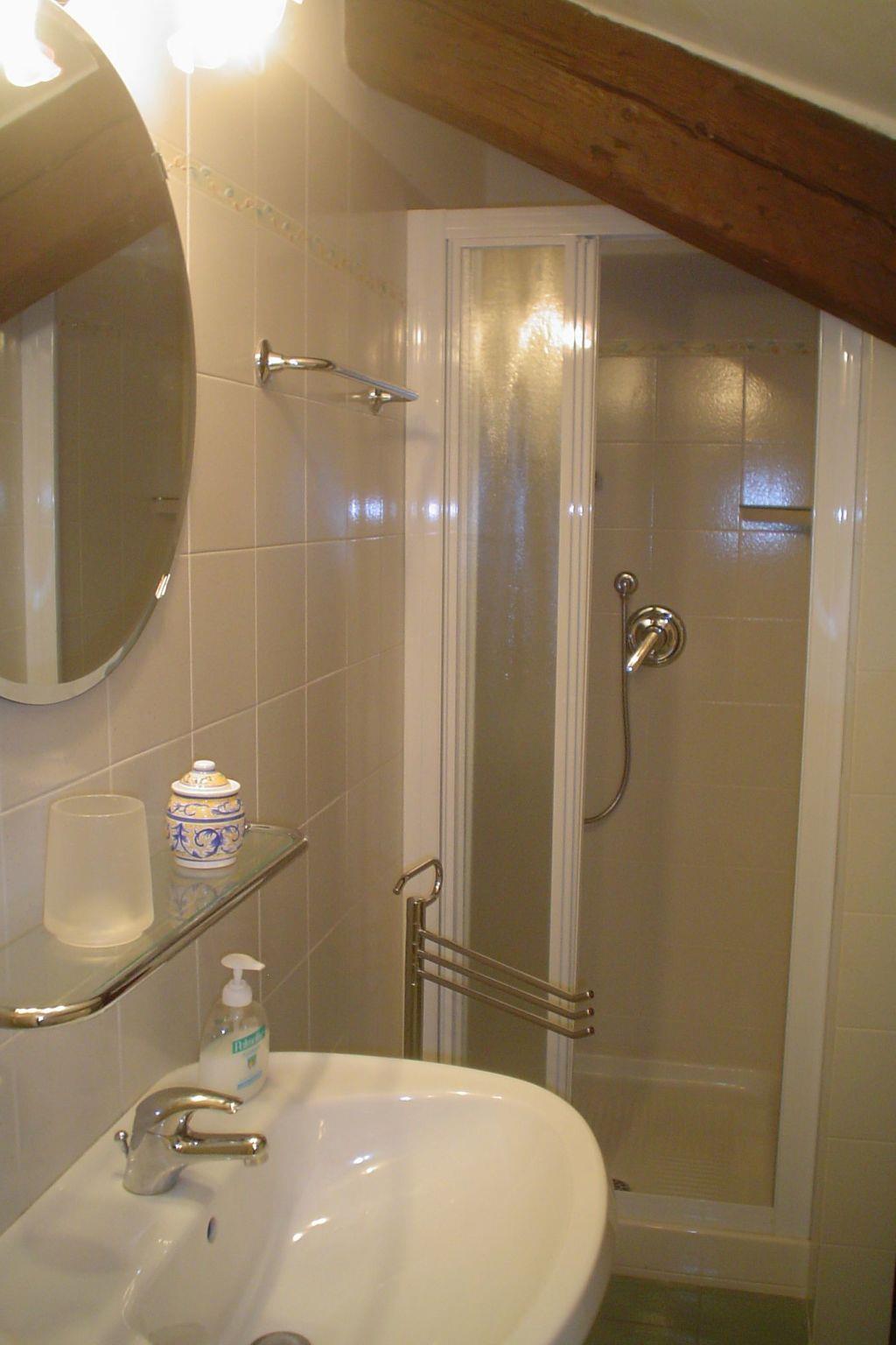 The flat is arranged on 3 floors: living room on the ground floor (30 sqm) with French windows and a view of the garden. A natural stone staircase leads to the 1st floor, where there is a kitchen (gas cooker, refrigerator, microwave, dishes and pots and pans), a double room (24 sq m) and a bathroom (bath/shower, bidet, WC). The small antique wooden staircase leads to the 2nd floor where the second bedroom (double room, 24sqm) and a second bathroom (shower, bidet, WC) are located. If necessary, a third bed can be added in the bedroom. A cot is also available. All rooms are very bright and offer views of the garden or the village rooftops. There is also some original antique furniture. Heating throughout the flat in winter, air conditioning in both bedrooms in summer.