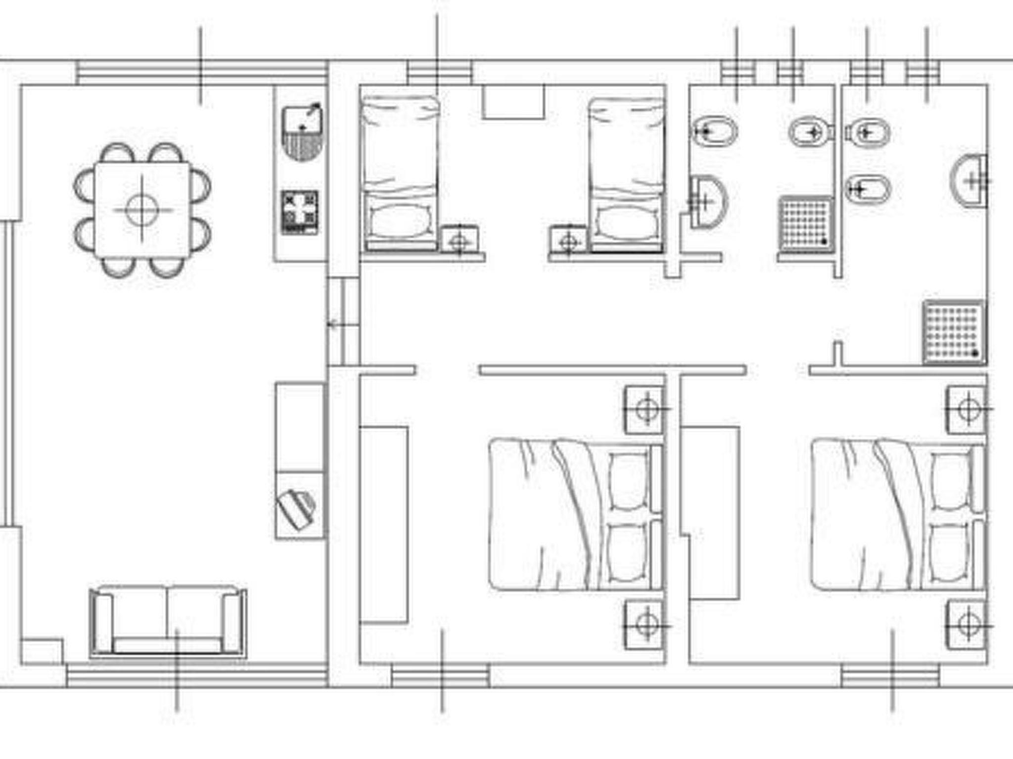 Detached house measuring 93 square metres. Large living room with kitchenette and double sofa bed, 2 double bedrooms, 1 twin bedroom and 2 bathrooms with shower.