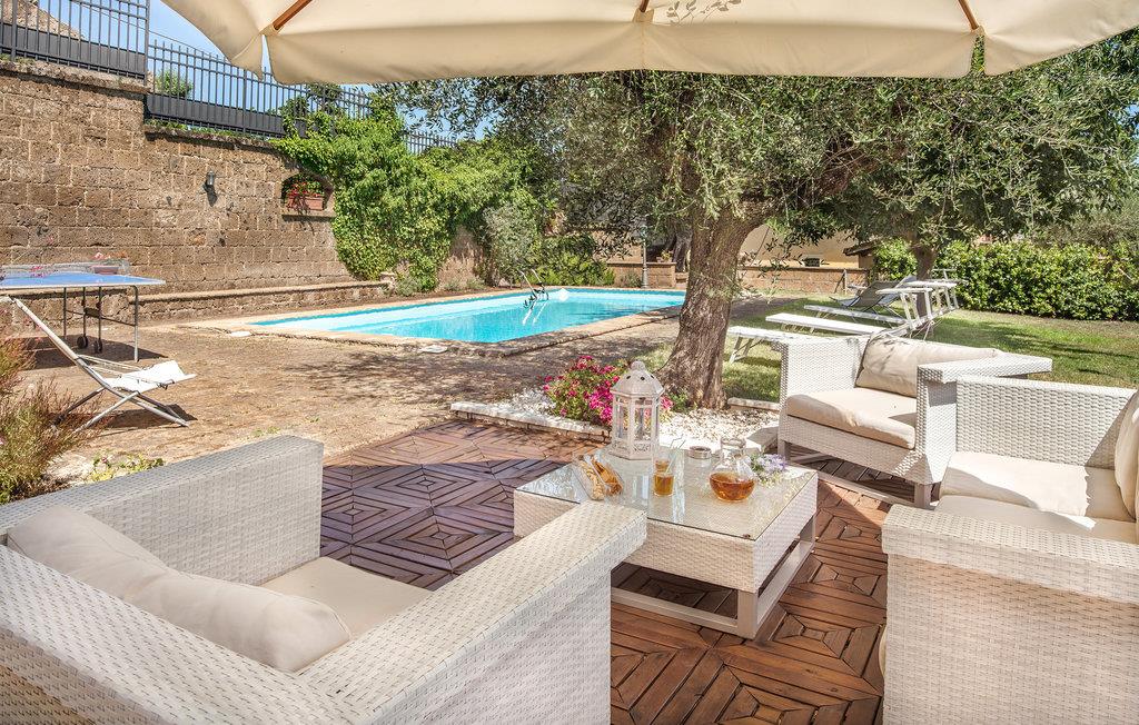 Huset ligger i et beskyttet sted og har en smuk panoramisk veranda med havemøbler, en grill og en ekstern ovn. Alle værelser har aircondition og er pænt dekoreret. Ejendommen er helt indhegnet og omgivet af en velholdt have.