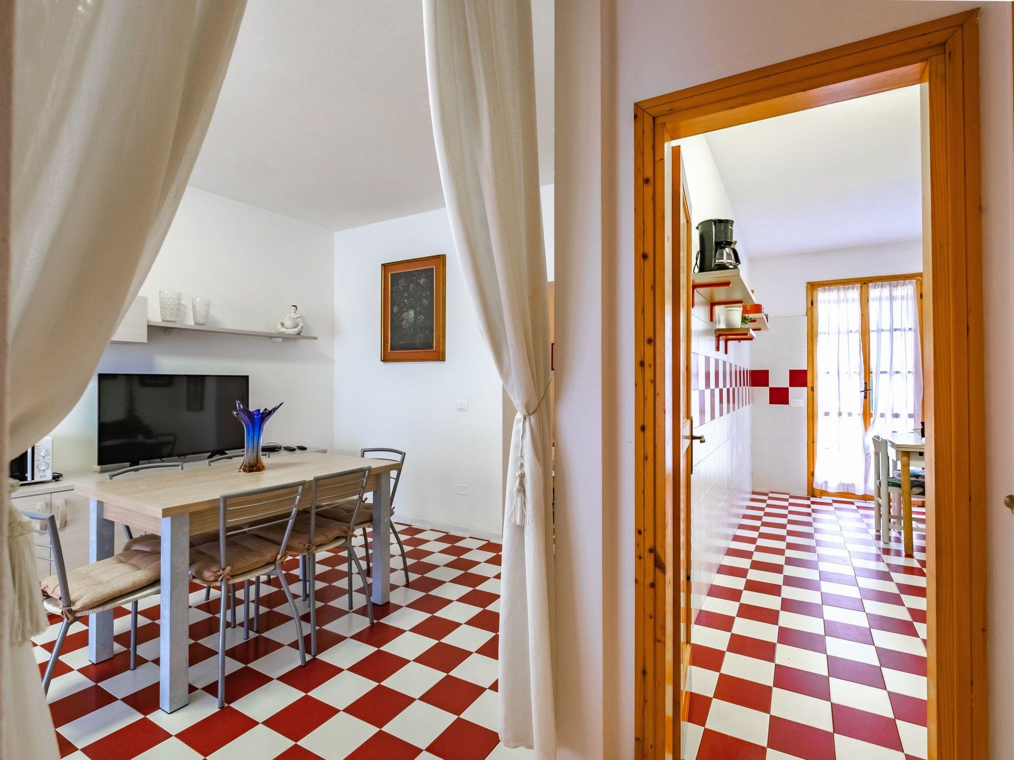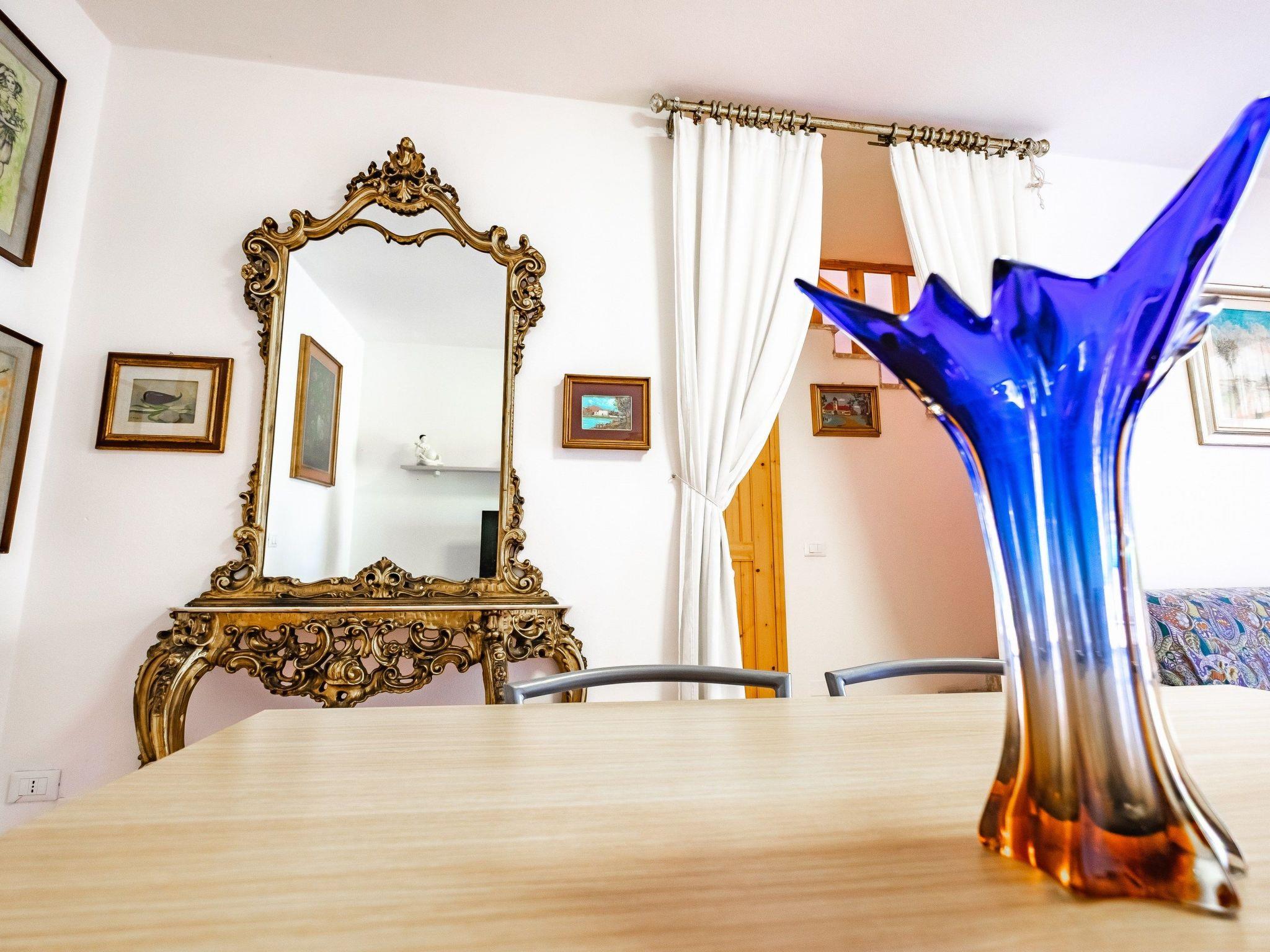 This four-roomed villa is structured vertically, with an entrance and 2 independent gardens and a spacious patio with a fireplace.Internally it is composed as follows: on the ground floor there is a spacious living room with a double sofa bed, a separate kitchen (with exit to the second garden), 1 bedroom with two singles and a service bathroom in the basement. On the 1st floor there are two double bedrooms both with terrace and a bathroom with shower.