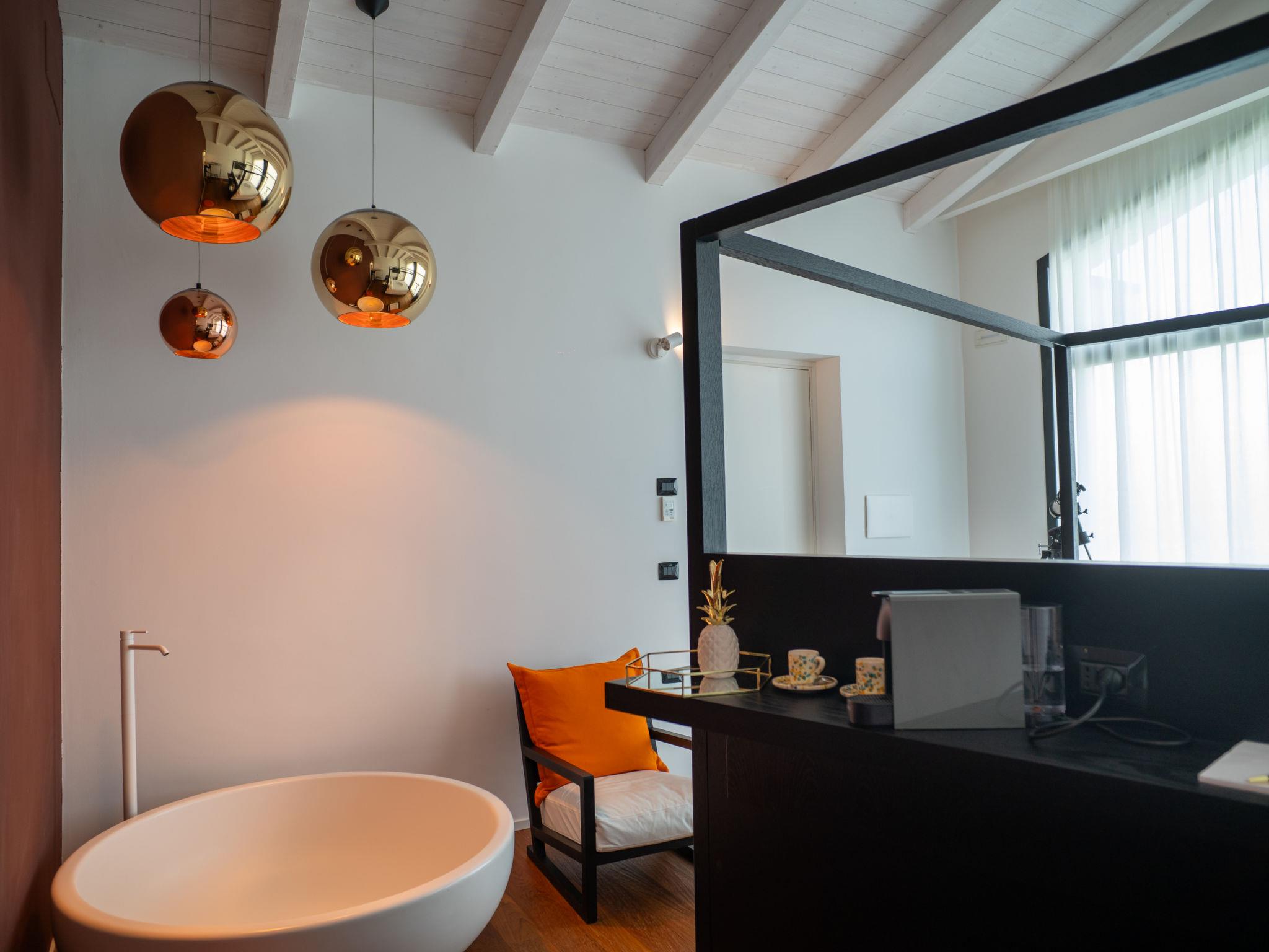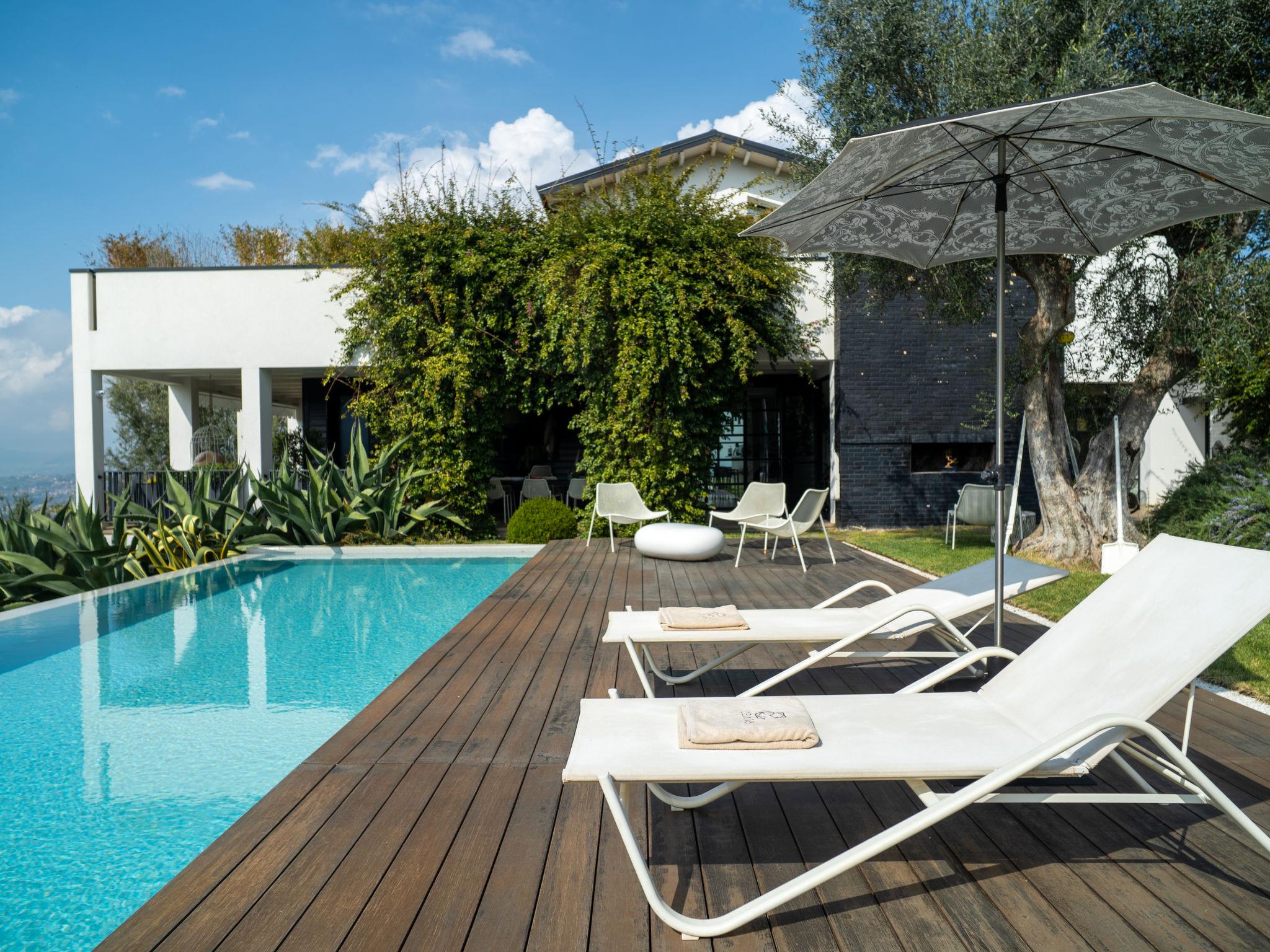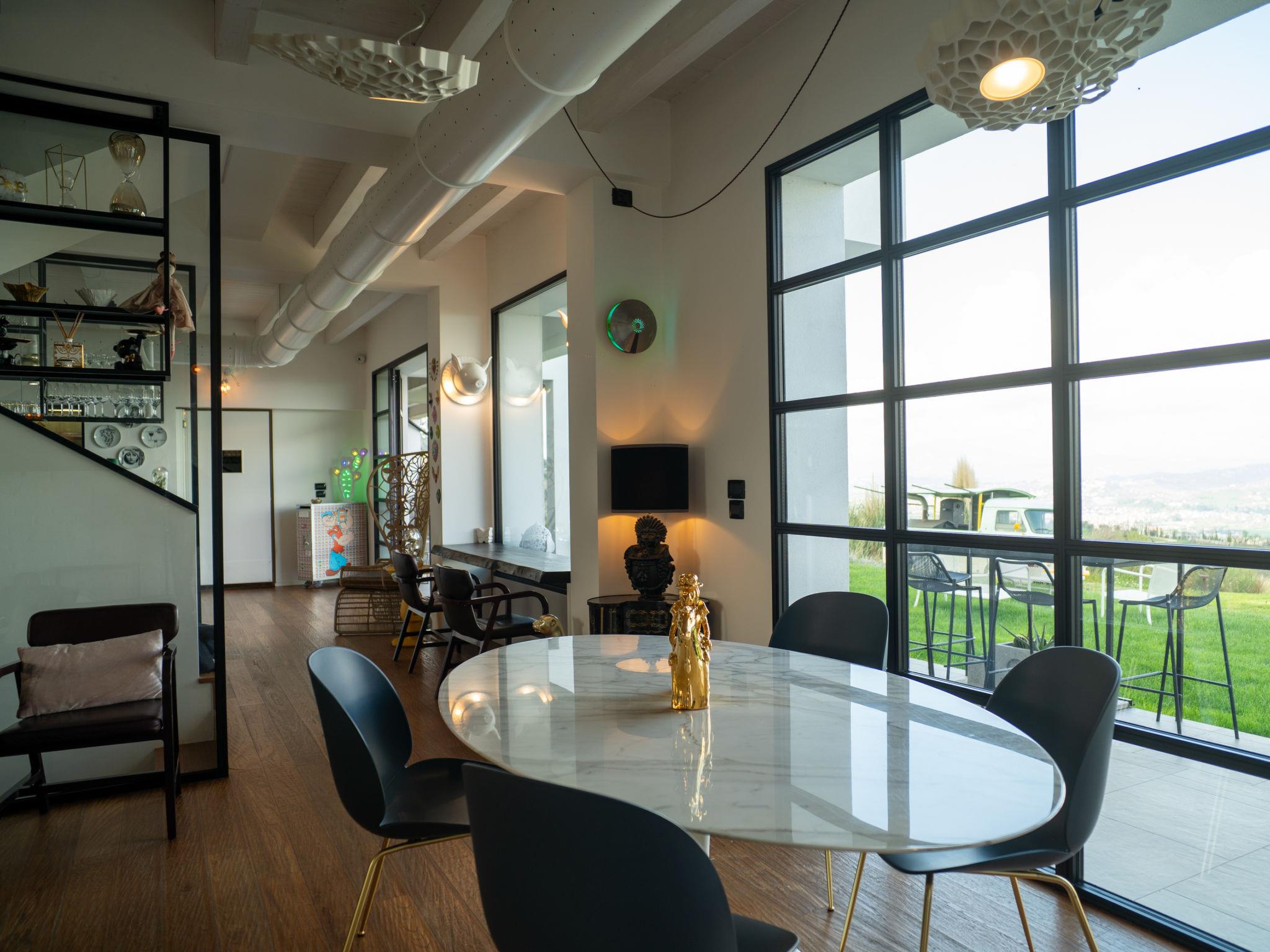 "Idea 18", 6-room villa 300 m2 on 2 levels. Spacious and bright, modern and stylish furnishings: living/dining room with panoramic window with open-hearth fireplace, dining table, TV and air conditioning. Exit to the garden, to the swimming pool. 3 rooms, each room with 1 double bed and TV. Exit to the garden. Large kitchen (5 induction hot plates, kettle, microwave, freezer, electric coffee machine, Capsules for coffee machine (6) free, cooking island). Bathroom, 3 showers/bidet/WC. Air-conditioning. Upper floor: 1 room with 1 double bed, open-hearth fireplace, with corner bath and TV. Exit to the terrace. 1 room with panoramic window with 1 double bed, with corner bath and TV. 2 baths/bidet/WC. Air-conditioning, forced-air heating. Large terrace roofed, large garden. Terrace furniture, deck chairs. Very beautiful panoramic view of the valley. Facilities: children's high chair, baby cot for up to 2 year olds, hair dryer. Internet (WiFi, free). Parking. Please note: maximum 2 pets/ dogs allowed. Private entrance, smoke alarm, fire extinguisher. IT067020B9MCP8CARV