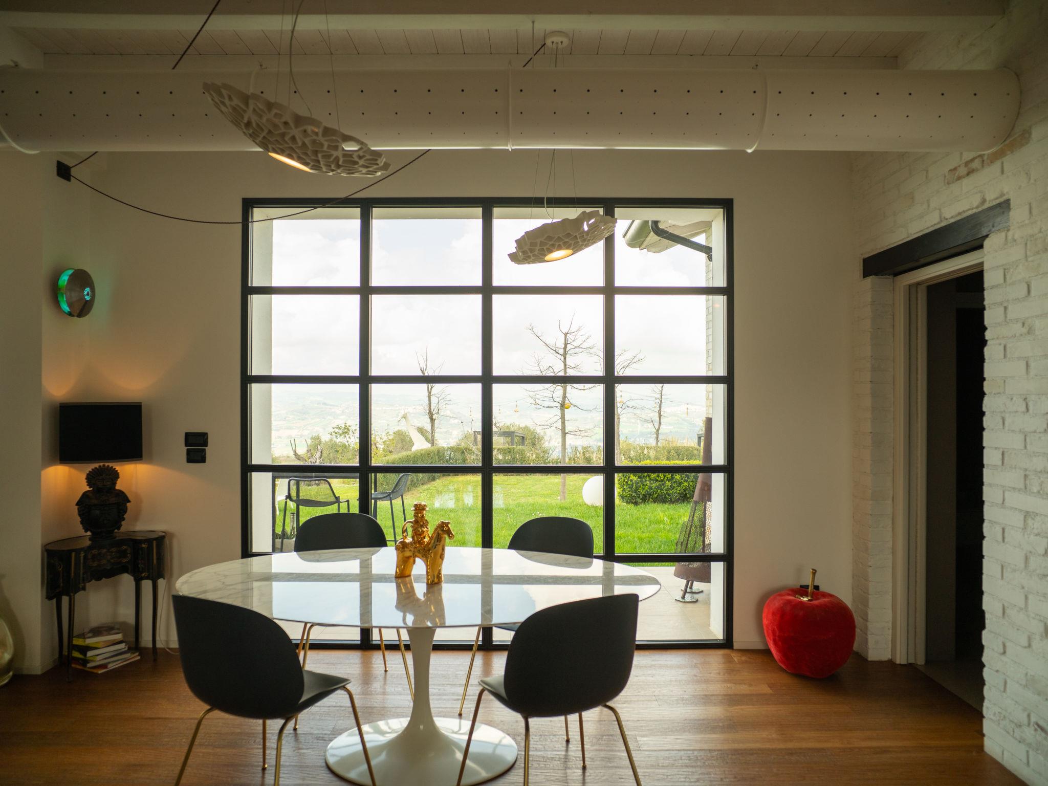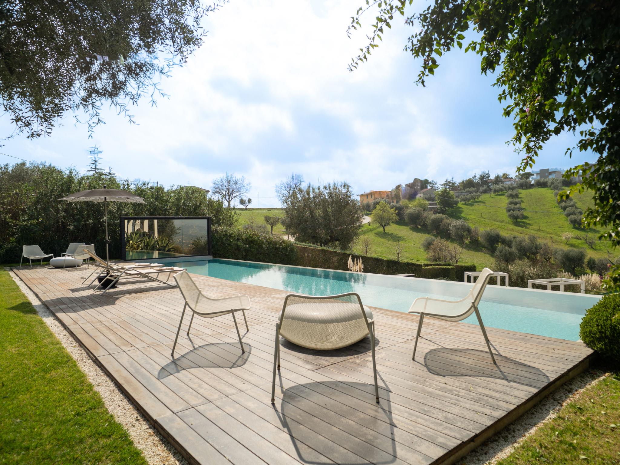 Modern, luxurious villa "Idea 18", 2 storeys, detached, surrounded by meadows, fields and vineyards. In the district of Controguerra 17 km from the centre of San Benedetto, 11 km from the centre of Martinsicuro, on a slope, excellent location: right in the centre but still quiet, 11 km from the sea, 11 km from the beach. Private: park, beautiful garden to relax, swimming pool with privacy (18 x 4 m, depth 140 - 140 cm, seasonal availability: 01.May. - 30.Oct.). Outdoor shower, garden furniture, barbecue, pool maintenance by the owner/gardener. In the house: air conditioning, laundry. Linen change weekly. Towel change weekly. Room cleaning on request (extra). House maid daily on request. Cook on request (extra). Pre-arrival grocery service. Parking (for 5 cars) at the house. Supermarket 1 km, restaurant 1 km, bar, bus stop 300 m, railway station "Porto d'Ascoli" 15 km, sandy beach 11 km. Sports harbour 15 km. Nearby attractions: Riserva Naturale Regionale Sentina 14 km, Fortezza Medievale Acquaviva Picena 16 km, Mummie di Monsampolo 10 km. Please note: car recommended. Groups of teenagers on request only. Cooking courses bookable on request.