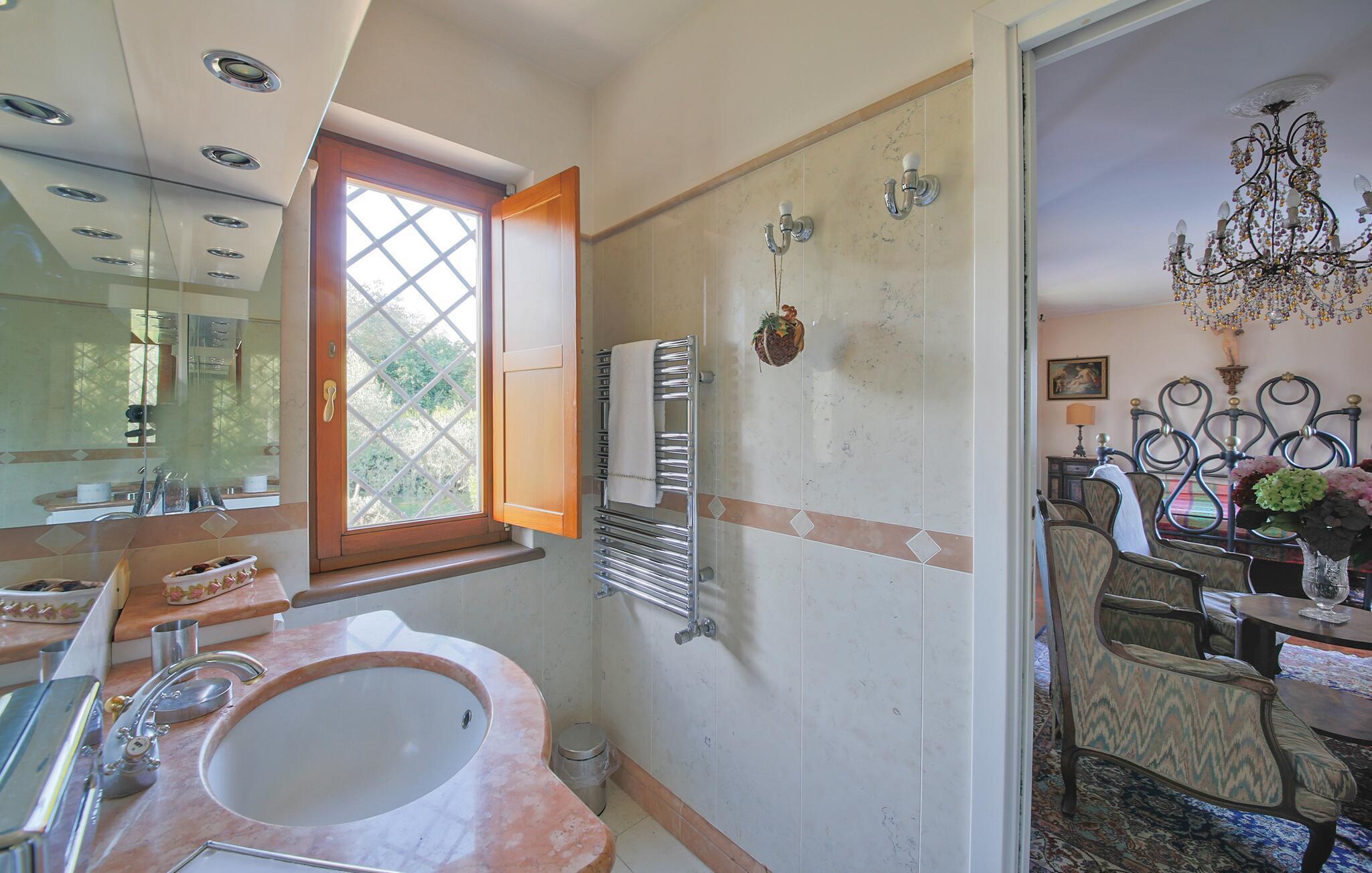 Dejligt og charmerende moderne ejendom, et herrehus, en sidebygning og poolhuset. Ejendommen ligger i kanten af den antikke by Corchiano med etruskiske rødder. Byen ligger i Etruriens grønne bakker, en område med mange nøddebuske og olivelunde. Fremragende udgangspunkt for at se de vigtigste seværdigheder i det nordlige Latium. Huset der er helt indhegnet ligger på en stor grund med hasselbuske, oliven- og frugttræer og er omgivet af store plæner. Her er pool og poolhus med omklædningsrum og brusebad. I det store lysthus er der et bord til 12 personer, træfyret ovn, grill og køkken (med køleskab, opvaskemaskine og ismaskine) perfekt til at tilberede lækre måltider, der spises helt friske under åben himmel. Sidebygningen ligger lige ved villaen, men ændrer ikke på at her er høj grad af privatsfære. Rolige omgivelser, udsigt over haven og Mote Soratte, samt Monti della Sabina i det fjerne. I nærheden af Corchiano kan I købe egnenes typiske lokale produkter. Ankomst mellem 18.30 og 20.00. Afrejse før 9.00. Fire timers rengøring incl. lejen. Der er ca. 20 km markerede vandreruter i området. Der er 65 km til Rom. Hvis I vil have en dukkert, kan I enten køre til Lago di Vico (20 km) eller strandene på Latiumkysten (ca. 70 km).