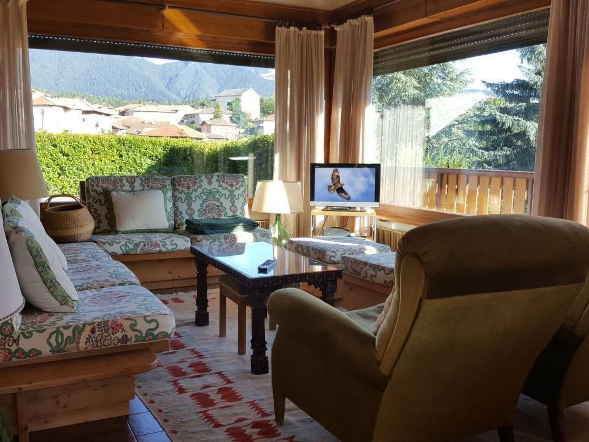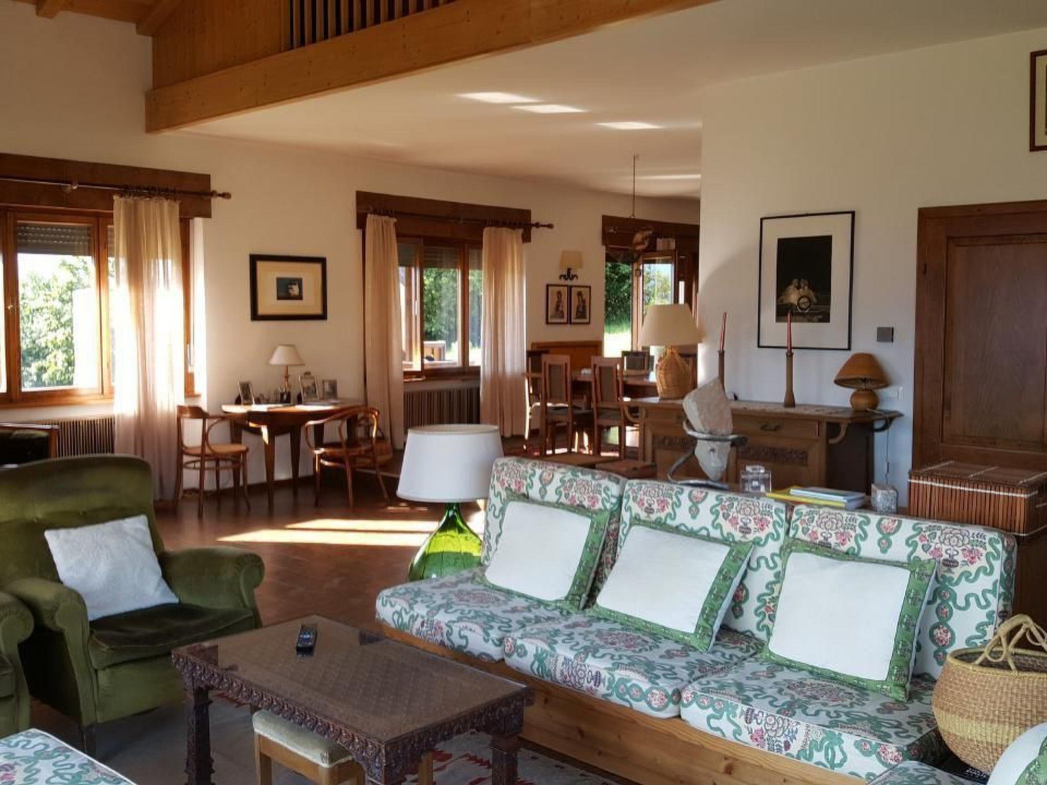 It has an area of 230 square metres and consists of a triple living room with large panoramic windows, equipped with a sofa area with TV, a fireplace corner, a dining table and a large kitchen equipped with a bar counter. Three double rooms with dedicated bathroom, including a romantic suite with TV and view of the large lawn and the village of Tres. On the ground floor there is a garage and a laundry room. Two mountain bikes and a baby cot are provided. Around the house there is a sun terrace, a balcony and a porch with a table for outdoor dining in front of the mountains. The garden and lawn of about 3,500 square metres surround the house.