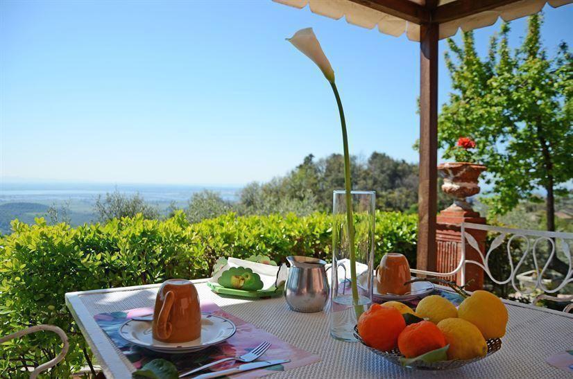The approx. 100 m² holiday flat is a one-storey building and has one bedroom with a double bed (160 cm x 190 cm) and one bedroom with two single beds (each 80 cm x 190 cm). The bathroom is equipped with a shower. The living area is equipped with a fireplace, TV (satellite) and a sofa bed (130 cm x 180 cm) on which two children can sleep, as well as a dining area and a kitchen equipped with a gas cooker, microwave, coffee machine, toaster, kettle, dishwasher and refrigerator with freezer. The outdoor patio, for exclusive use, with a gazebo table and chairs and a sofa is a comfortable and charming space with a view sweeping from the sea to the lake and the hills. Casa Cecilia is part of an ancient hamlet dating back to the 1600s that includes, in addition to the main villa, two other guest annexes. Inside the estate there is a vast olive grove and a swimming pool, shared with the guests of the other two dependances.