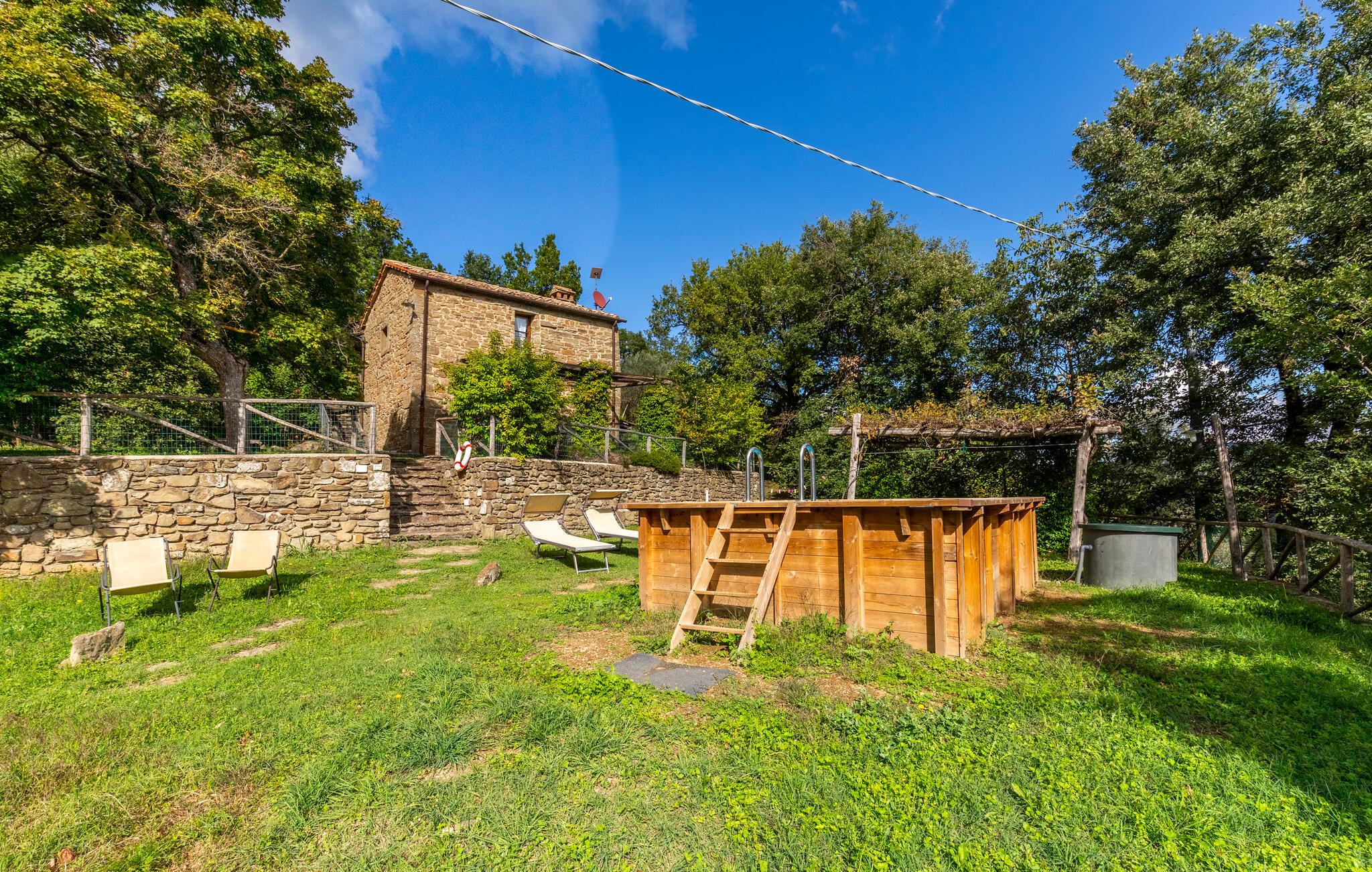 Uspoleret feriehus af natursten, i et roligt bakket landskab omgivet af dybe skove. I stuen i åben kombination med køkkenet er der en romantisk siddeplads, med grill og en stenovn. På grunden er der et svømmebassin der står på jorden, parat til afkøling. Klimaanlæg i soveværelserne. Nær mange udflugtsmål som Lago Trasimeno med sandstrande (35 km), Arezzo (30 km), Montepulciano (45 km), Città di Castello (35 km), Castiglion Fiorentino (18 km) og Cortona (25 km). Den 4,3 km lange grusvej til huset med kurver og niveauforskelle er kun egnet til 4x4 køretøjer.