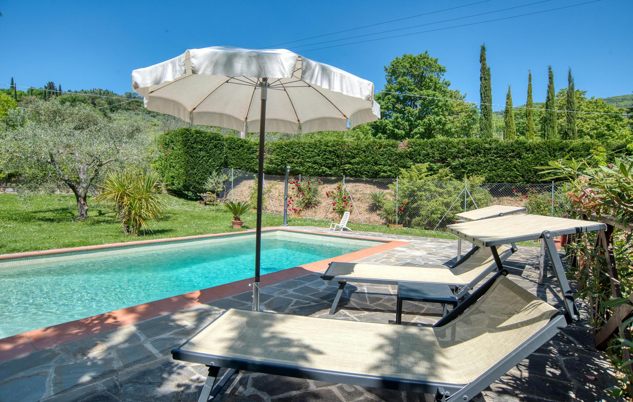 Der er et ekstra wc og en udendørs bruser ved poolen. Foran huset finder I en overdækket terrasse med grill og udsigt til den grønne sidedal. Udflugtsmål: Arezzo (35 km), Montepulciano (30 km), Pienza (40 km) og Lago Trasimeno (15 km). Den livlige etruskerby Cortona med Trattorien, barer, butikker, museer og gallerier samt en livligt marked en gang om ugen 4 km.