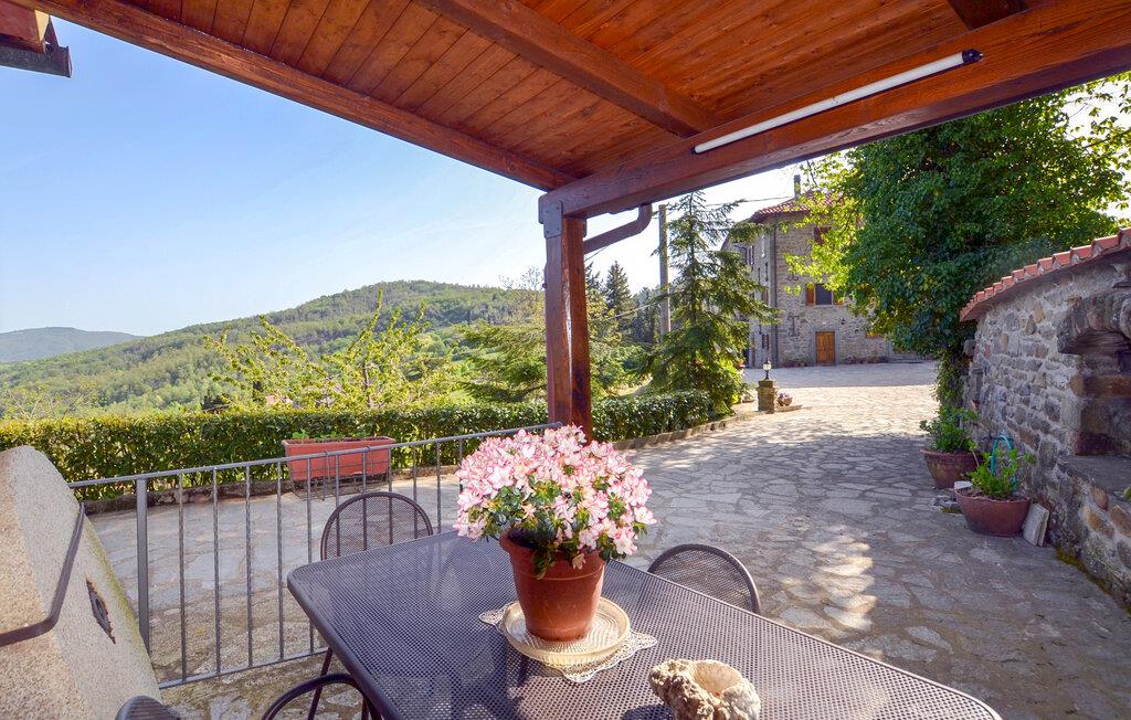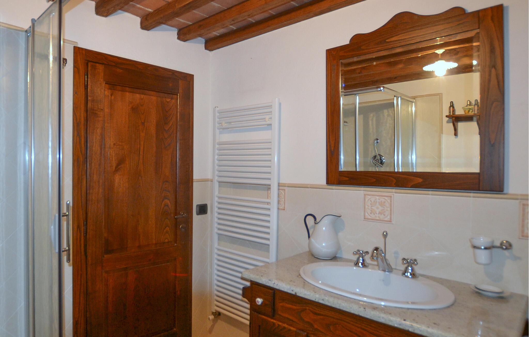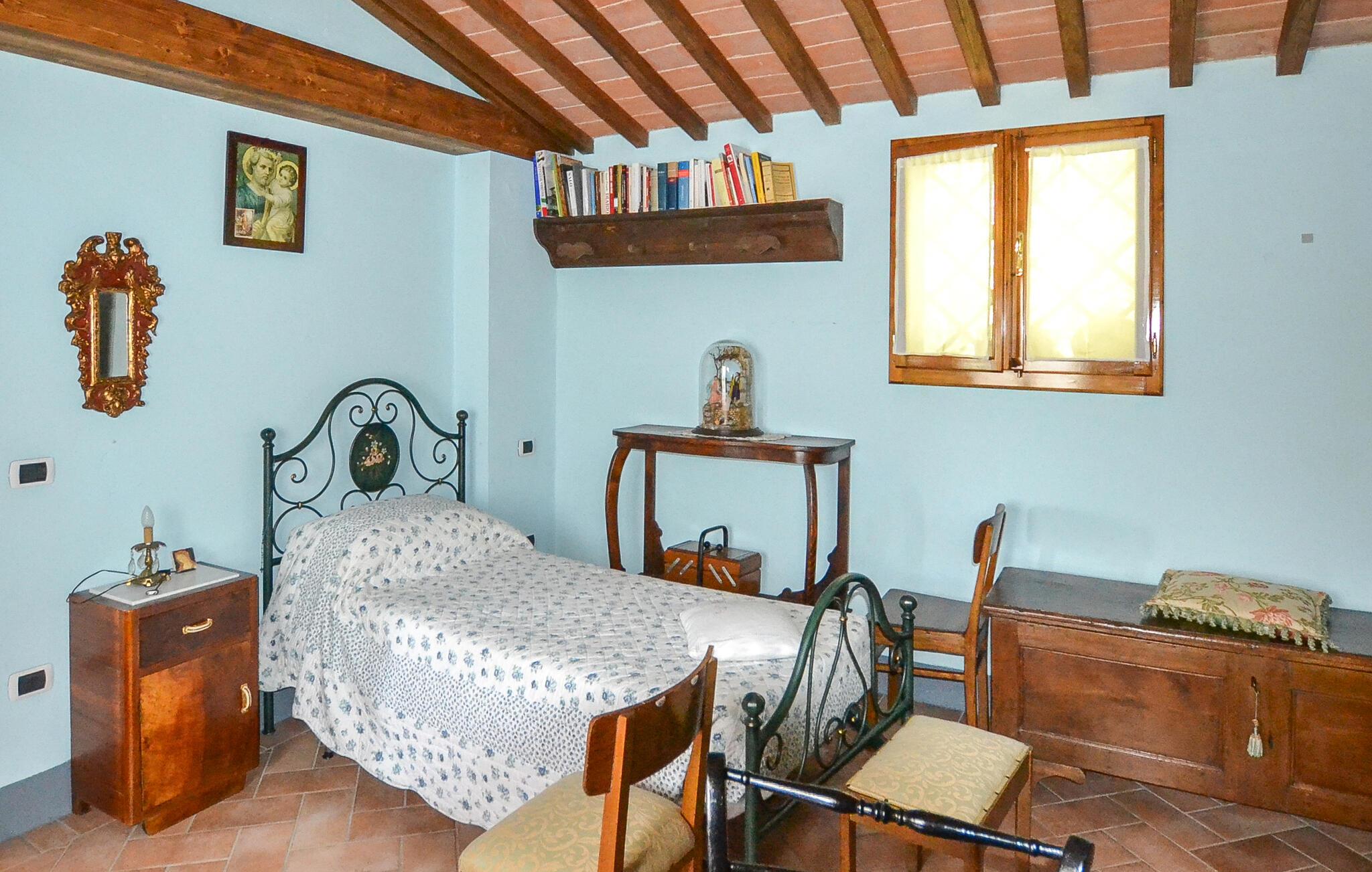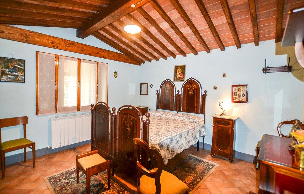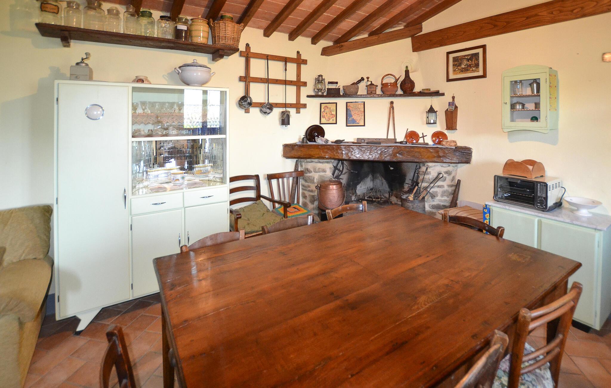 De velindrettede værelser med klassiske træbjælkelofter og en åben pejs skaber en varm og indbydende atmosfære. I kan tilberede lækre måltider i det fuldt udstyrede køkken, som I derefter kan nyde på den hyggelige, overdækkede terrasse med udsigt over de bølgende bakker. Huset tilbyder jer en perfekt blanding af komfort og traditionel toscansk stemning.
