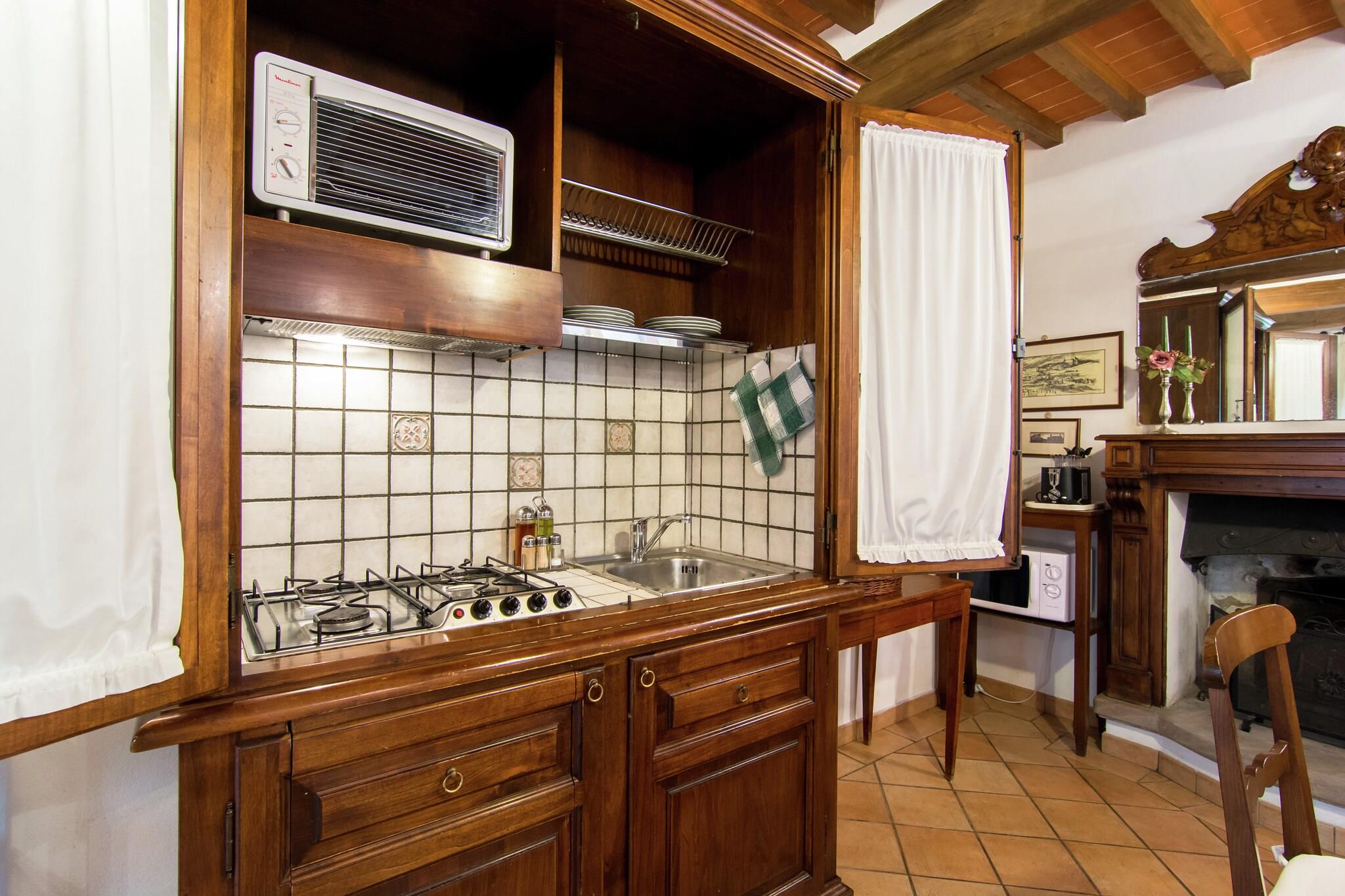 Dette fredfyldte feriehus med 2 soveværelser ligger i Cortona. Den er ideel til en familie eller venner, den kan nemt rumme 3 personer. Det tilbyder en fælles swimmingpool og privat terrasse, som du kan slappe af og nyde maksimalt._x000D_ _x000D_ Prøv de lokale delikatesser i restauranterne, der ligger 1 km væk. Søen ligger kun 10 km fra byen. Opbevar dine fornødenheder fra supermarkederne kun 3 km fra dit hjem. Planlæg en udendørs dag med dine kære på golfbanen, 15 km væk._x000D_ _x000D_ Eksperimenter med dine kulinariske færdigheder i grillen eller det åbne køkken, og nyd det i haven med møbler. Aircondition, pejs og centralvarme er på plads for din bekvemmelighed. En tennisbane og cykler er til rådighed for at holde dit ophold behageligt. Du kan medbringe 2 kæledyr for at overnatte mod et gebyr på 1,43/kæledyr/nat._x000D_