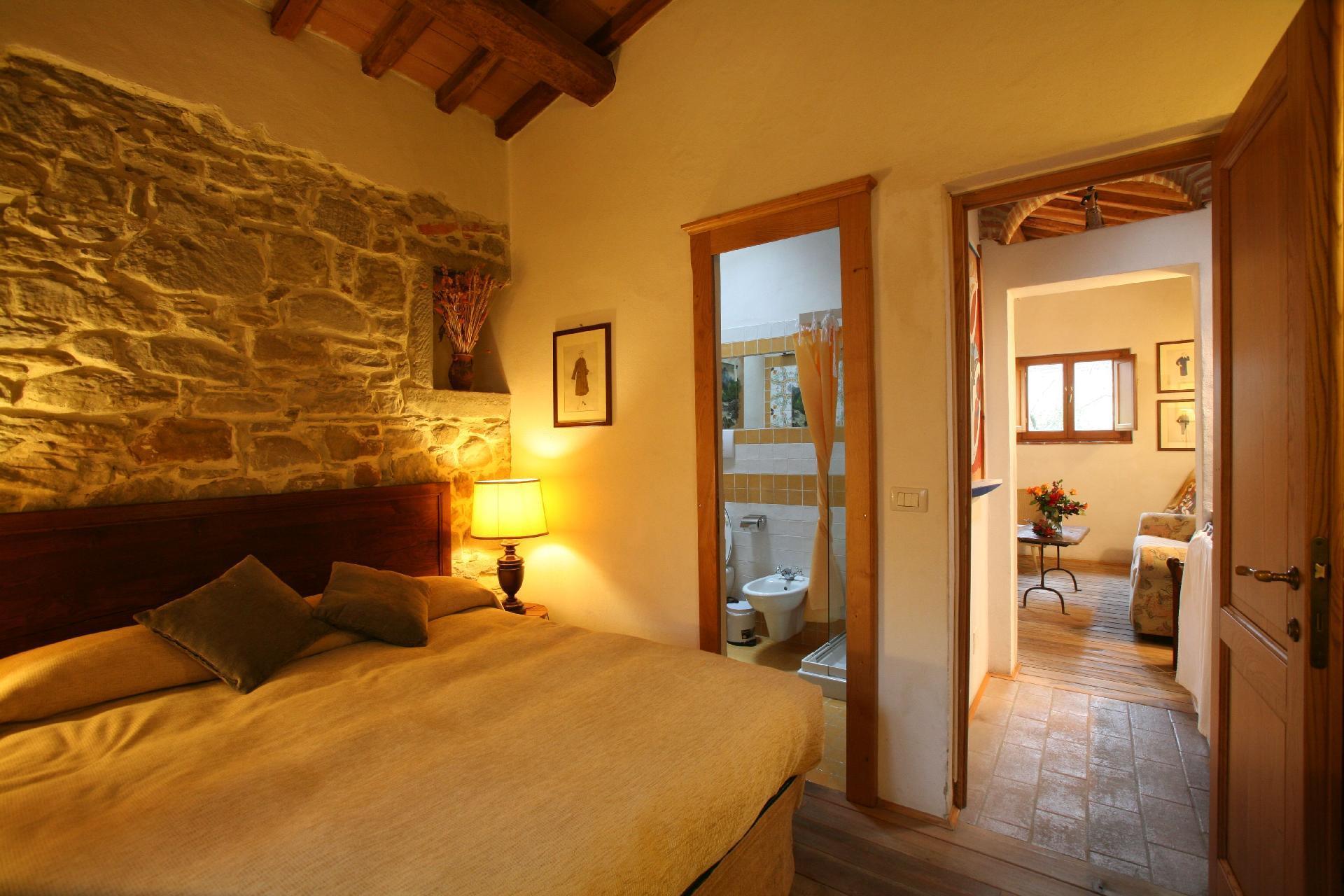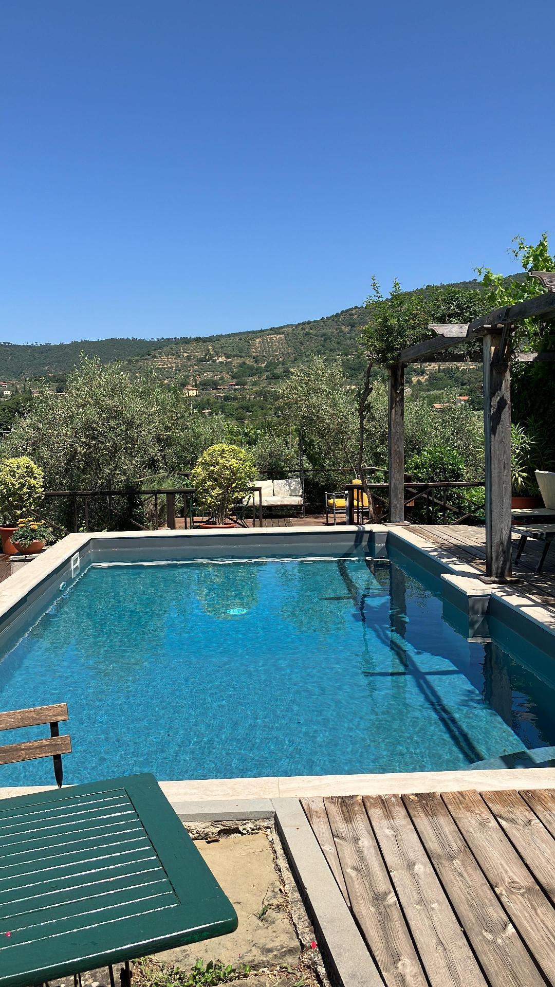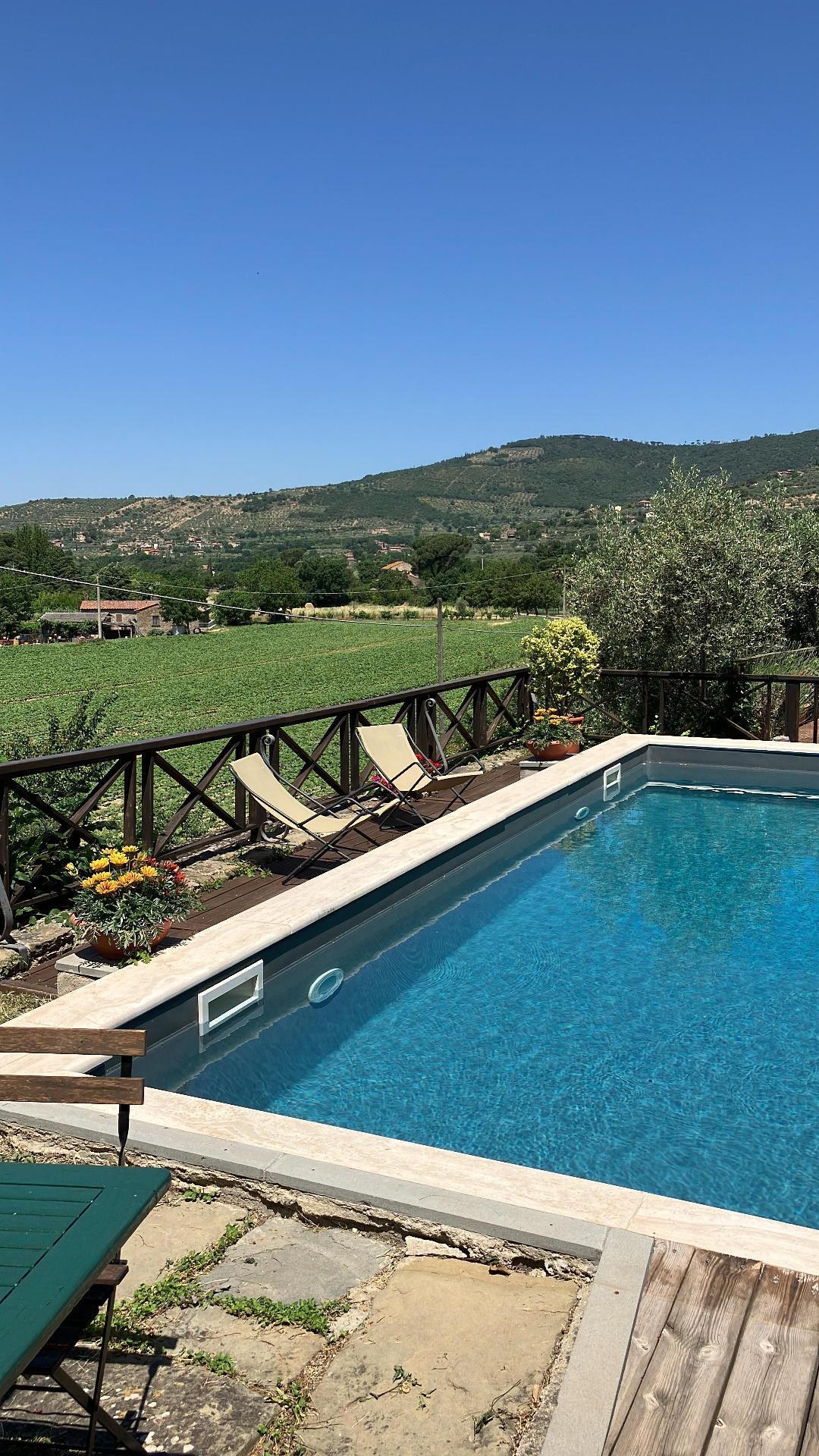 From the entrance door, on the left-hand side there is access to the sitting room with fireplace while on the right-hand side there is access to the Sala della Pastaia whose name derives from an old piece of furniture which today contains various objects but which was used to dry pasta! Today it is a large and spacious dining room where guests can spend moments of convivial serenity Also on the ground floor is a new and comfortable kitchen equipped with everything a good chef would wish to have as tools of the trade.A staircase made of pietra serena, typical of the Cortona area, leads to the first floor where the sleeping area is accessed. Each room has been created following a different theme that differentiates them from one another. At the back of the house, surrounded by greenery and olive trees, is the private swimming pool. Sheltered from prying eyes and not visible from the entrance, the particular position chosen guarantees plenty of sunshine, peace and intimacy. The flooring used for the exterior is teak, which does not heat up in the sun and allows you to walk barefoot or sit on the edge or on the ground without the danger of getting burnt.