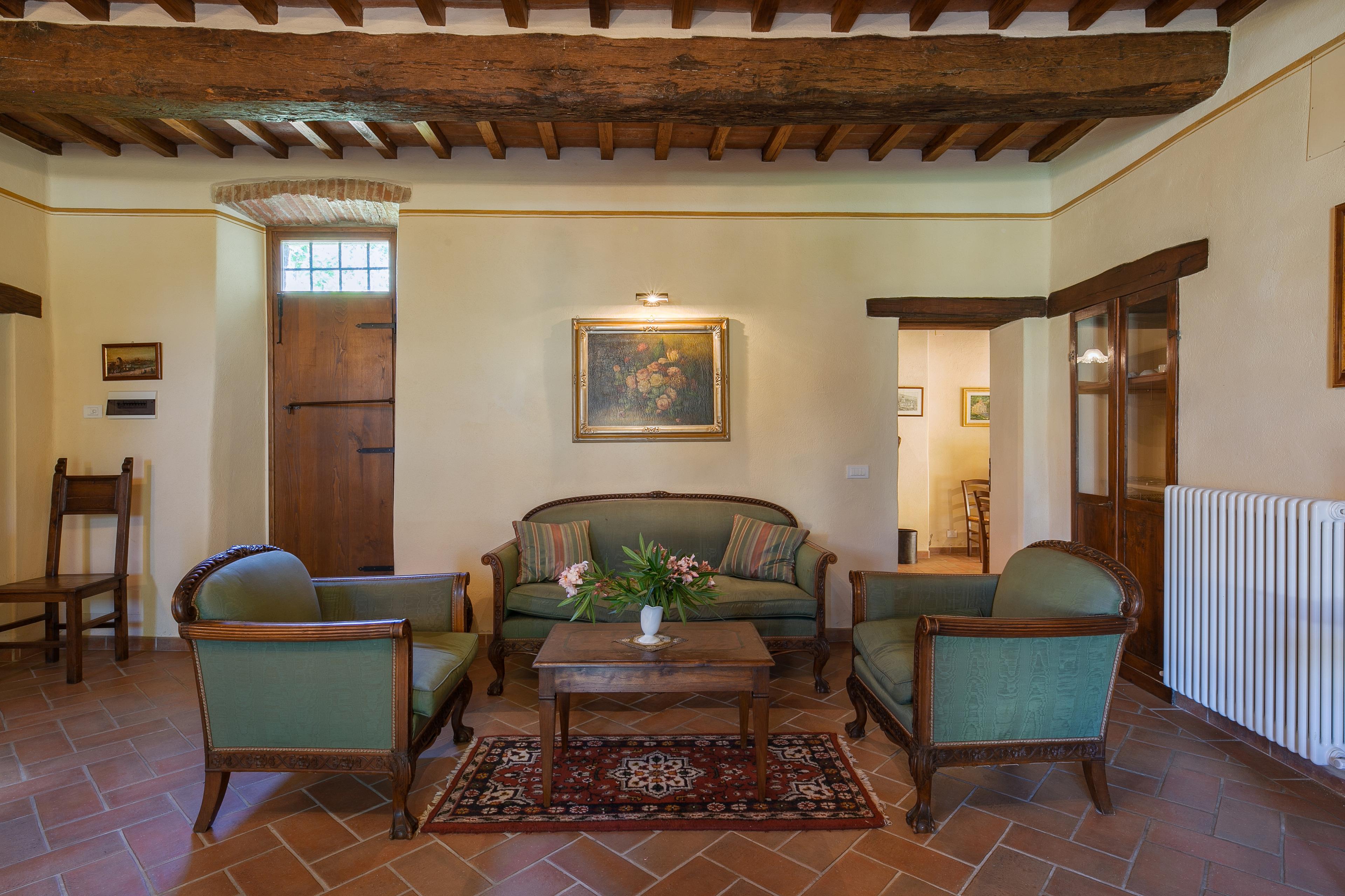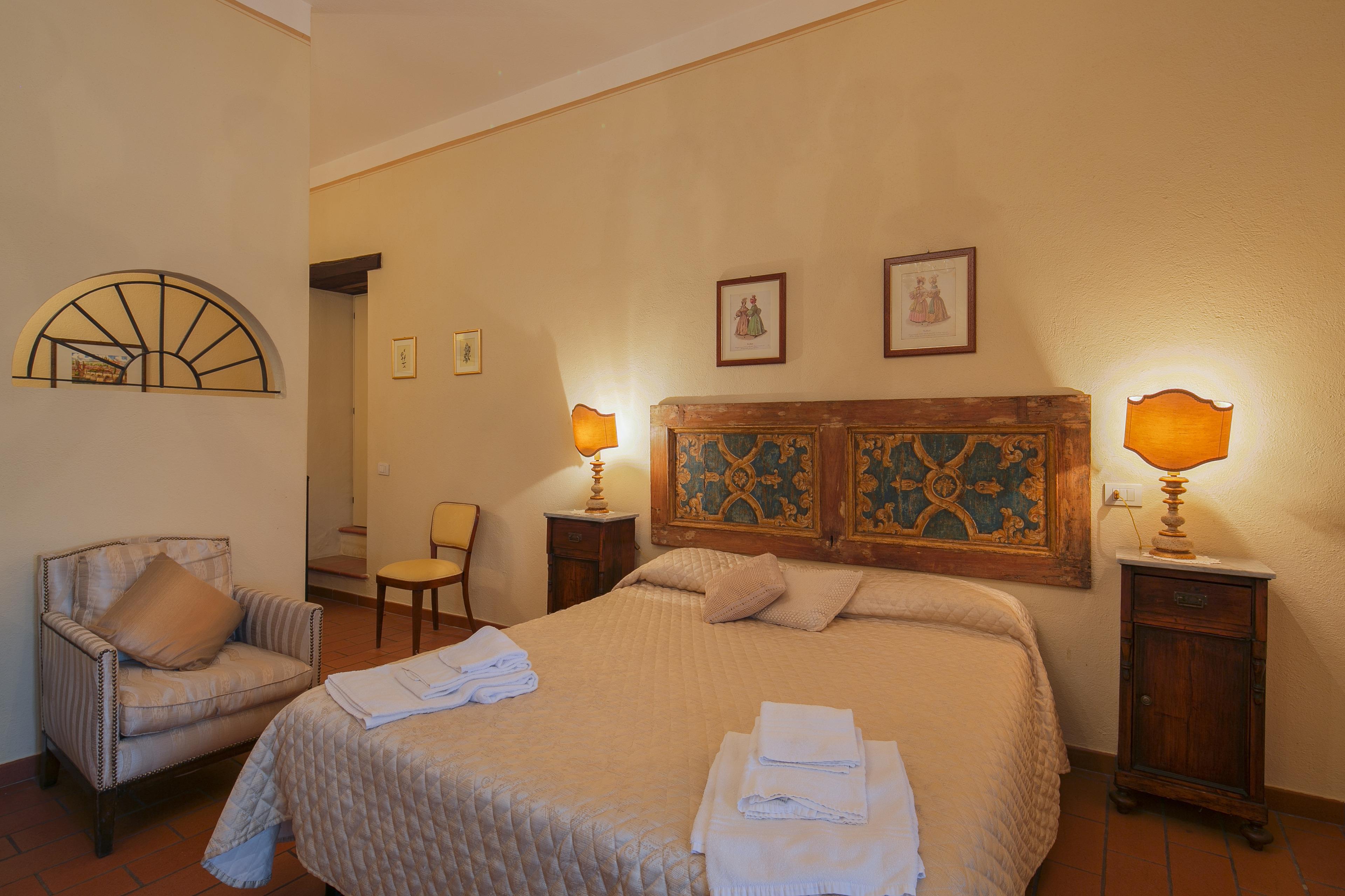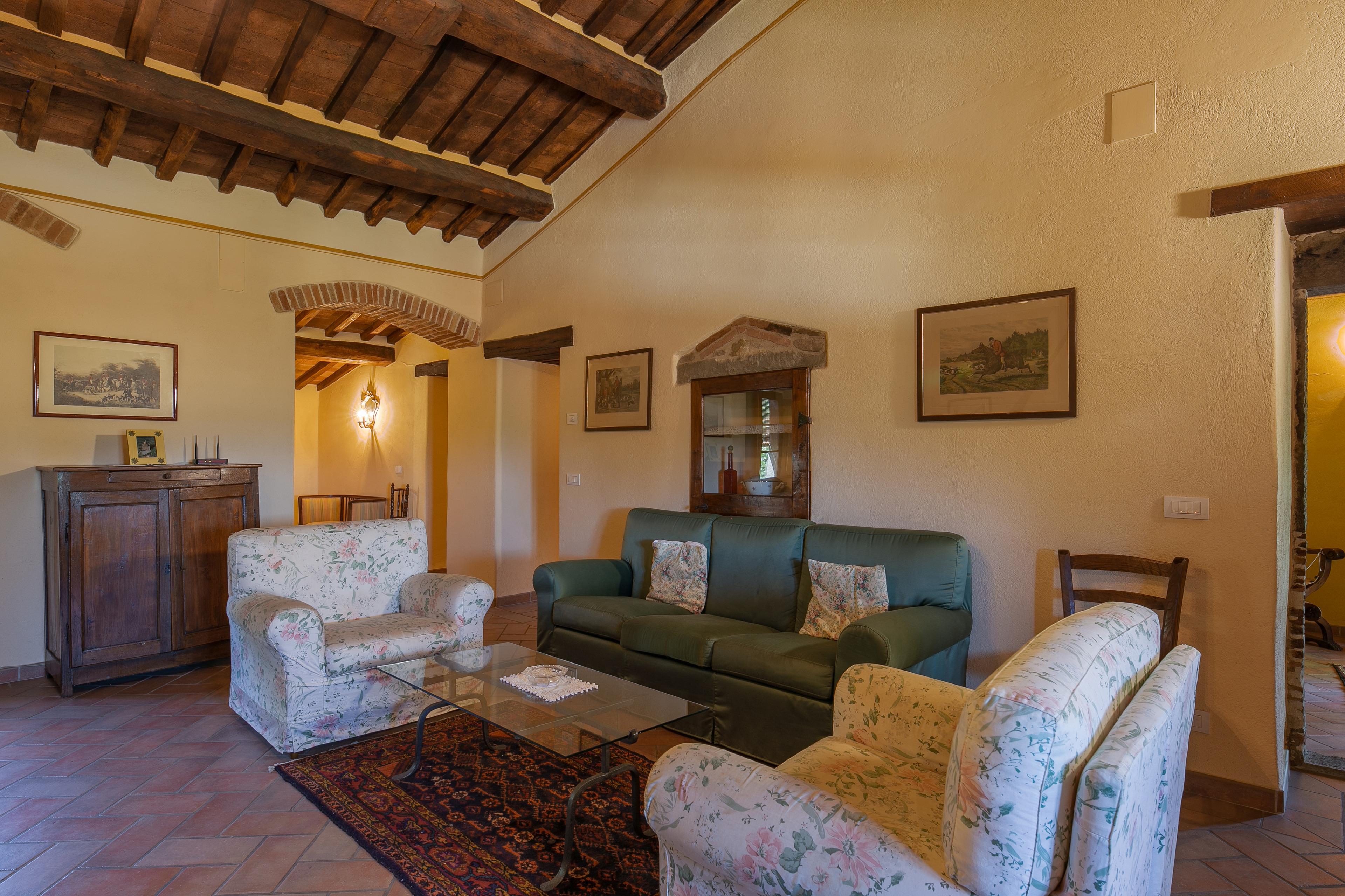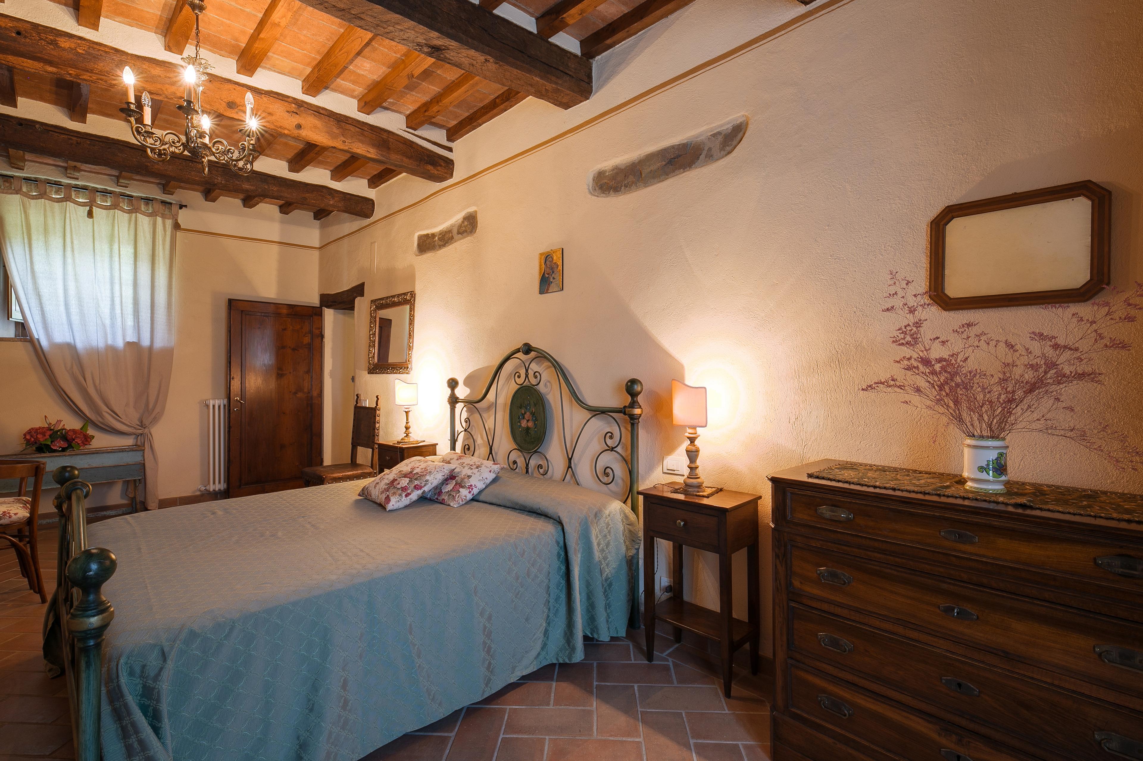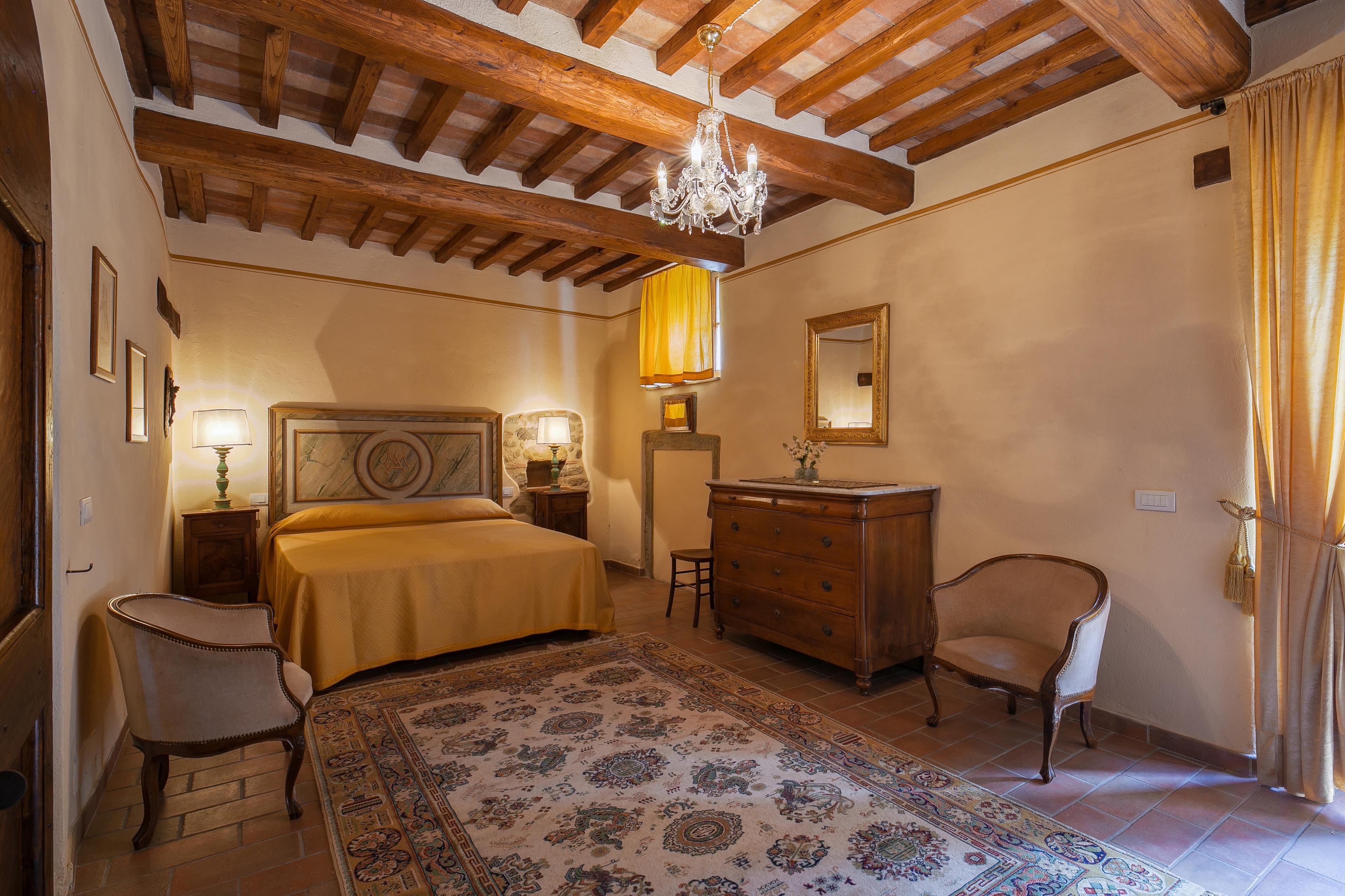 Die Innenräume der Villa il Gelso sind im toskanischen Stil gehalten: Terrakottaböden und freiliegende Holzbalken charakterisieren die Umgebung und geben uns einen Einblick in die toskanische Architektur. Die Villa ist groß (etwa 400 Quadratmeter insgesamt) und auf zwei Ebenen durch eine Außentreppe verbunden unterteilt. Sie kann bequem 16 Personen beherbergen und verfügt über Hochstühle und Kinderbetten (auch auf Anfrage). Ursprünglich in Appartements aufgeteilt, wird die Villa il Gelso heute als exklusiver Wohnblock vermietet, behält aber eine Unterteilung bei, die es sowohl Familien als auch Freundesgruppen ermöglicht, einen gemeinsamen Aufenthalt zu verbringen und gleichzeitig den verschiedenen Gruppen ihre Unabhängigkeit zu lassen. Sie verfügt über 8 Schlafzimmer und 8 Bäder und eine große, voll ausgestattete Küche im Erdgeschoss mit Wohnzimmer, das zum Treffpunkt der ganzen Gruppe im Namen der Geselligkeit wird.