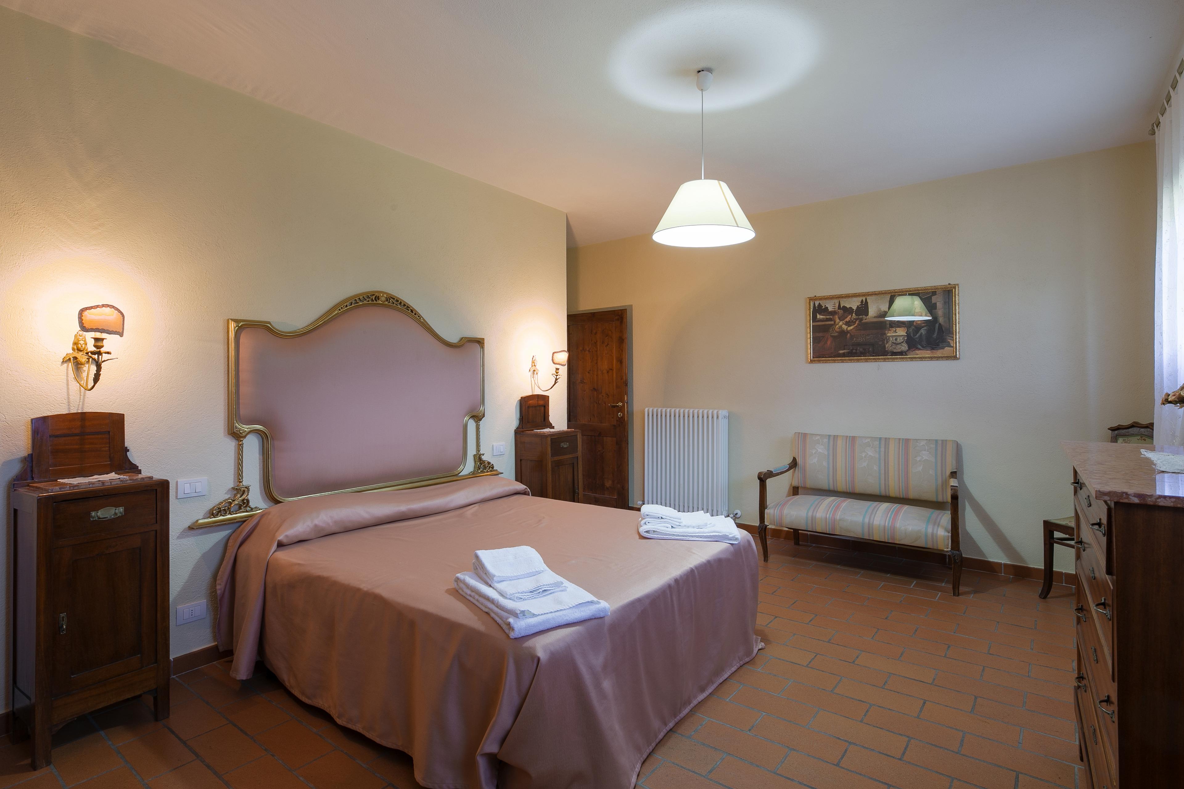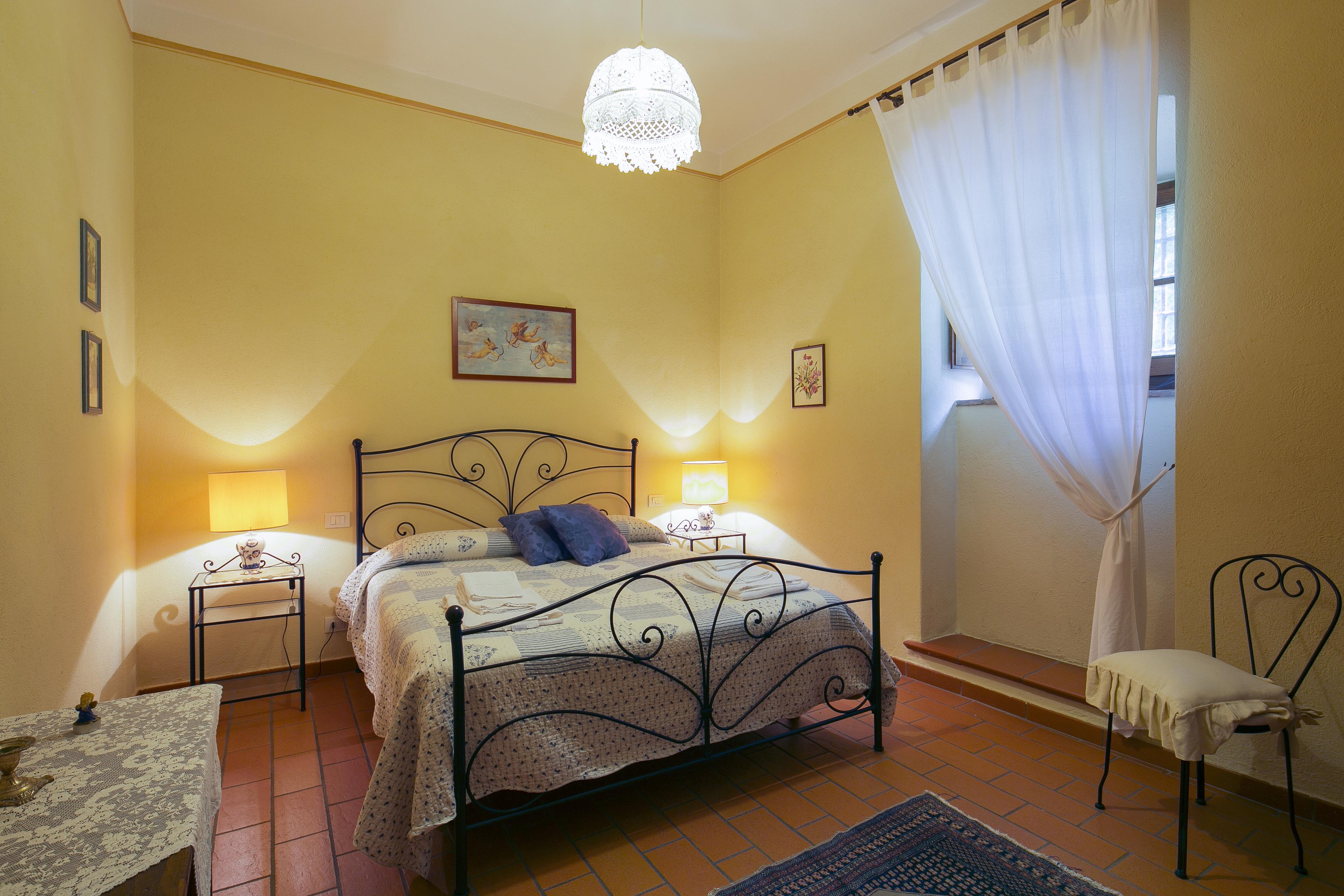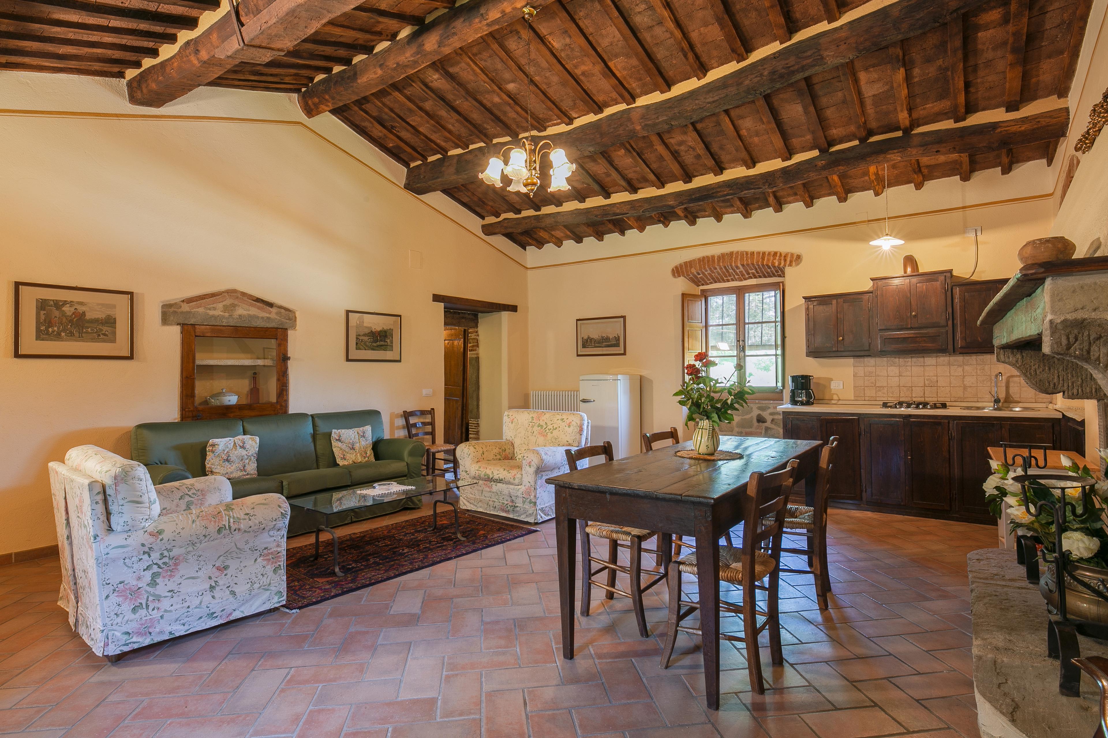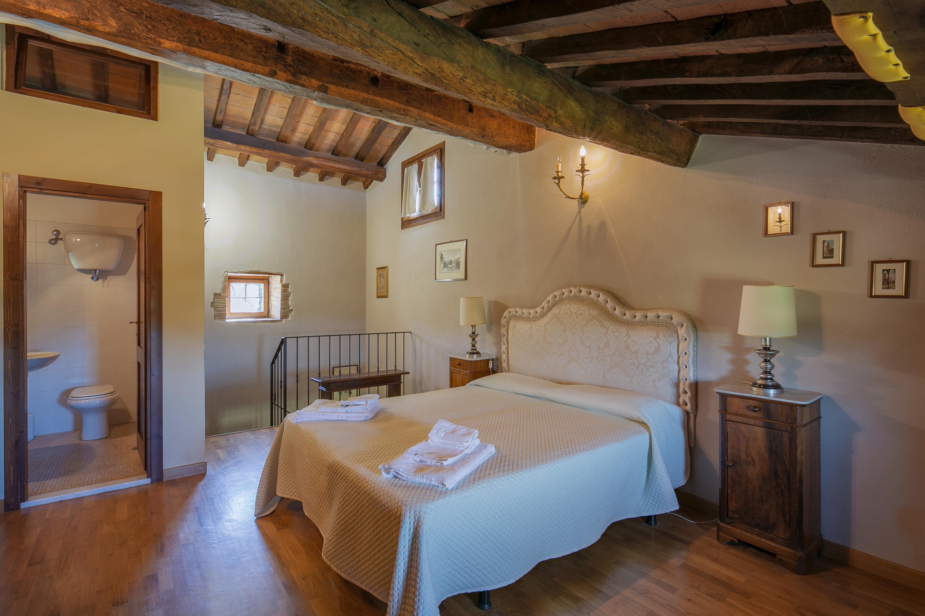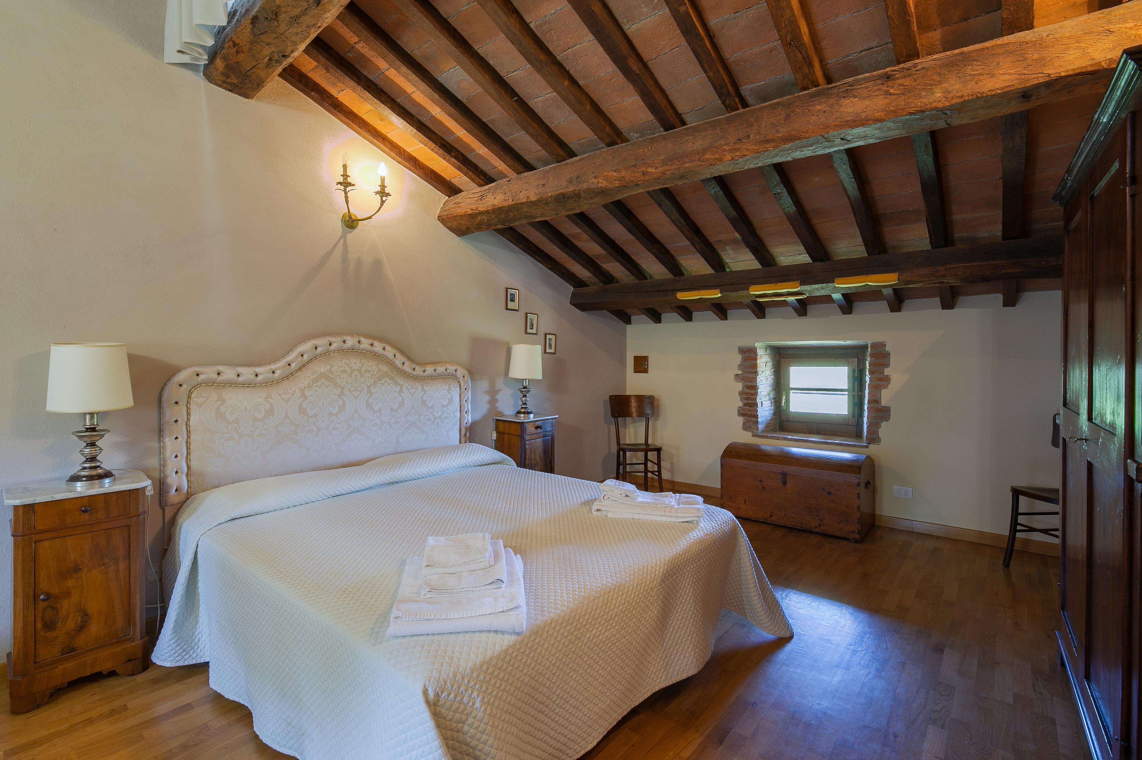 Die Innenräume der Villa il Gelso sind im toskanischen Stil gehalten: Terrakottaböden und freiliegende Holzbalken charakterisieren die Umgebung und geben uns einen Einblick in die toskanische Architektur. Die Villa ist groß (etwa 400 Quadratmeter insgesamt) und auf zwei Ebenen durch eine Außentreppe verbunden unterteilt. Sie kann bequem 16 Personen beherbergen und verfügt über Hochstühle und Kinderbetten (auch auf Anfrage). Ursprünglich in Appartements aufgeteilt, wird die Villa il Gelso heute als exklusiver Wohnblock vermietet, behält aber eine Unterteilung bei, die es sowohl Familien als auch Freundesgruppen ermöglicht, einen gemeinsamen Aufenthalt zu verbringen und gleichzeitig den verschiedenen Gruppen ihre Unabhängigkeit zu lassen. Sie verfügt über 8 Schlafzimmer und 8 Bäder und eine große, voll ausgestattete Küche im Erdgeschoss mit Wohnzimmer, das zum Treffpunkt der ganzen Gruppe im Namen der Geselligkeit wird.
