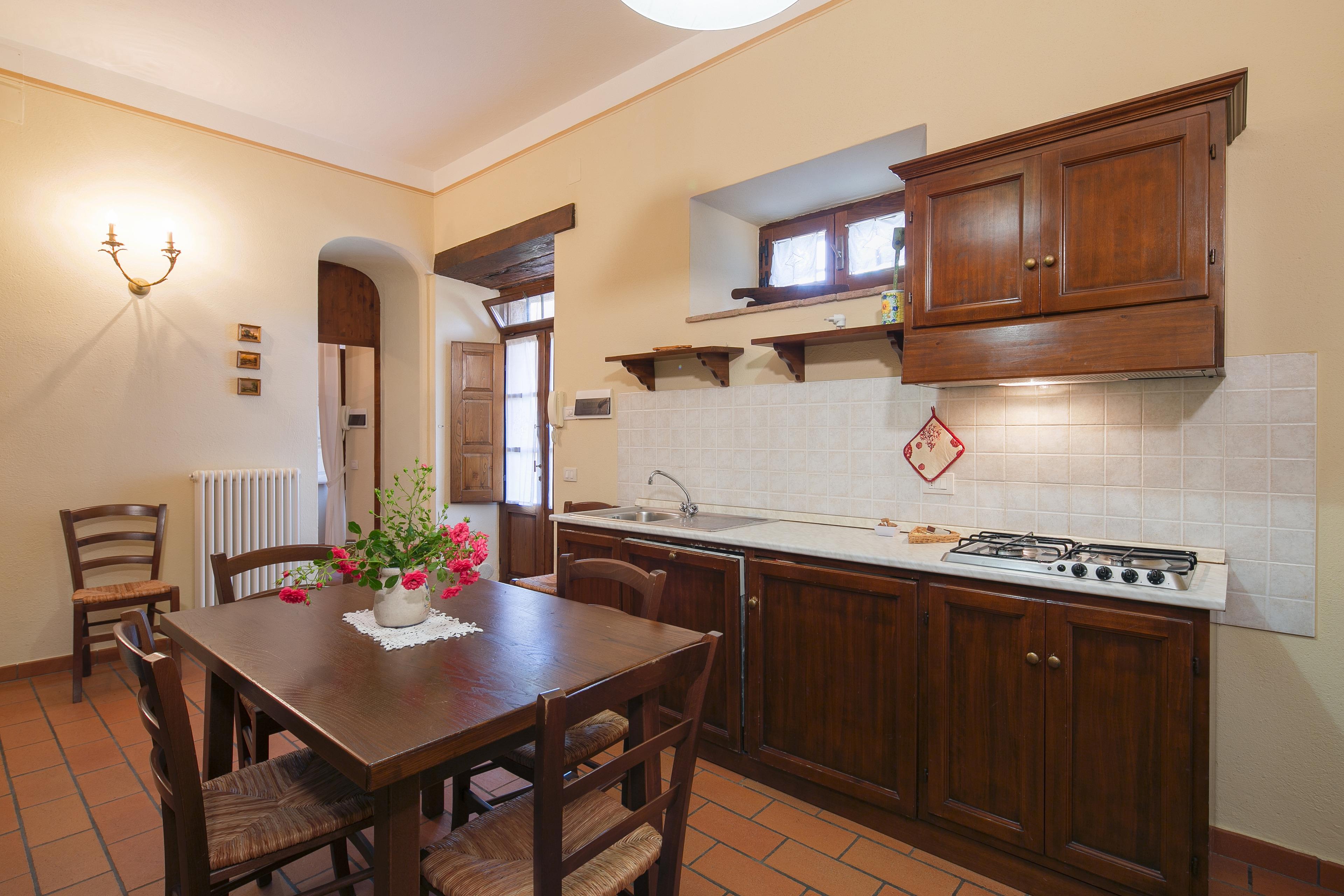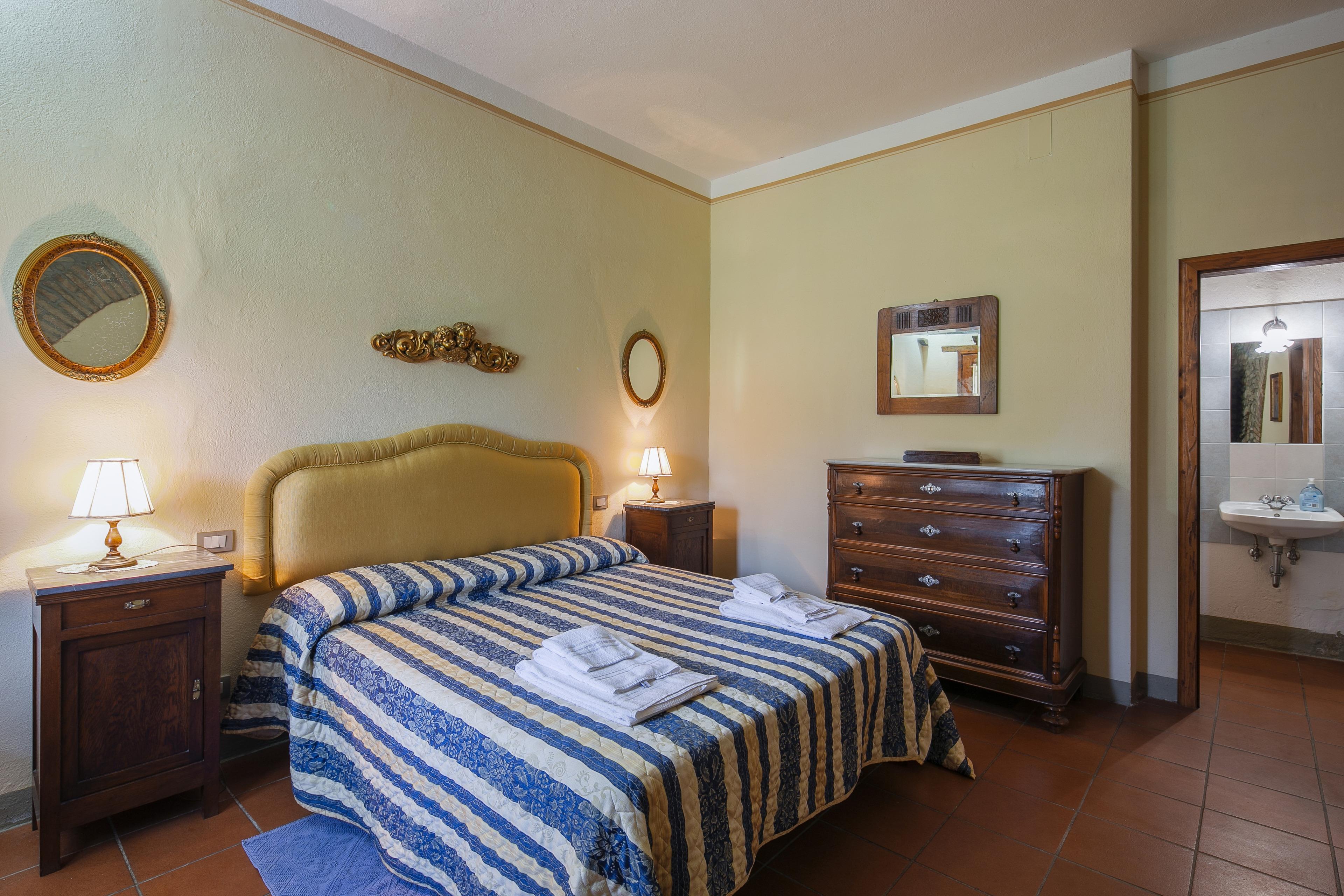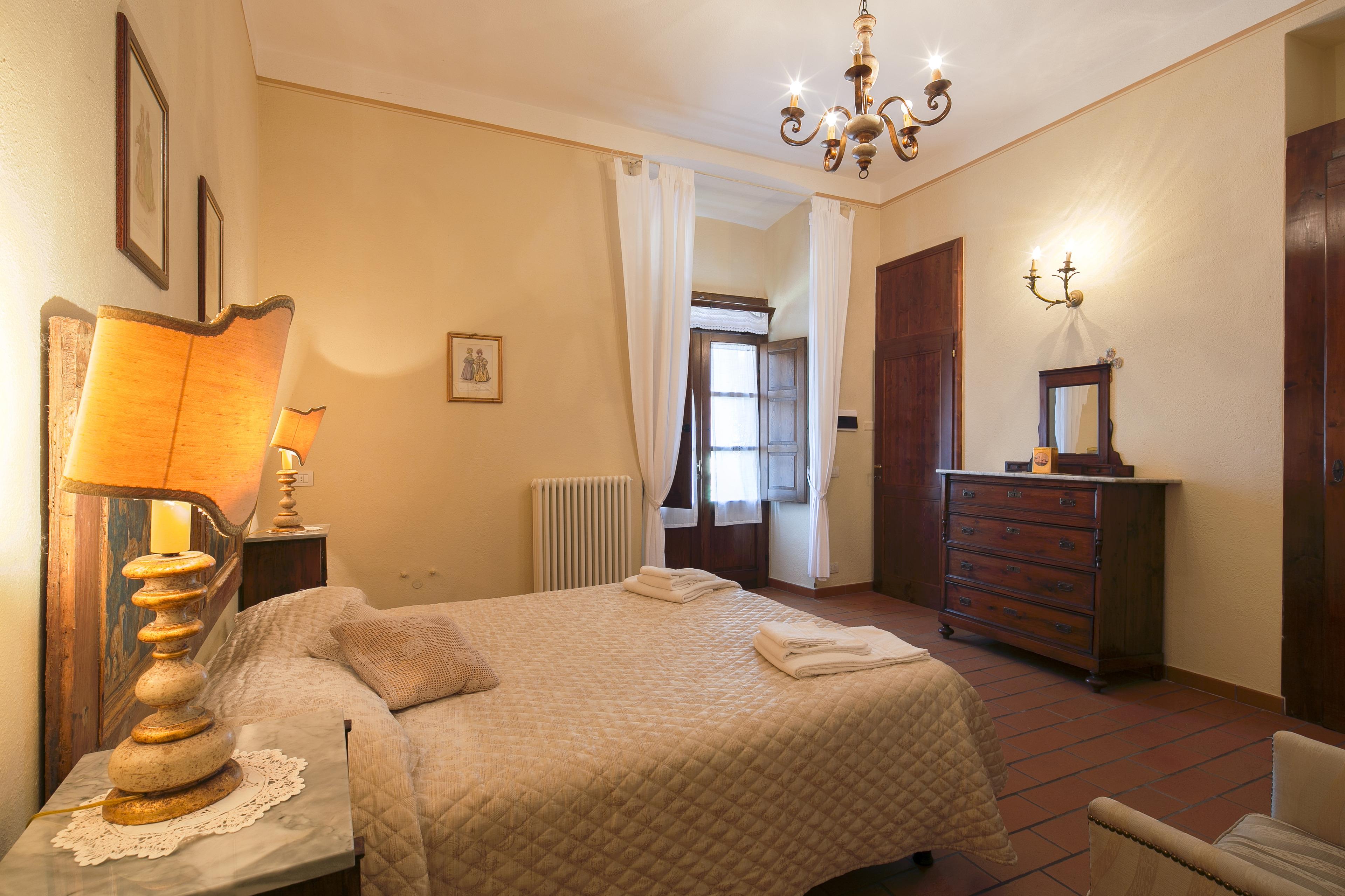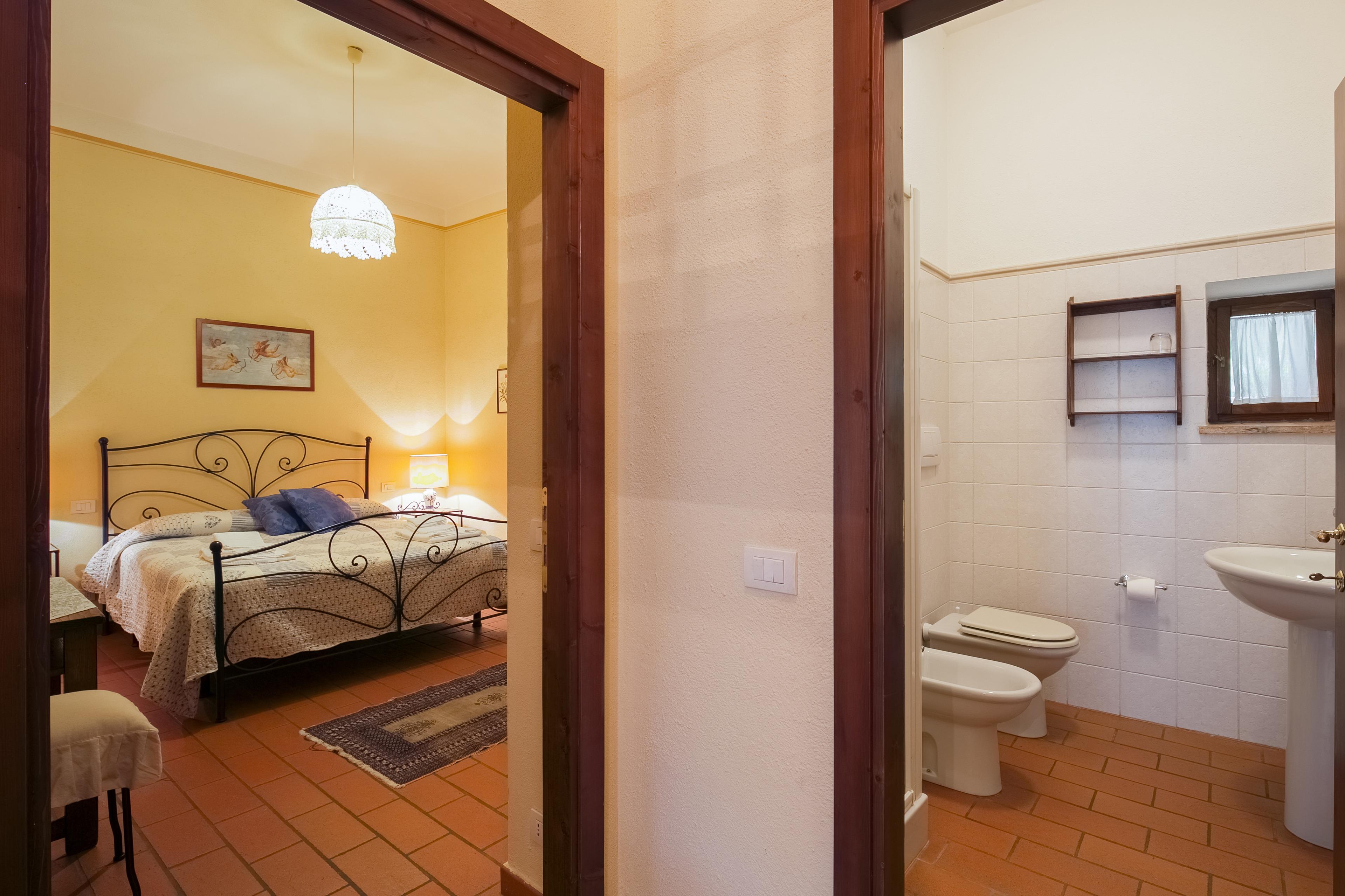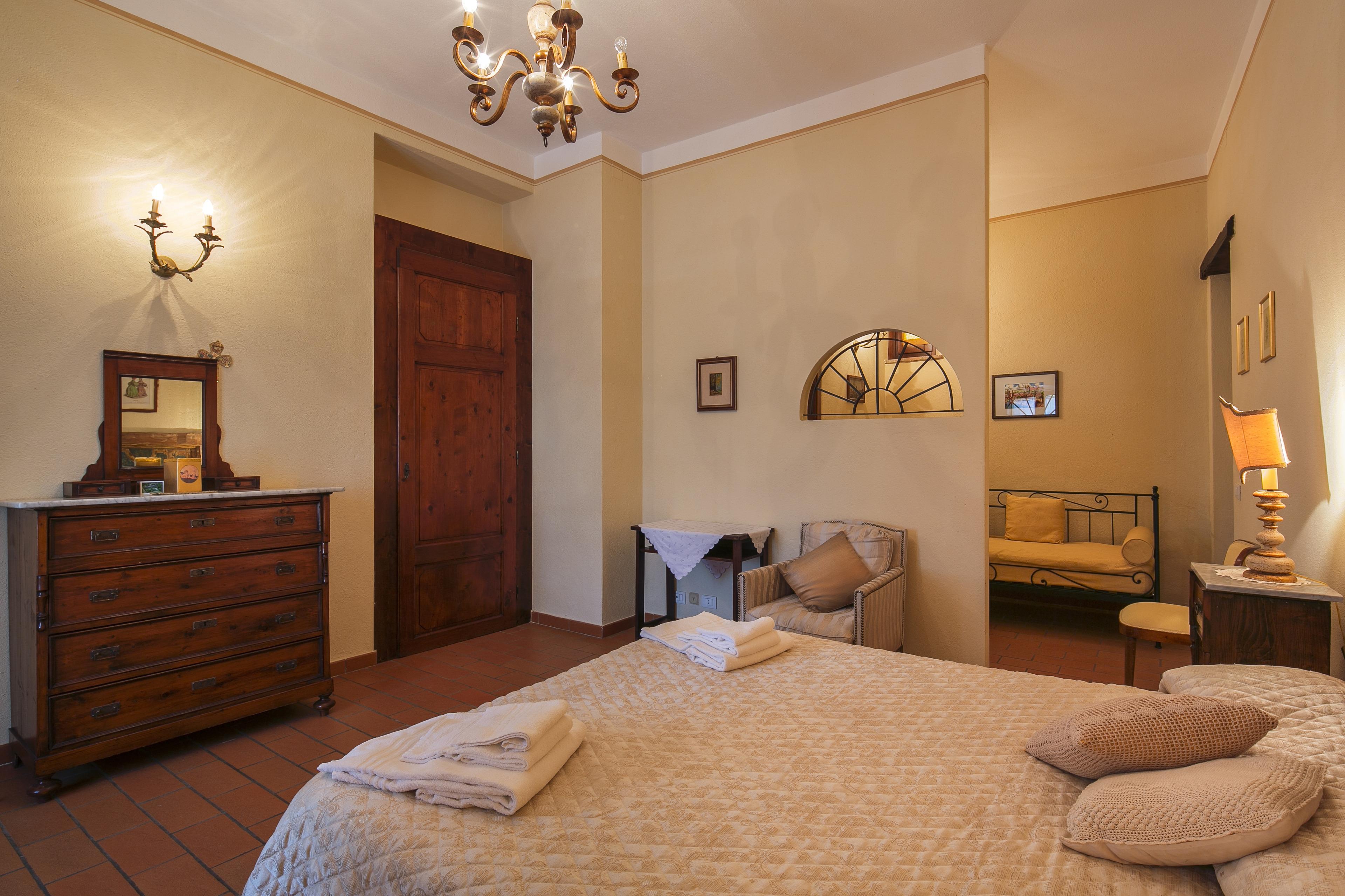 Die Innenräume der Villa il Gelso sind im toskanischen Stil gehalten: Terrakottaböden und freiliegende Holzbalken charakterisieren die Umgebung und geben uns einen Einblick in die toskanische Architektur. Die Villa ist groß (etwa 400 Quadratmeter insgesamt) und auf zwei Ebenen durch eine Außentreppe verbunden unterteilt. Sie kann bequem 16 Personen beherbergen und verfügt über Hochstühle und Kinderbetten (auch auf Anfrage). Ursprünglich in Appartements aufgeteilt, wird die Villa il Gelso heute als exklusiver Wohnblock vermietet, behält aber eine Unterteilung bei, die es sowohl Familien als auch Freundesgruppen ermöglicht, einen gemeinsamen Aufenthalt zu verbringen und gleichzeitig den verschiedenen Gruppen ihre Unabhängigkeit zu lassen. Sie verfügt über 8 Schlafzimmer und 8 Bäder und eine große, voll ausgestattete Küche im Erdgeschoss mit Wohnzimmer, das zum Treffpunkt der ganzen Gruppe im Namen der Geselligkeit wird.