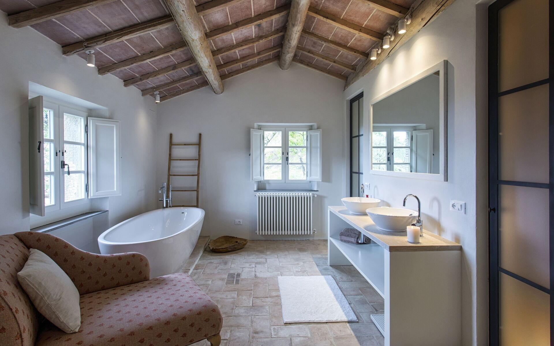 Wenn Sie die Treppe in den ersten Stock hinaufsteigen, gelangen Sie in den Schlafbereich: Sie werden von dem ersten der drei Schlafzimmer überrascht sein, einer schönen Suite mit Doppelbett, Chaiselongue und offener Badewanne im Zimmer, wo Sie Momente der völligen Entspannung verbringen können. Das Zimmer verfügt auch über ein Doppelwaschbecken, das gut sichtbar ist. Die Toilette und die Dusche sind durch Türen getrennt.